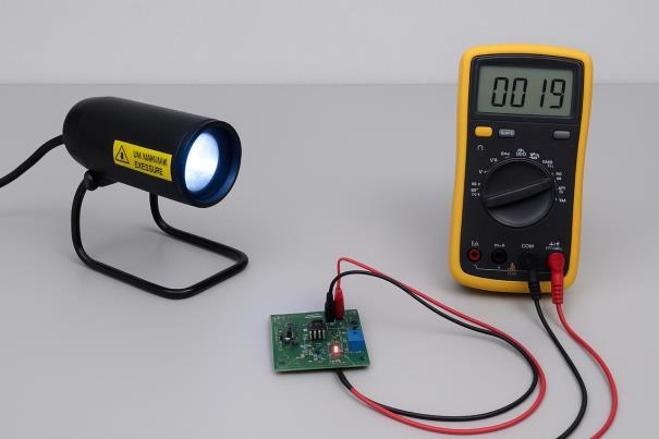 Figure 3. ExperimentalsetupforcircuittestingThisfigure showsthesetupusedfortestingtheUVdetectioncircuitry. The calibrated UV lamp provided a source of controlled radiation, while the digital multimeter measured output voltages that corresponded to different intensities of UV radiation. The setup validated the comparator's response accuracyandsensorsensitivityundervariousconditionsof lightexposure.
