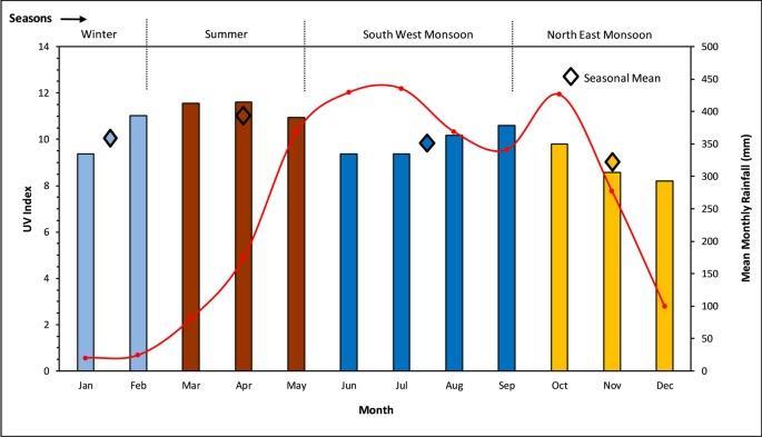 ThisfigureillustratestheamountofUVlightwhatwecallthe UltravioletIndex(UVI) inKerala doesn'tstaythesame all year;itchangesquiteabitwiththeseasons.Wenoticedthat SummeriswhentheUVIishighest.Thismakesperfectsense because the sun is strongest then, and there aren't many cloudsinthewaytoblockit.ContrastthatwiththeMonsoon