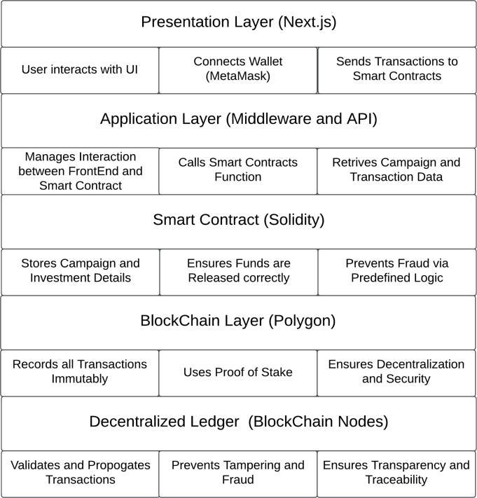 Theplatformisdesignedusingathree-layeredarchitecture,ensuringseamlessinteractionbetweenusers,smartcontracts, andtheblockchain.ThesystemconsistsofthePresentationLayer,ApplicationLayer,andBlockchainLayer,eachplayinga crucialroleinmaintainingsecurity,transparency,andefficiency.