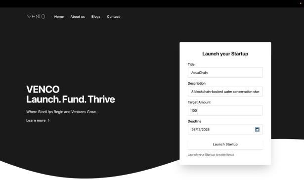 Abstract - Traditional startup funding platforms often face challenges such as high transaction fees, centralized control, and limited transparency. This project introduces VENCO, a blockchain-based decentralized application (DApp) that enables users to invest directly in early-stage startups they find promising. Built using Next.js for an interactive user experience and Solidity for smart contract development, the platform operates on the Polygon blockchain to ensure scalable, low-cost transactions. MetaMask integration allows for secure wallet connectivity, while Ethereum-based smart contracts automate the investment process letting startup founders set funding goals and terms. Investors contribute based on their own interest and conviction, and funds are disbursed only when predefined milestones are met, minimizing the risk of fund mismanagement. By removing intermediaries and ensuring transparency, VENCO creates a secure and efficient environment for decentralized startup funding.