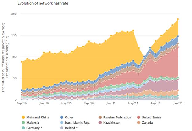 This feature of the industry was starkly demonstrated when in 2021 the Chinese government banned cryptocurrency mining in the country Up until that point, China had been the largest contributor to the global Bitcoin hash rate i.e. the total combined computational power that is being used to process transactions to complete a proof of work by all the miners on the Bitcoin network
