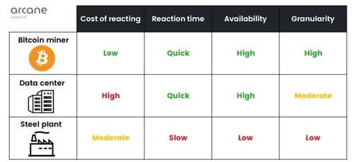 It all comes down to Bitcoin mining's uniqueness as an interruptible load that is a feature of its Proof of Work consensus protocol we described earlier Arcane Research describes four factors that make a load interruptible, comparing bitcoin mining's score with that of two other energyintensive consumers: A conventional data centre and a steel plant.