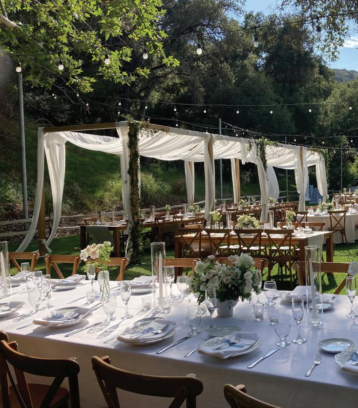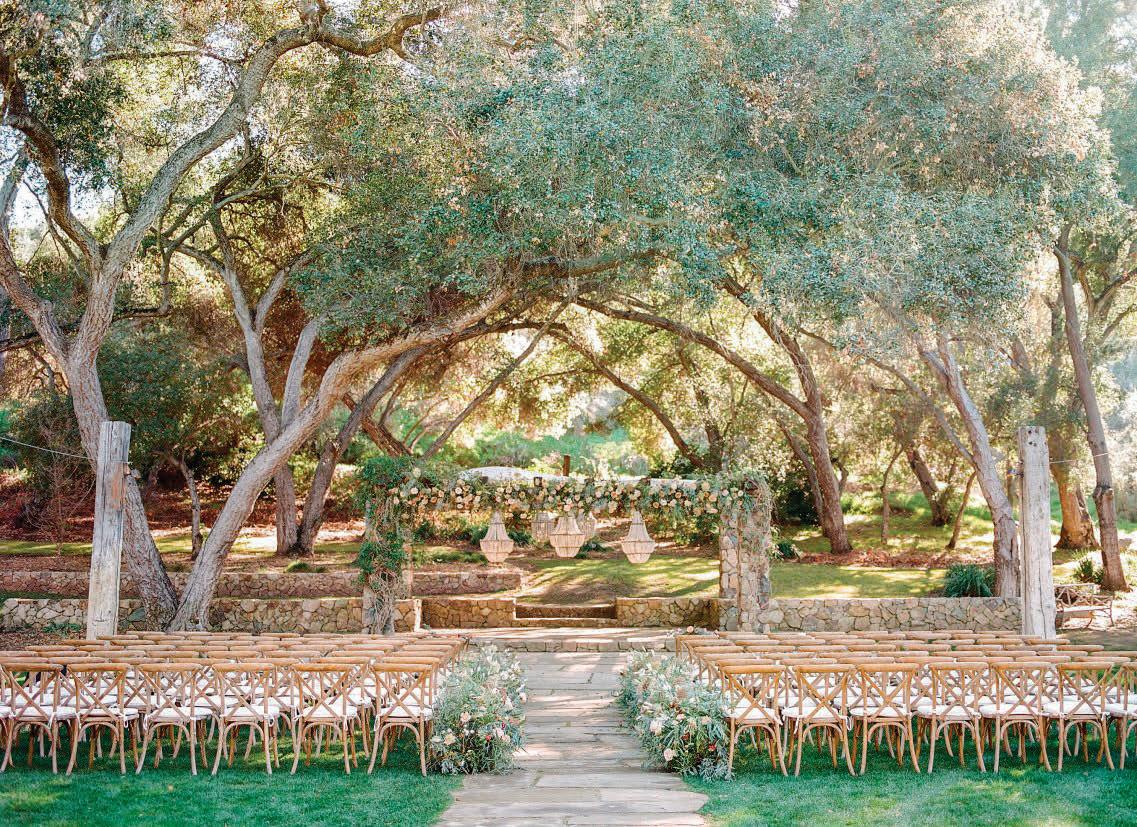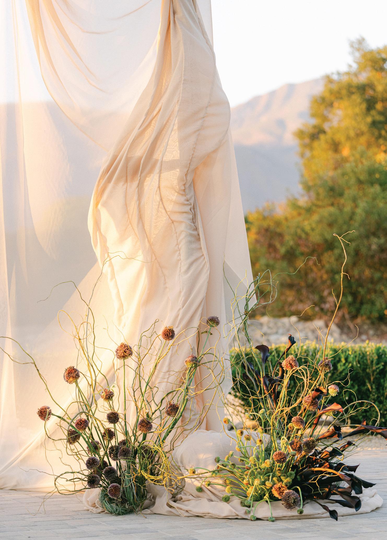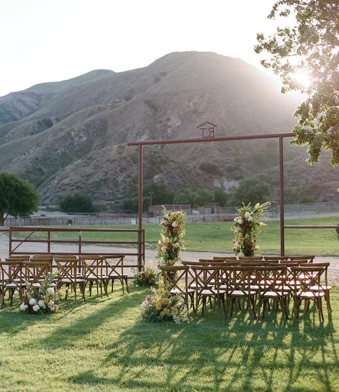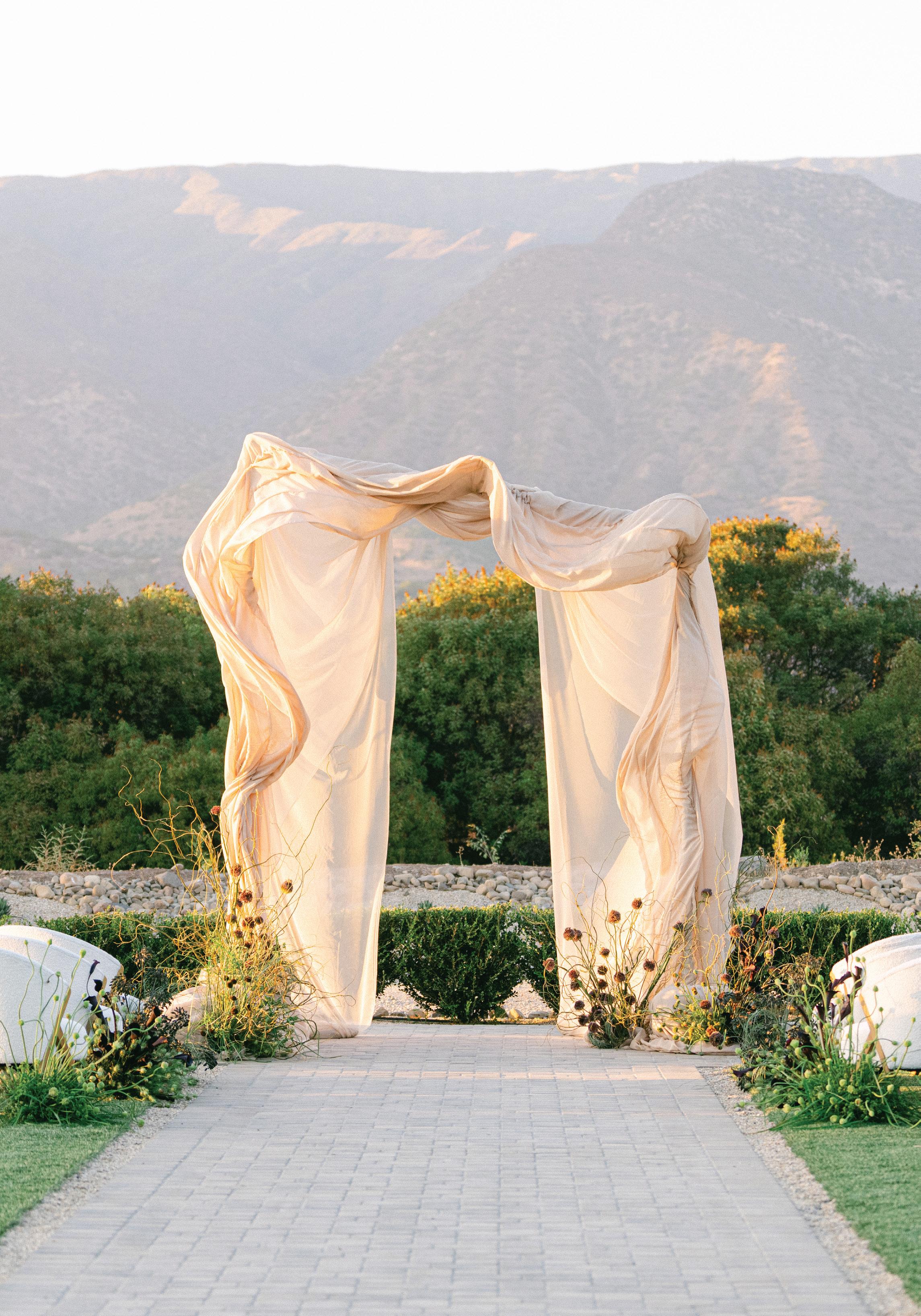 Led by the incredible team at Kristin Banta Events, we took on the challenge of designing a one-of-a-kind ceremony altar at Ojai’s newest venue, Topa Vista. Together with Orla Floral Studio, KBE created from scratch a diaphanous fabric structure that perfectly framed the Topatopa Mountains as dusk painted the skyline in a rose-colored palette (page 72).