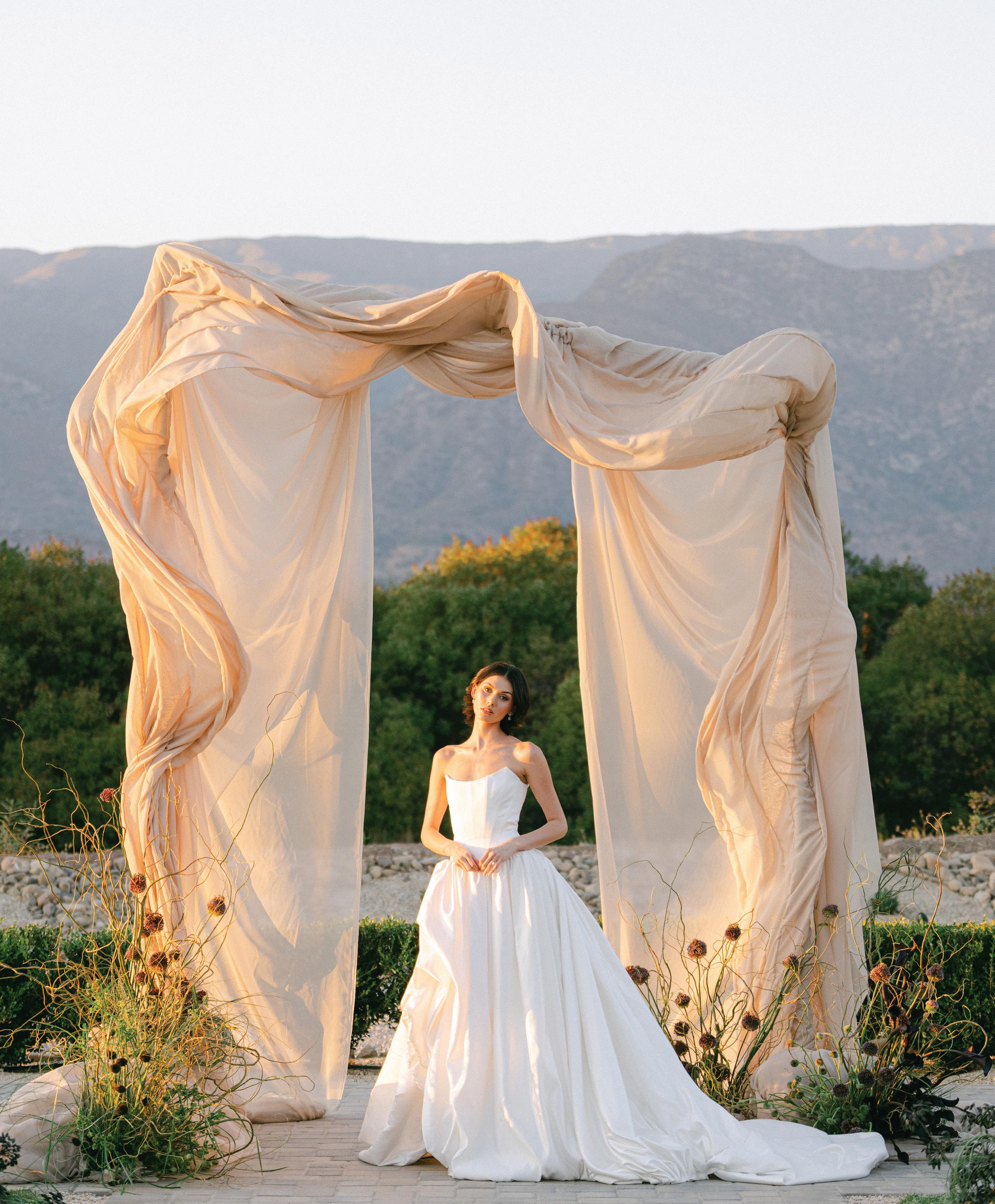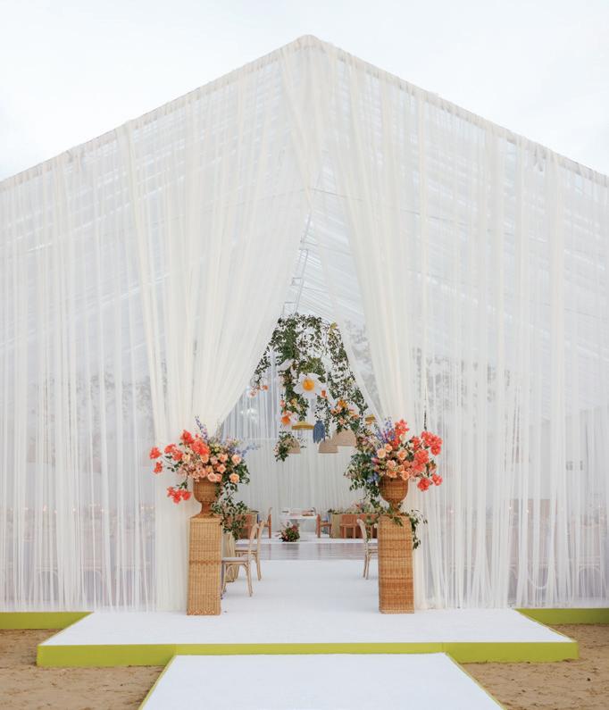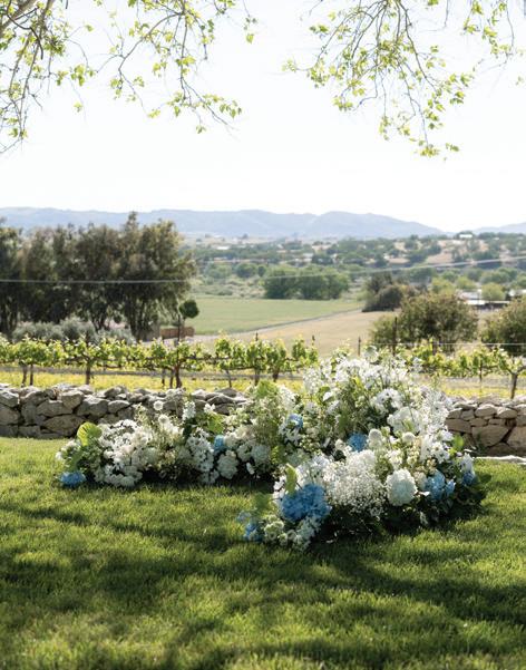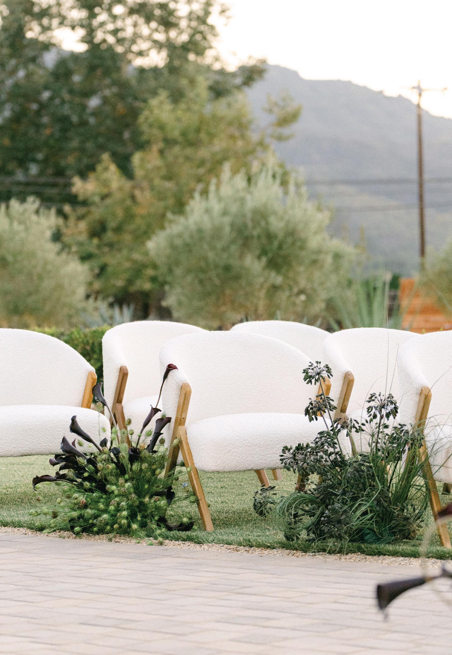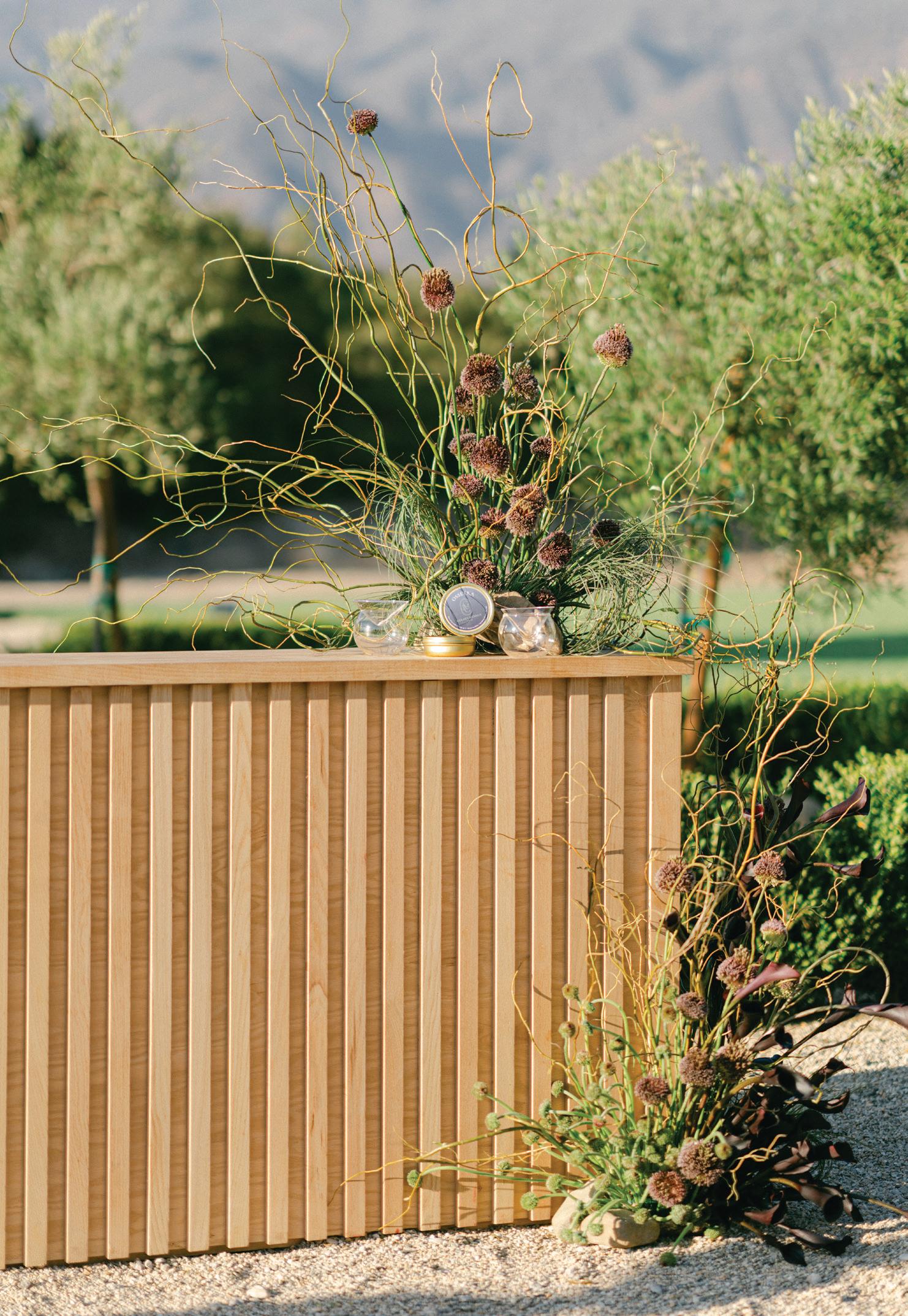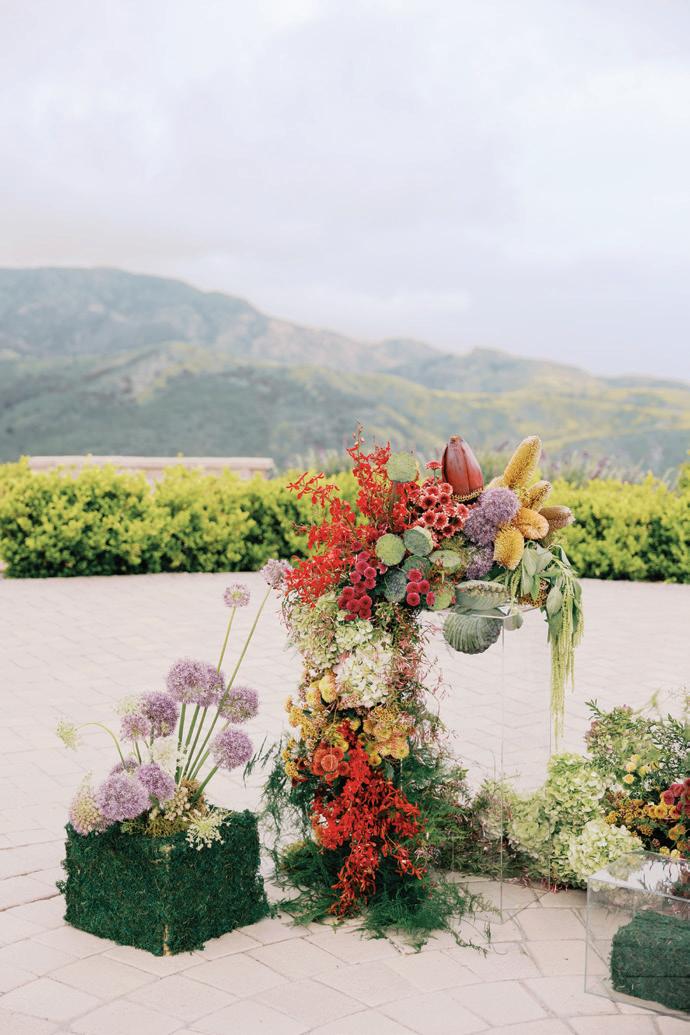Led by the incredible team at Kristin Banta Events, we took on the challenge of designing a one-of-a-kind ceremony altar at Ojai’s newest venue, Topa Vista. Together with Orla Floral Studio, KBE created from scratch a diaphanous fabric structure that perfectly framed the Topatopa Mountains as dusk painted the skyline in a rose-colored palette (page 72).