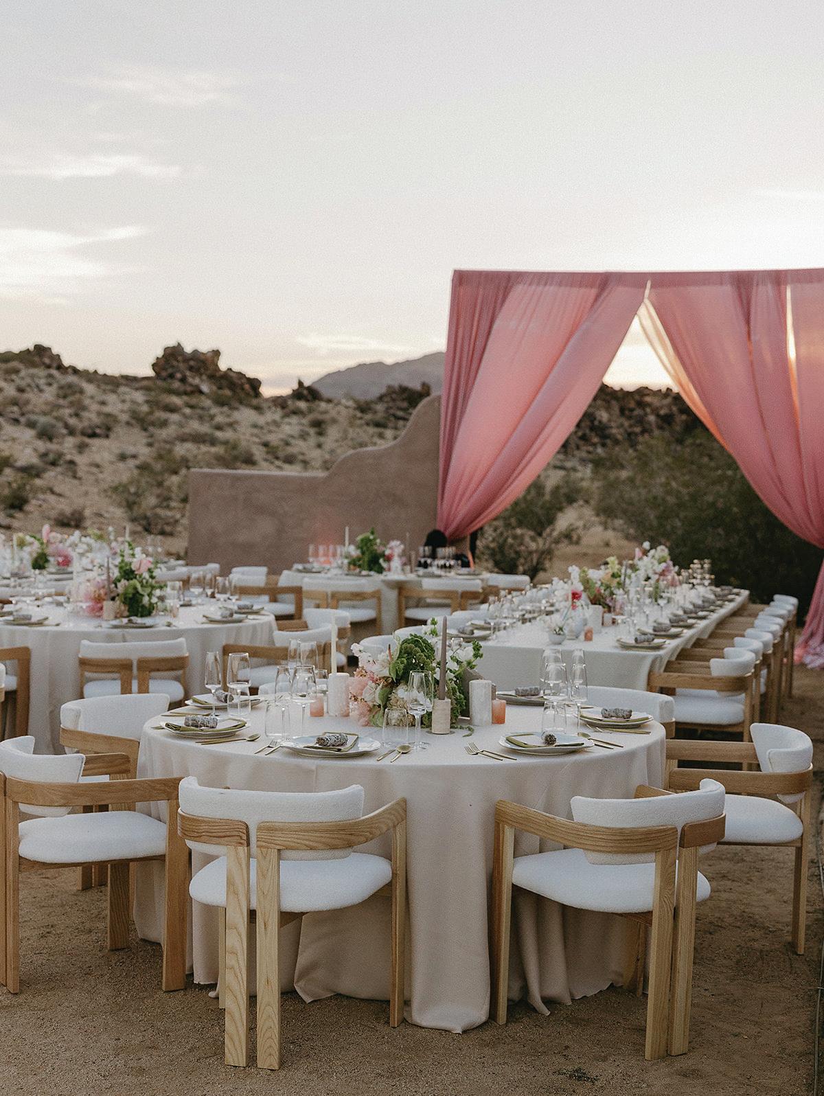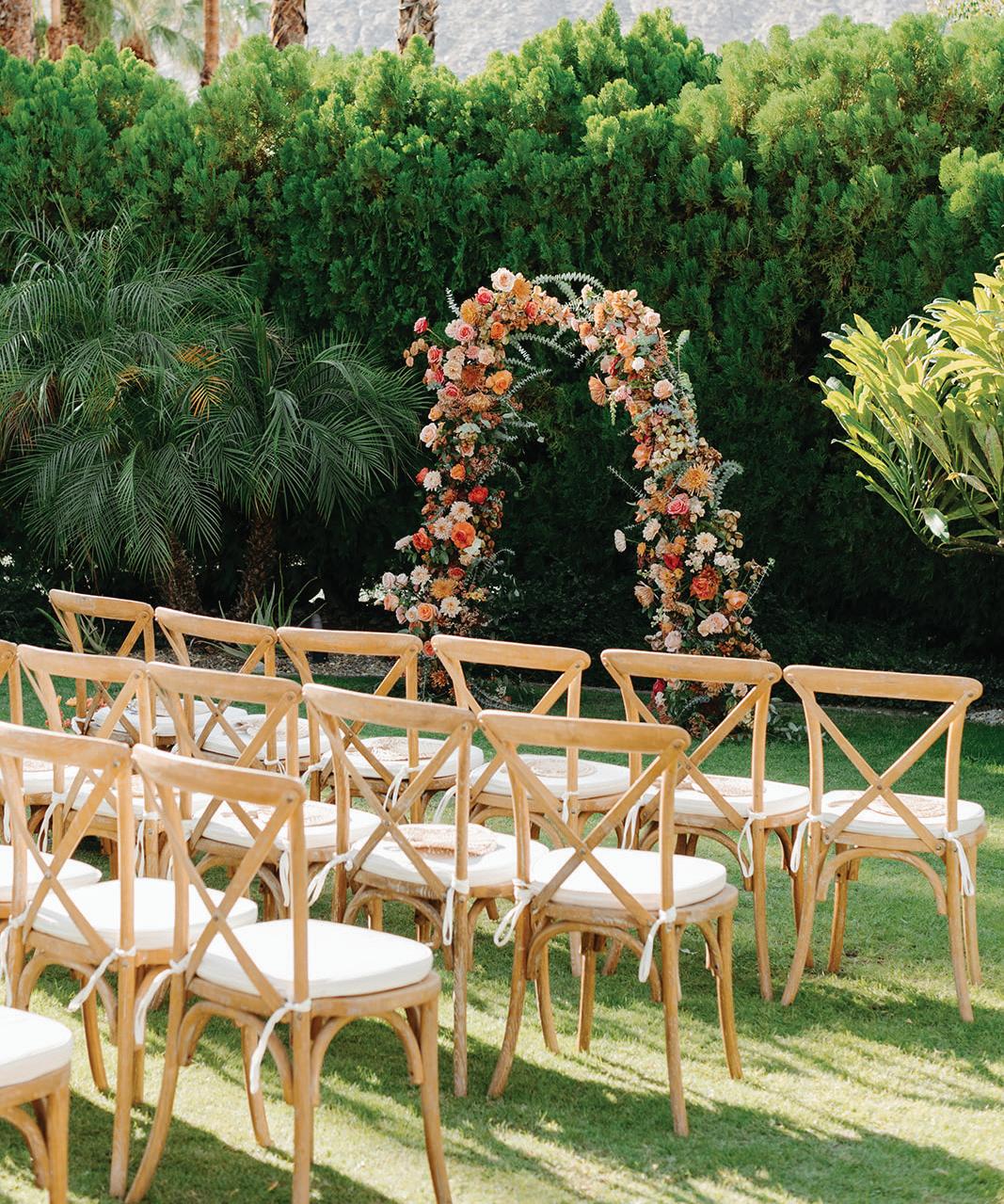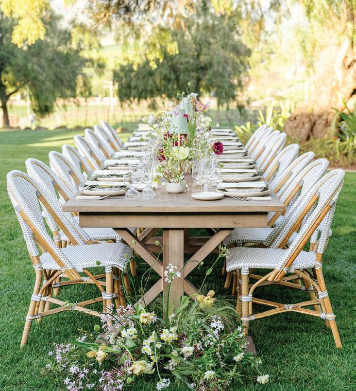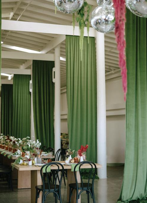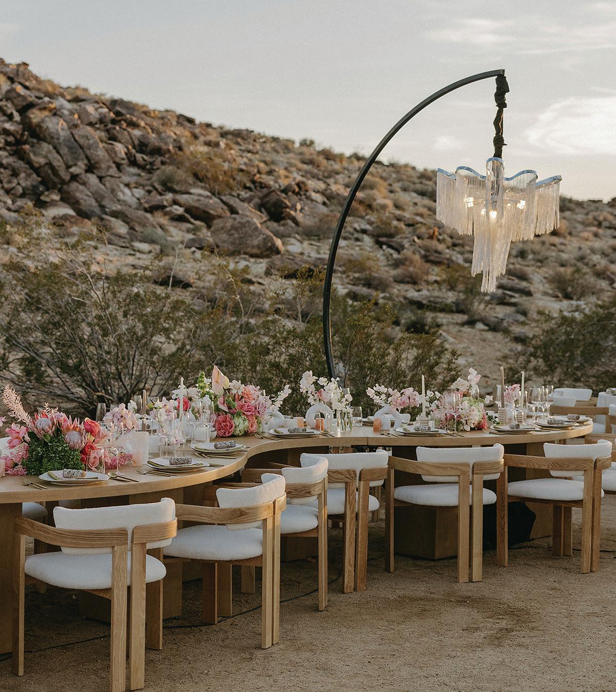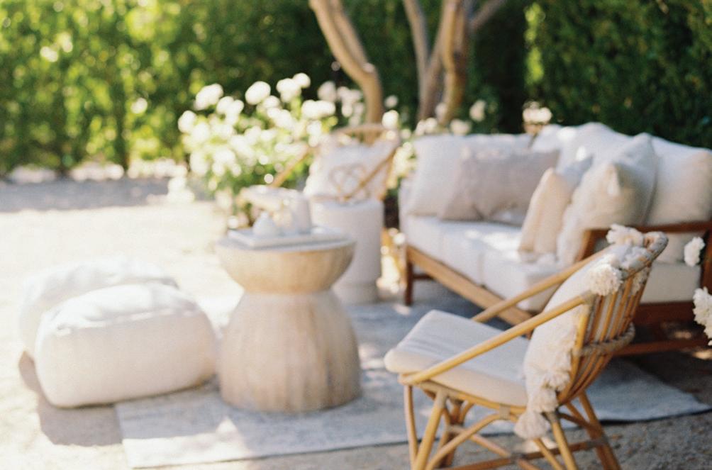 Led by the incredible team at Kristin Banta Events, we took on the challenge of designing a one-of-a-kind ceremony altar at Ojai’s newest venue, Topa Vista. Together with Orla Floral Studio, KBE created from scratch a diaphanous fabric structure that perfectly framed the Topatopa Mountains as dusk painted the skyline in a rose-colored palette (page 72).
