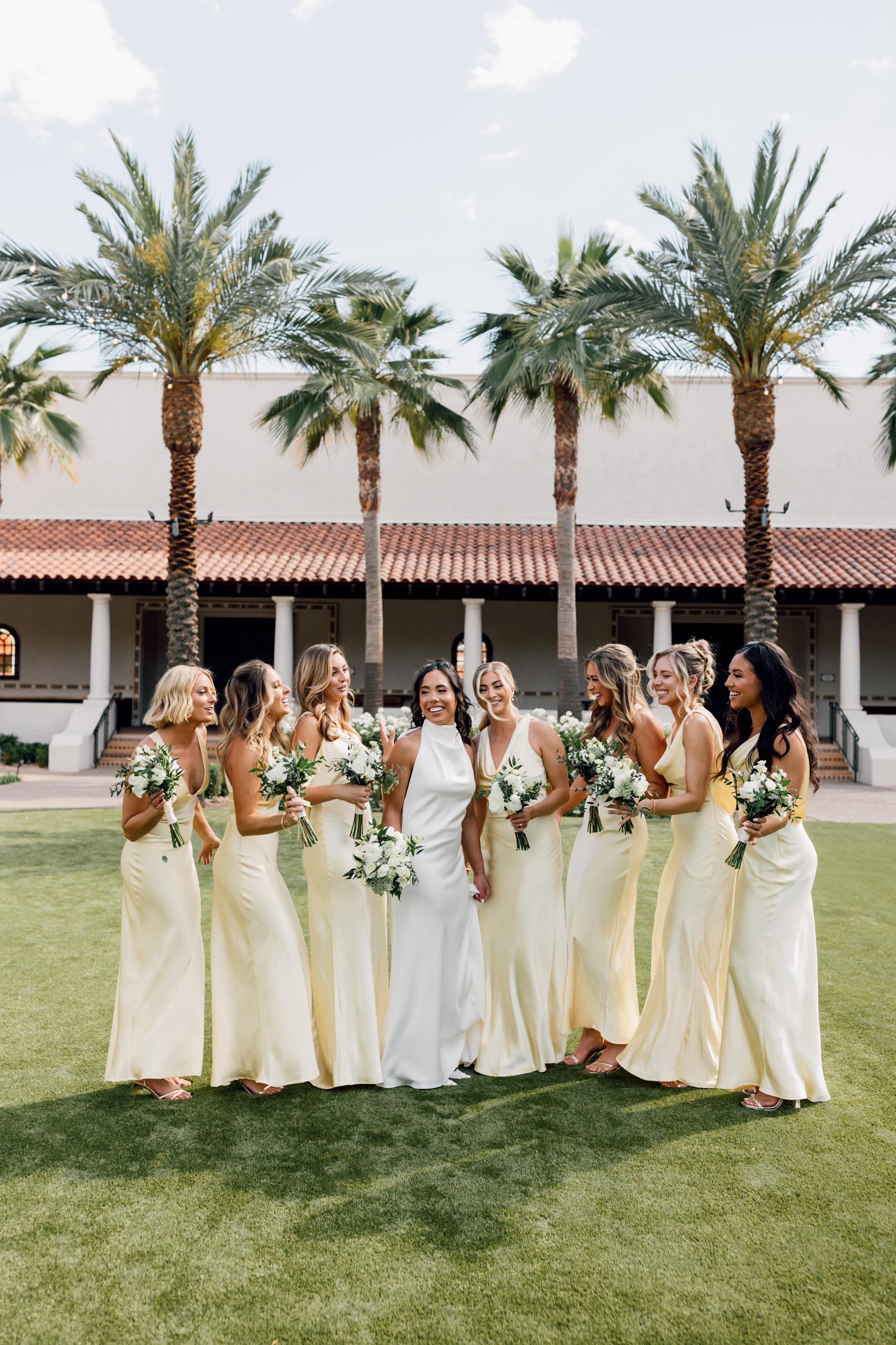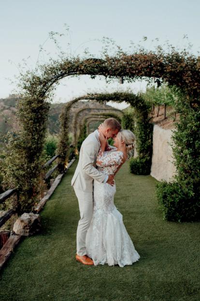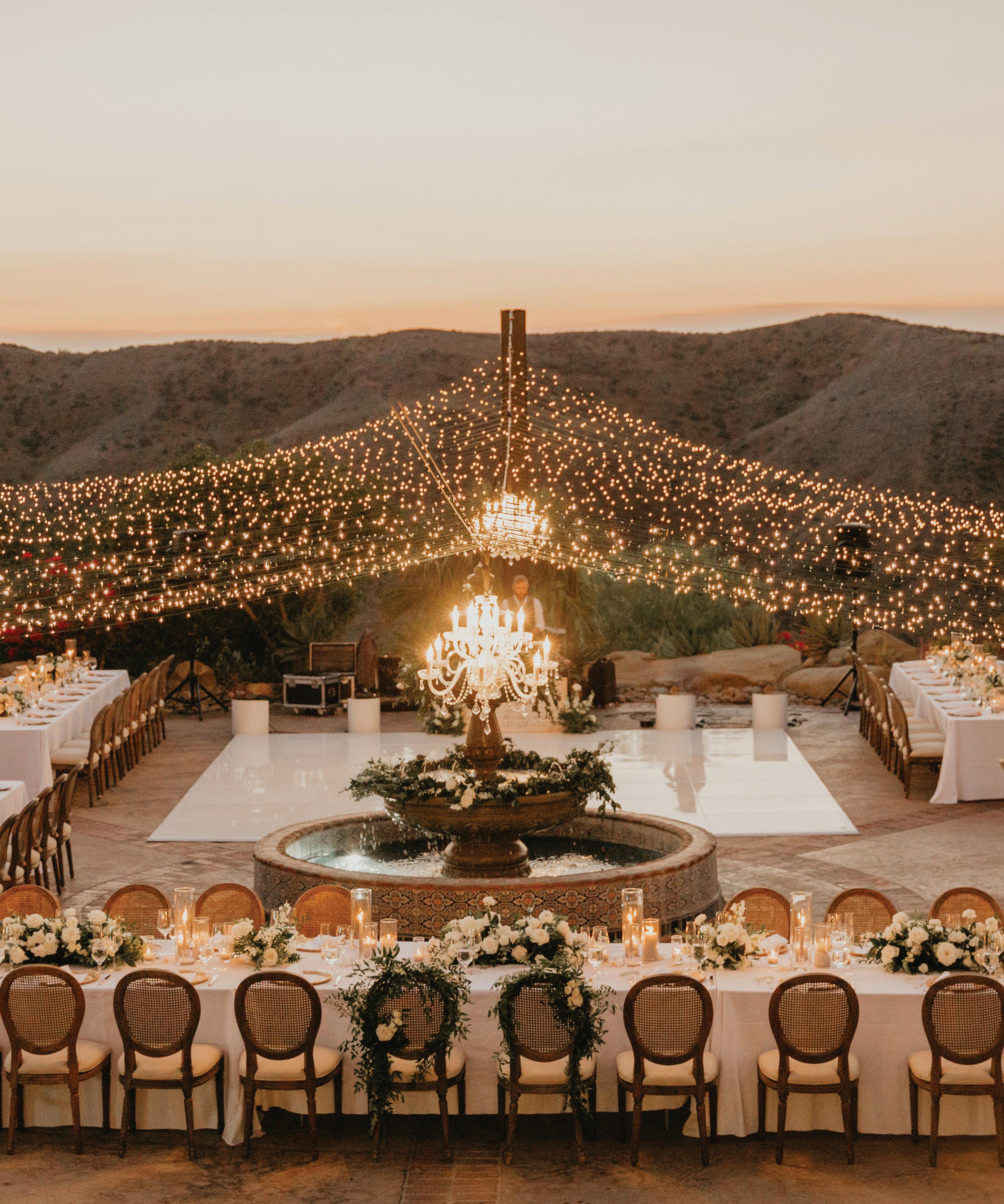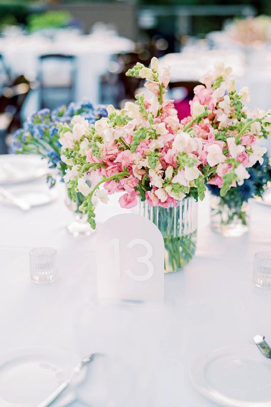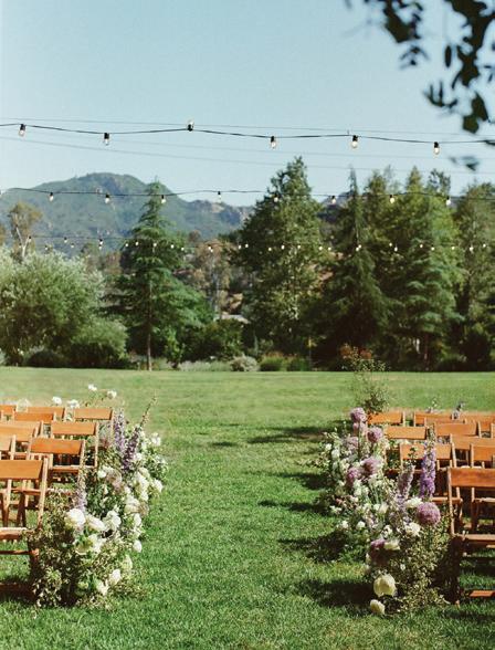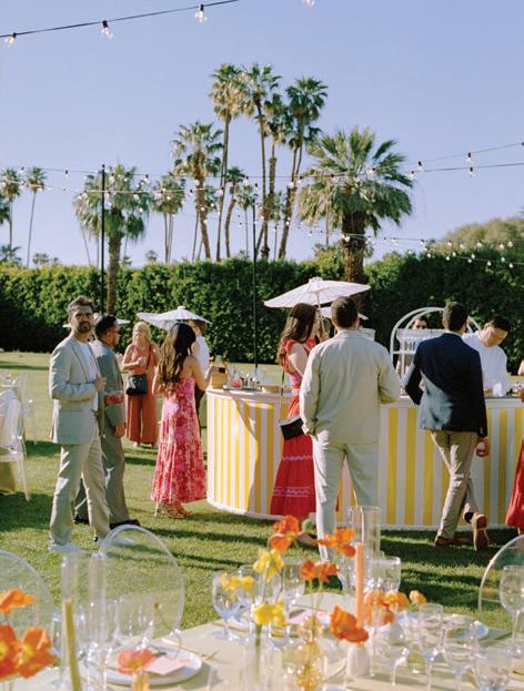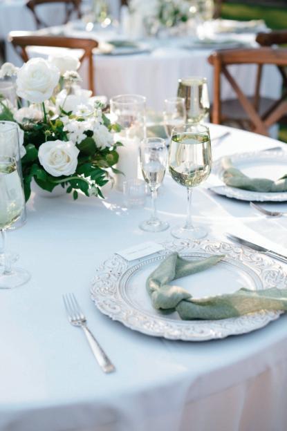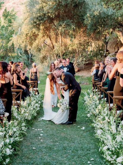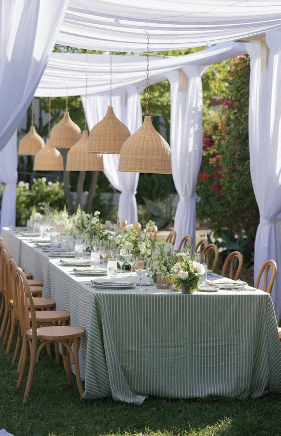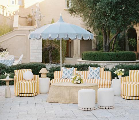 For couples whose wedding mood boards are filled with inspo of far-flung locales, but traveling abroad with their nearest and dearest isn’t an option, consider bringing the destination to you. Here, Avenue Twelve founder, owner and creative director Tommy Rouse captured the spirit of Italy’s sun-drenched Amalfi Coast at the 20-acre Allegretto Vineyard Resort in Paso Robles. “The resort’s architecture shaped the visual direction, blending European charm with California ease,” he says. “We built the palette around soft blue and lemon yellow, complemented by natural textures like wicker and linen, and brought in classic patterns such as stripes, scallops and curved silhouettes.” The result was an airy, joyful and elevated affair. The hand-carved stone fireplace served as a natural altar for the understated ceremony, while the cocktail hour emphasized connection via high and low tables, and the alfresco dinner in the courtyard offered a fresh alternative to trend-heavy settings. “We kept the floral footprint light, allowing candlelight, conversation and generous platters of food to take the spotlight,” Rouse says of the tablescape. “Ruffled napkins and sleek tabletop pieces added charm and character without overpowering the meal.” Bellissimo , indeed.