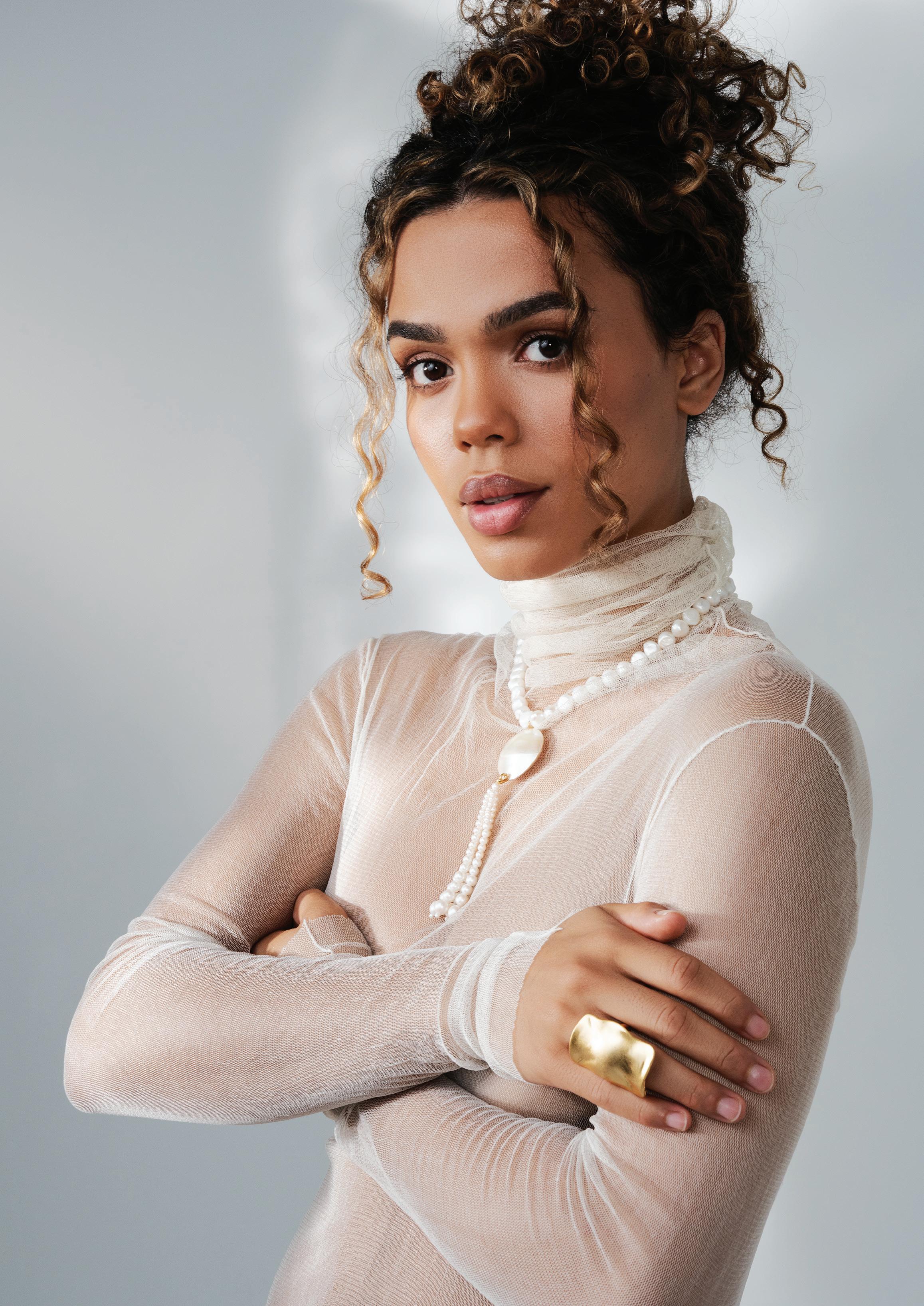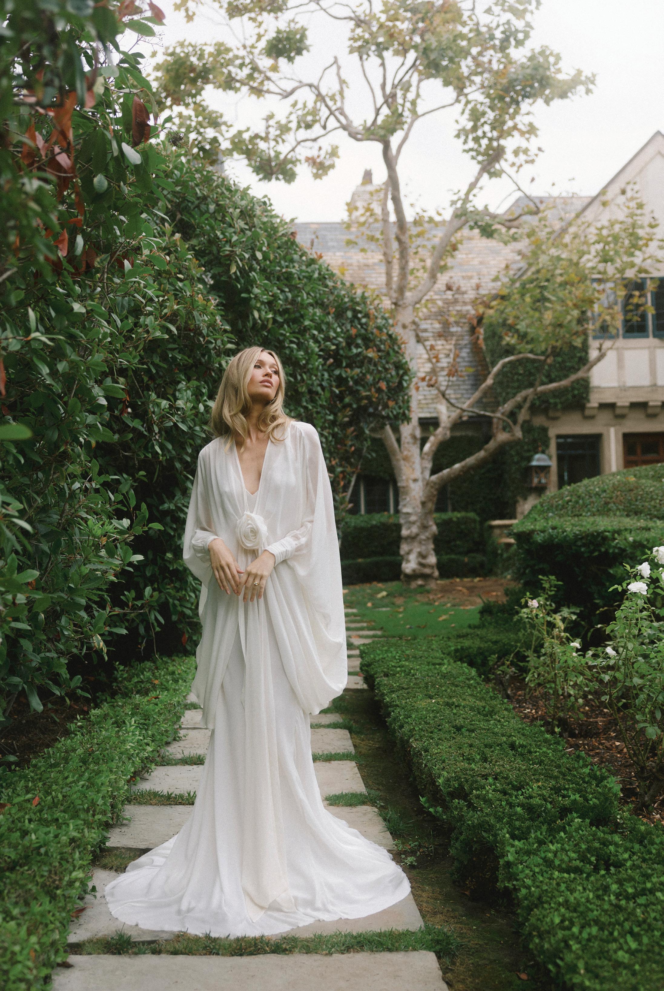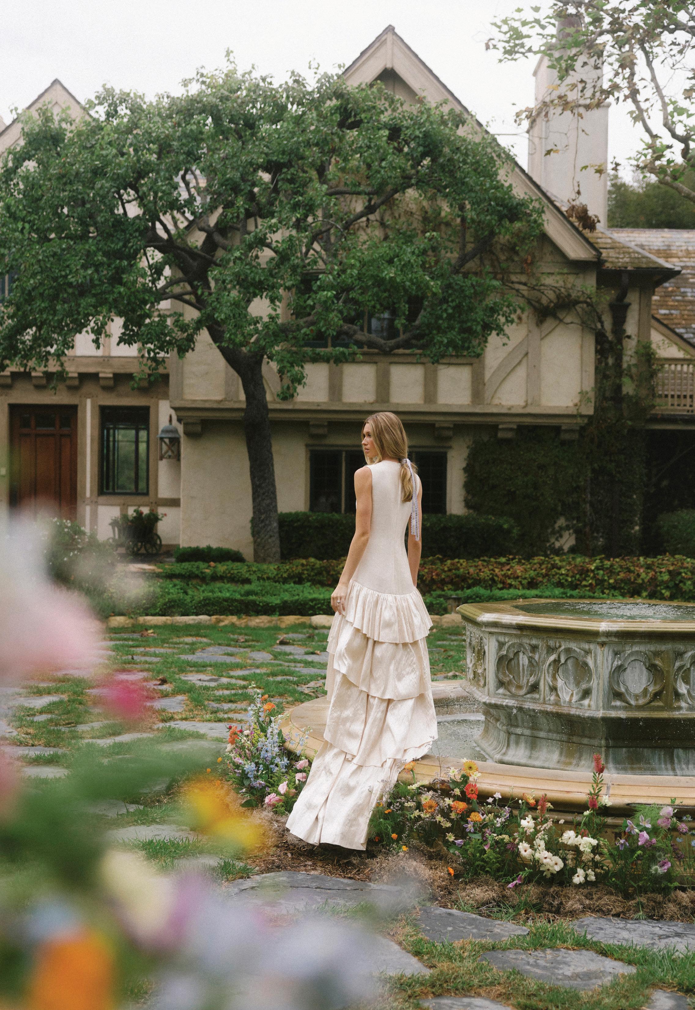 "Rachael" gown by FERRAH with Bracken Jewelers’ diamond engagement ring. Beauty by Tami Bernard Makeup. Styled by Kennedy Bingham. Photographed by Andrew Parsons at the Wynd Estate in Montecito. Additional details on page 50.