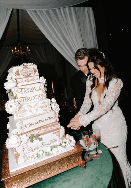As twilight gave way to celebration, Taylor slipped into a Netta Benshabu masterpiece. The gown’s body-skimming lines and luminous embellishments shimmered against the venue’s verdant backdrop. “The design leaned into soft neutrals white, taupe and green paired with velvet textures, French toile, and subtle nods to Beauty and the Beast,” says Taylor. “We incorporated everything we love: live music, worship elements, signature cocktails, vintage details and meaningful moments with family and friends.” A few of the Disney touches included a seated dinner served to “Be Our Guest,” a book-inspired cake and a choreographed first dance to “Tale as Old as Time.”