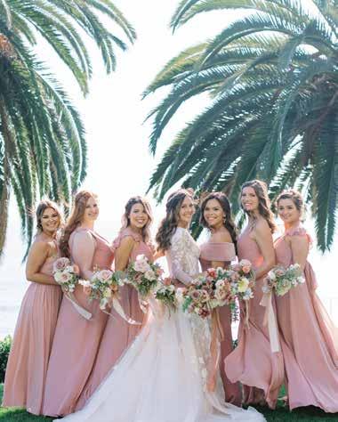 When it came time for wedding photographer Angelica Valiton to tie the knot with her beloved Richard Zupancic, she already had a step up on the wedding planning, having witnessed her share of weddings. Since the couple had spent the past three years watching beach sunsets, it was only fitting for them to wed at the stunning Bel-Air Bay Club, with the ocean sparkling in the background. Angelica envisioned a romantic garden aesthetic to complement the Bay Club’s newly renovated space. A blend of warm tones and light-colored woods accomplished this vision perfectly. Her lace gown paired beautifully with the pink bridesmaids’ dresses and the peach florals decorating the altar, centerpieces and cake, while palm trees brought the coastal charm. Their wedding date was particularly sentimental as it was the birthday of Angelica’s grandma and the day before the birthday of Kevin’s grandma. Because of those special days, the couple wanted to focus the celebration on their loved ones. Inspired by one of her clients’ weddings, Angelica hung wind chimes at their ceremony to remember those who could not attend. “Every time the wind blew and they chimed… I immediately felt their presence,” says Angelica. Their wedding party included others among their nearest and dearest. Angelica’s brother served as the officiant, and Angelica’s best friend, Jenny Quicksall, pulled double duty as maid of honor and wedding photographer. In a gesture of unity, the couple set up a table dedicated to each family’s wedding photos. “At the end of the day, all we truly cared about was that our loved ones were with us, celebrating our love and our family,” notes Angelica. While the guests prepped for the couple’s grand exit, the bride and groom shared a private last dance to Frank Sinatra’s “The Way You Look Tonight,” allowing the two of them to drink in the last moments of their big day together.