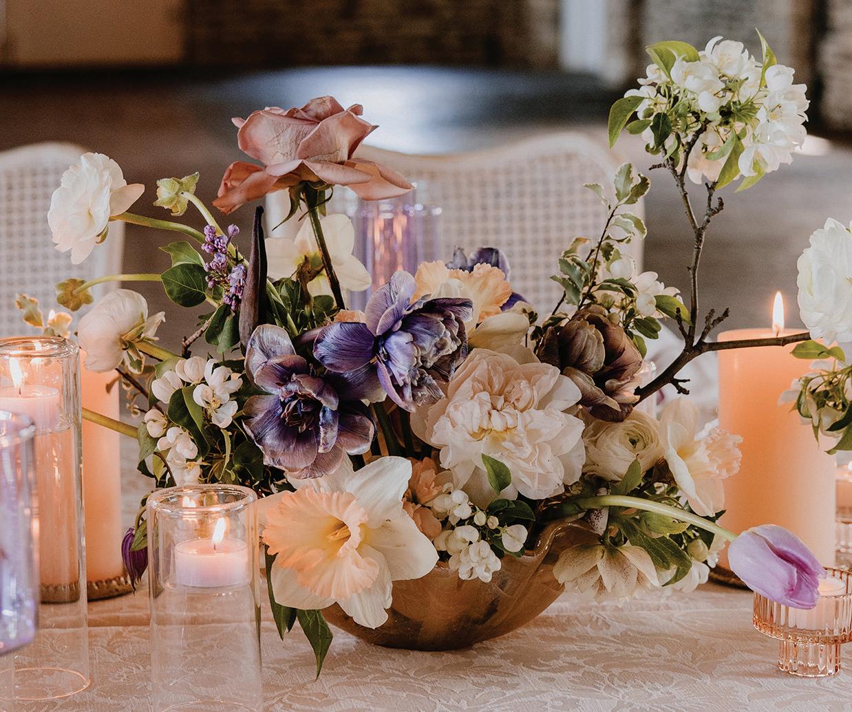 Whimsical details and lilac hues evoke an enchanting scape at the Mayowood Stone Barn.