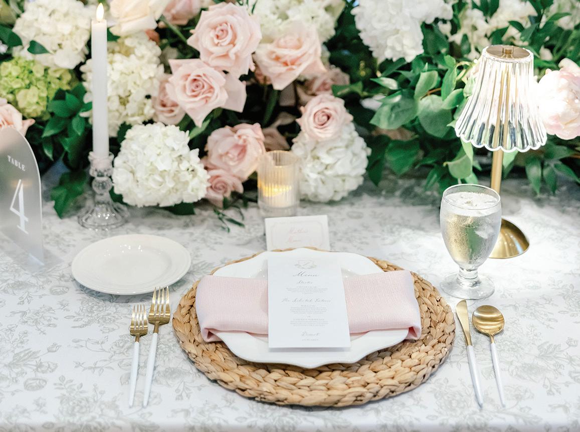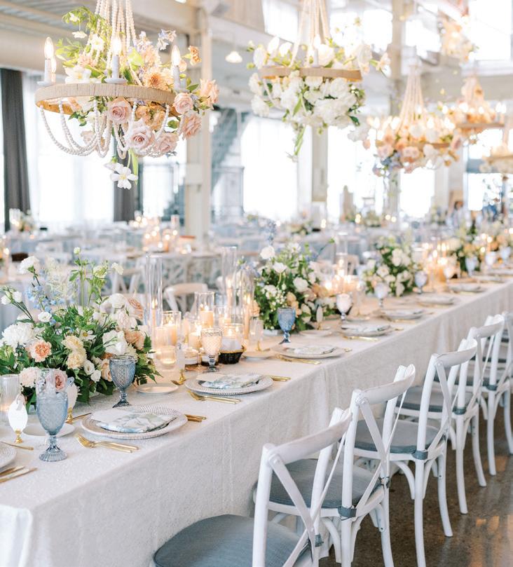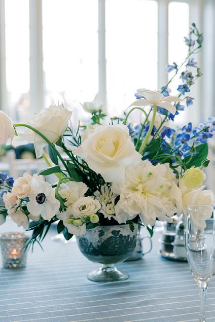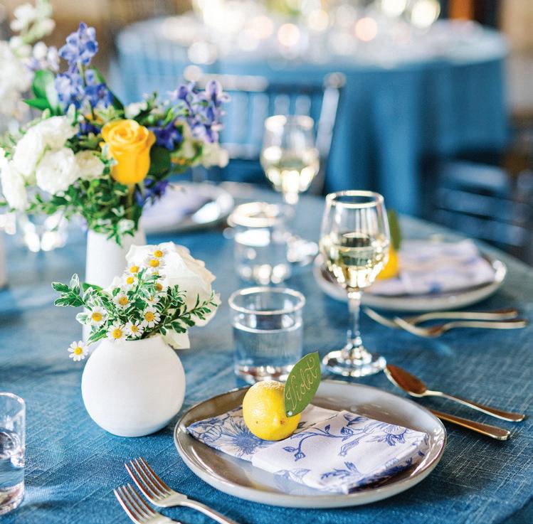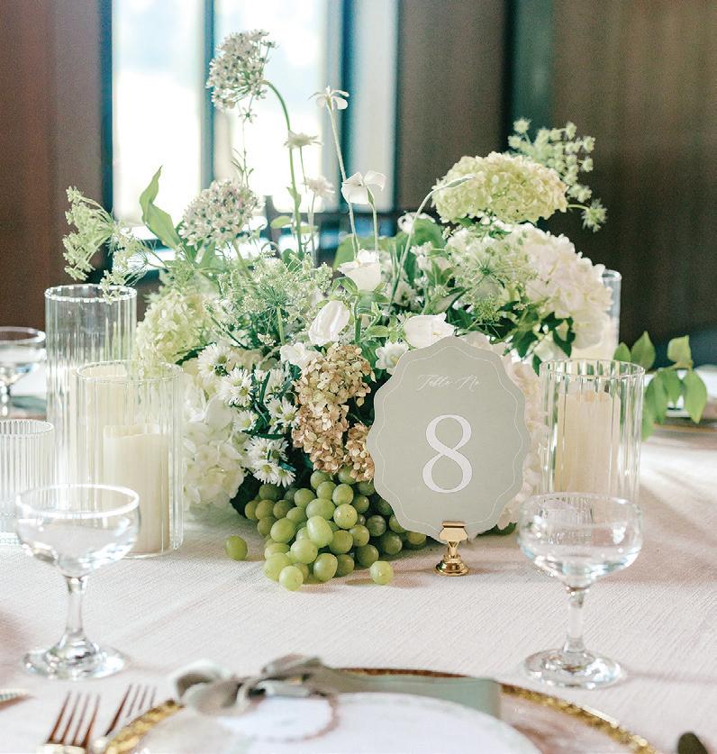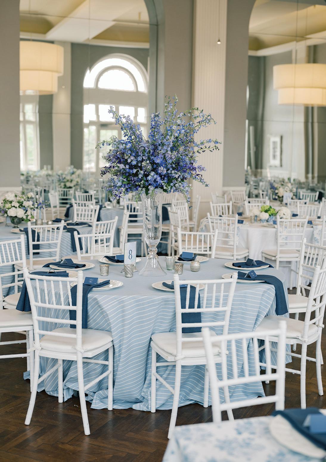 Meredith and Daniel’s wedding was a luminous celebration of love, faith and family, radiating timeless spring elegance. Their story began in college and over seven years, with more than five spent apart, they nurtured their bond through heartfelt letters. These cherished notes became a central theme of the day, inspiring table numbers, a seating chart and a vintage mailbox card box that celebrated their unique journey. Drawing inspiration from the soft beauty of spring, the couple chose a coastal palette of blues, crisp whites and hints of green and silver. The ceremony at Westminster Presbyterian Church reflected the depth of their faith, culminating in a joyful grand exit beneath ringing bells and waving streamers before departing in Daniel’s family’s vintage 1950s Rolls-Royce. The reception at The Beach Club blended romance with waterside sophistication. Whimsical, flowing floral designs in shades of blue, green and neutrals graced the space in clear vases, chinoiserie vessels and silver urns. Layered linens in floral, striped and velvet patterns added texture and visual interest to every table. Guests sipped signature cocktails, toasted with champagne and enjoyed a string quartet during cocktail hour before dancing to a live band under candlelight and shimmering lake views. Every detail, from curated desserts and personalized touches to the soft, ethereal lighting, spoke to the couple’s love story and the legacy of their families. The day was not only a reflection of Meredith and Daniel’s enduring devotion, but a testament to the beauty of love, connection and celebration. — Laura Cross