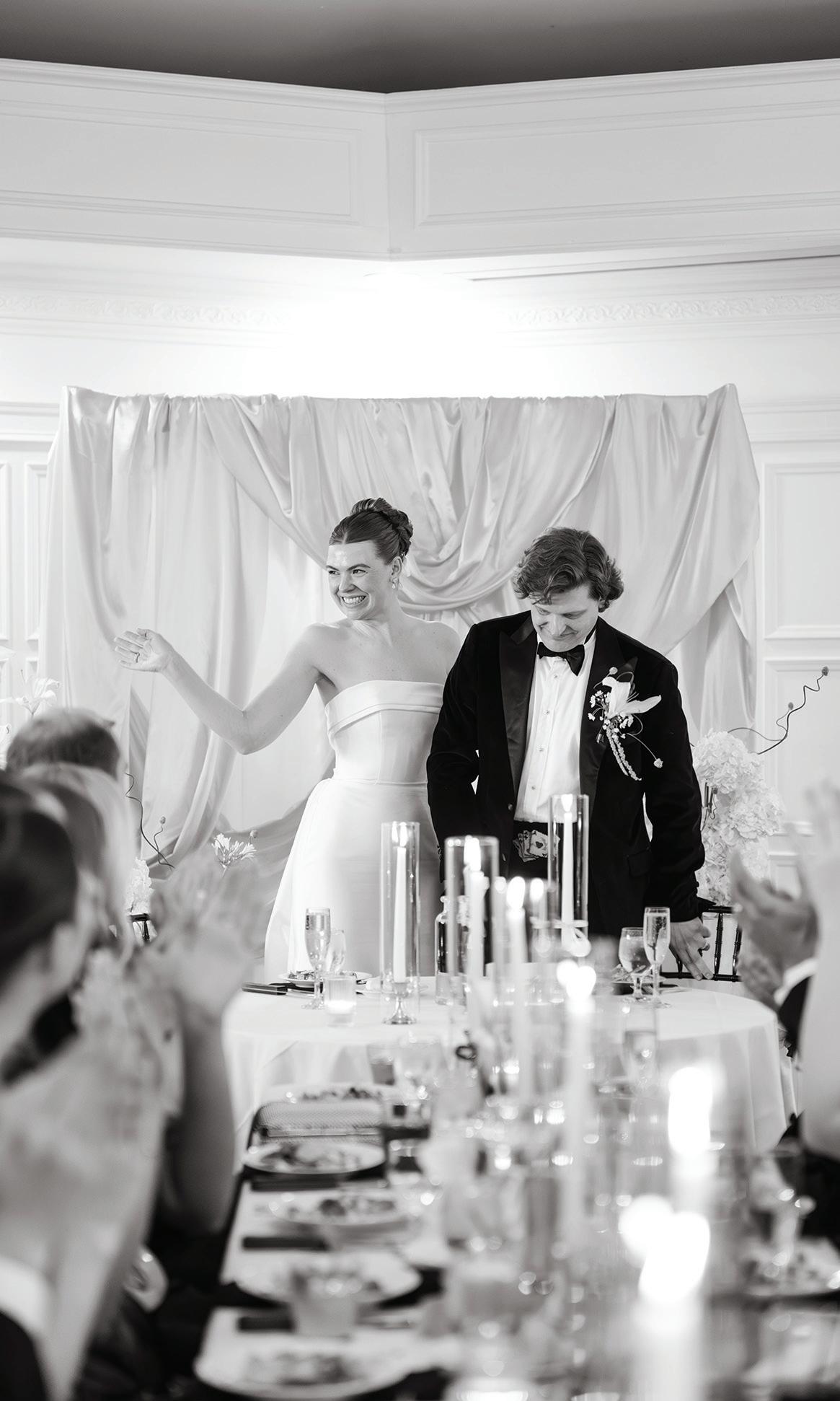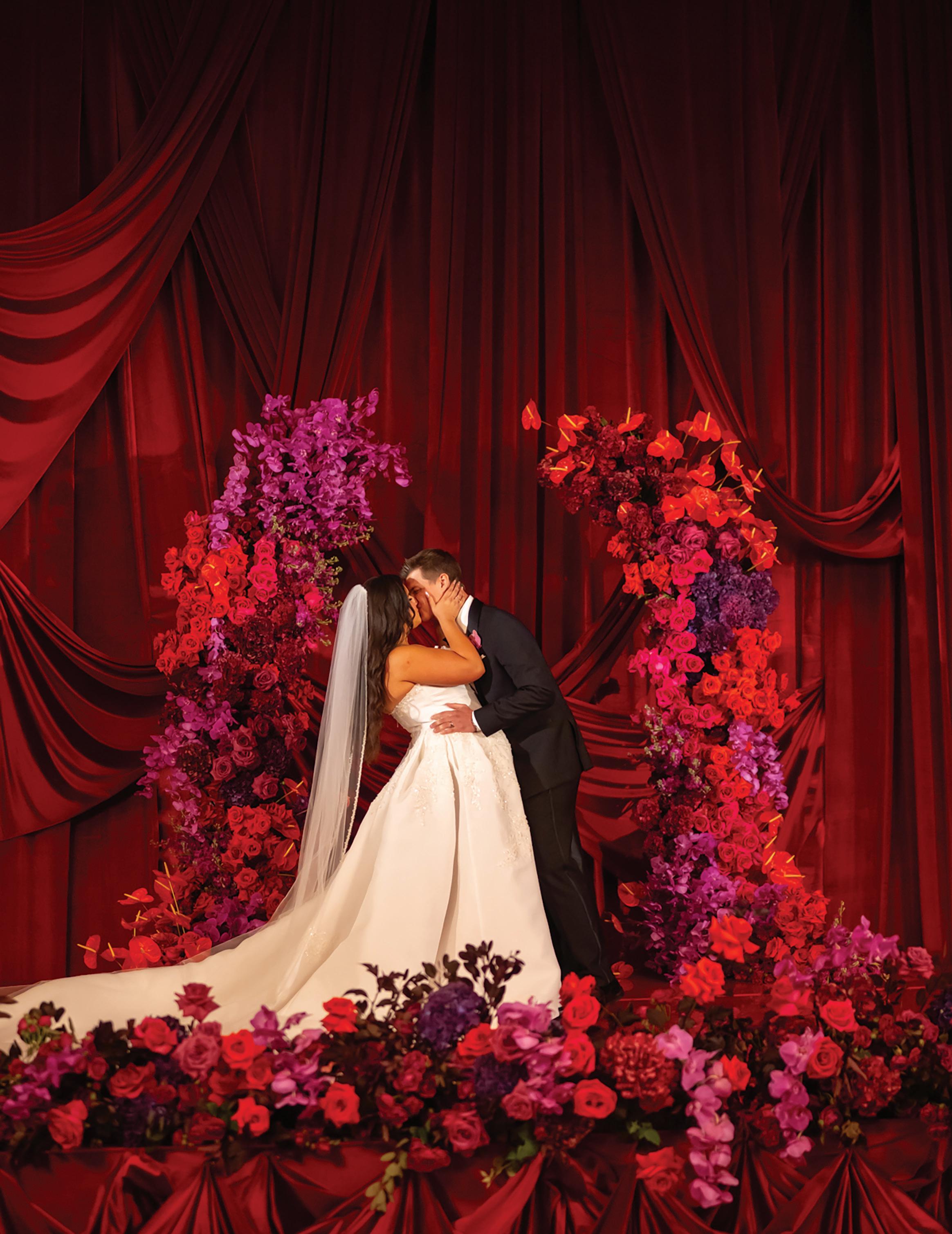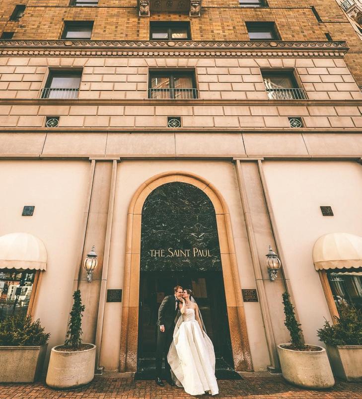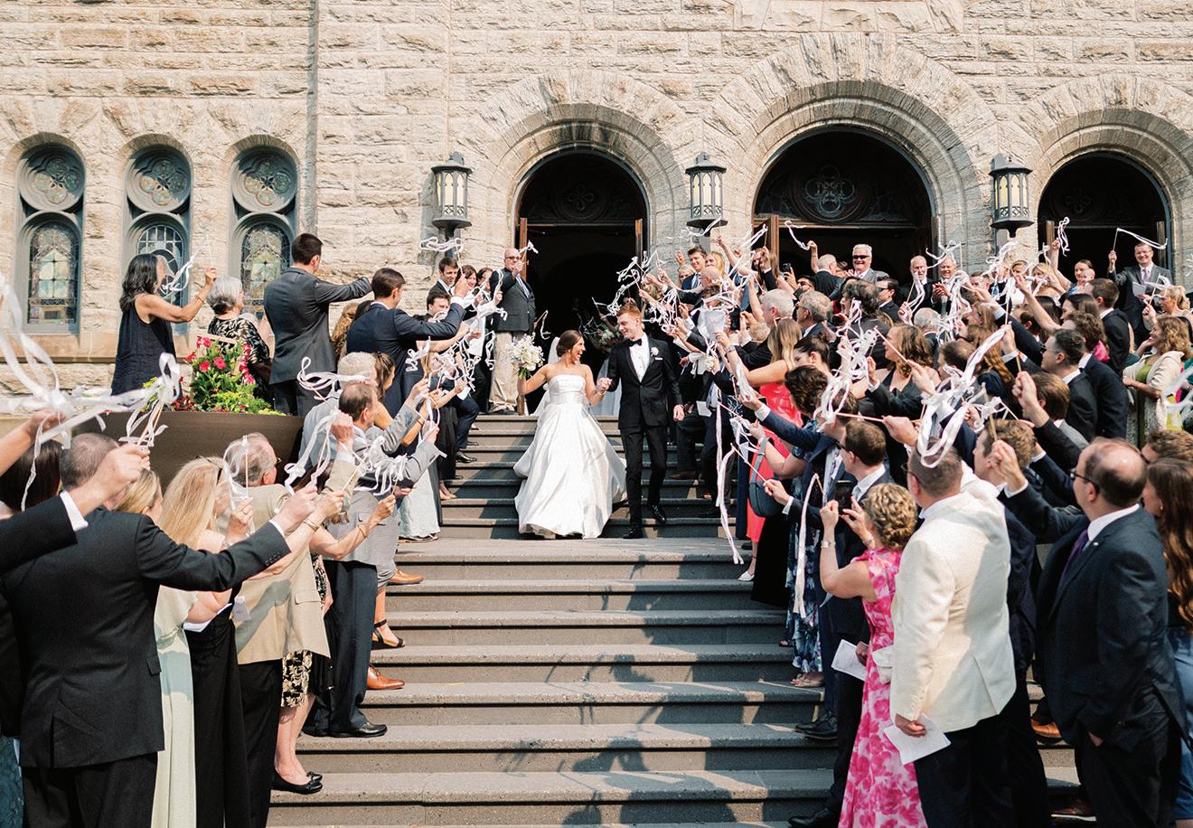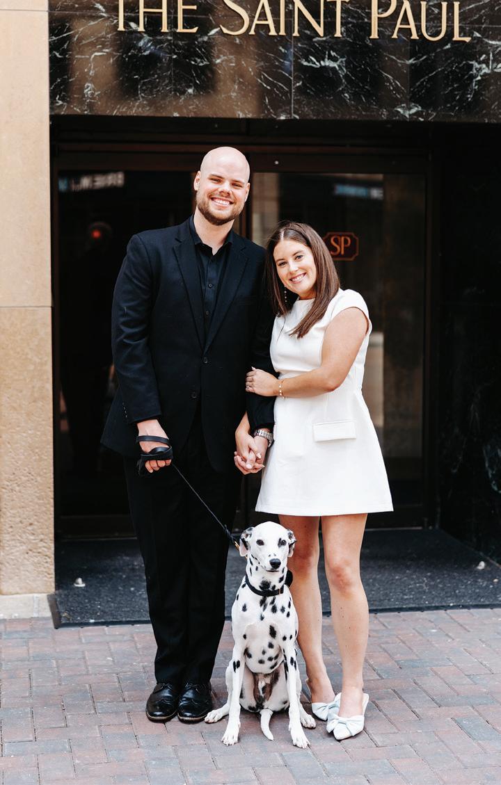 On the 50th anniversary of his parents’ wedding, Trip married the love of his life, Natalie, at St. Paul College Club. The two met in law school seven years ago, and despite the serious nature of their profession, they wanted their wedding day to be laid-back, reflecting their go-with-the-flow personalities. Drawing inspiration from the venue’s colorful pops of pink and blue décor, the aesthetic for Natalie and Trip’s day was described as “classic vintage with a kitschy twist.” Pink bows along the main staircase set the tone for a playful affair. The indoor ceremony space served as a versatile blank slate. Romantic layers of pink silk fabric were fashioned into a retro backdrop. Opting to balance the cheeky pops of color, white hydrangeas, calla lilies and lush foliage in artistic sculptural arrangements to create a unique altar. With a touch of drama, Natalie glided down the aisle with a bouquet of elegant stems tied with a black bow. Her strapless gown was simple yet striking, accented with a full veil and the lengthy train of her mother’s wedding dress. Trip’s ensemble was equally intentional; his classic tuxedo accented with custom “I Do” shoes from Stubbs and Wootton and a custom cummerbund adorned with a playing card motif. The evening amplified the undeniable thread of fun woven throughout the wedding day. Laughter floated through the air as Natalie and Trip shared a meal with their loved ones before dancing the night away dressed in pink feather boas and sunglasses. — Ryley S. Hoff