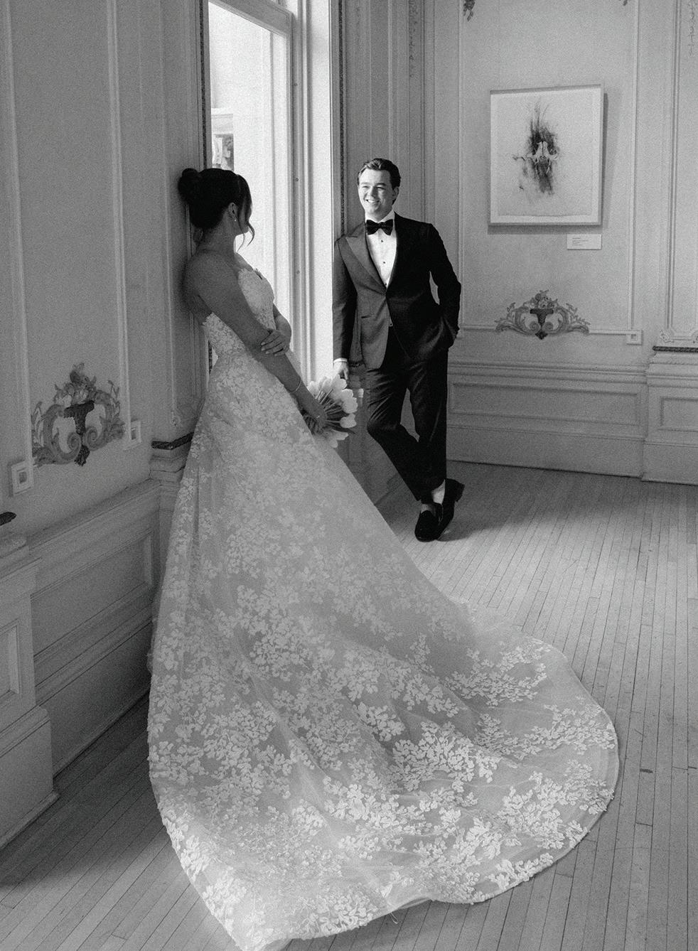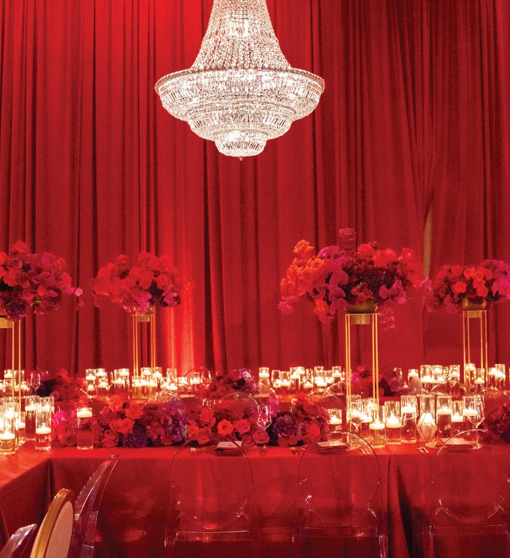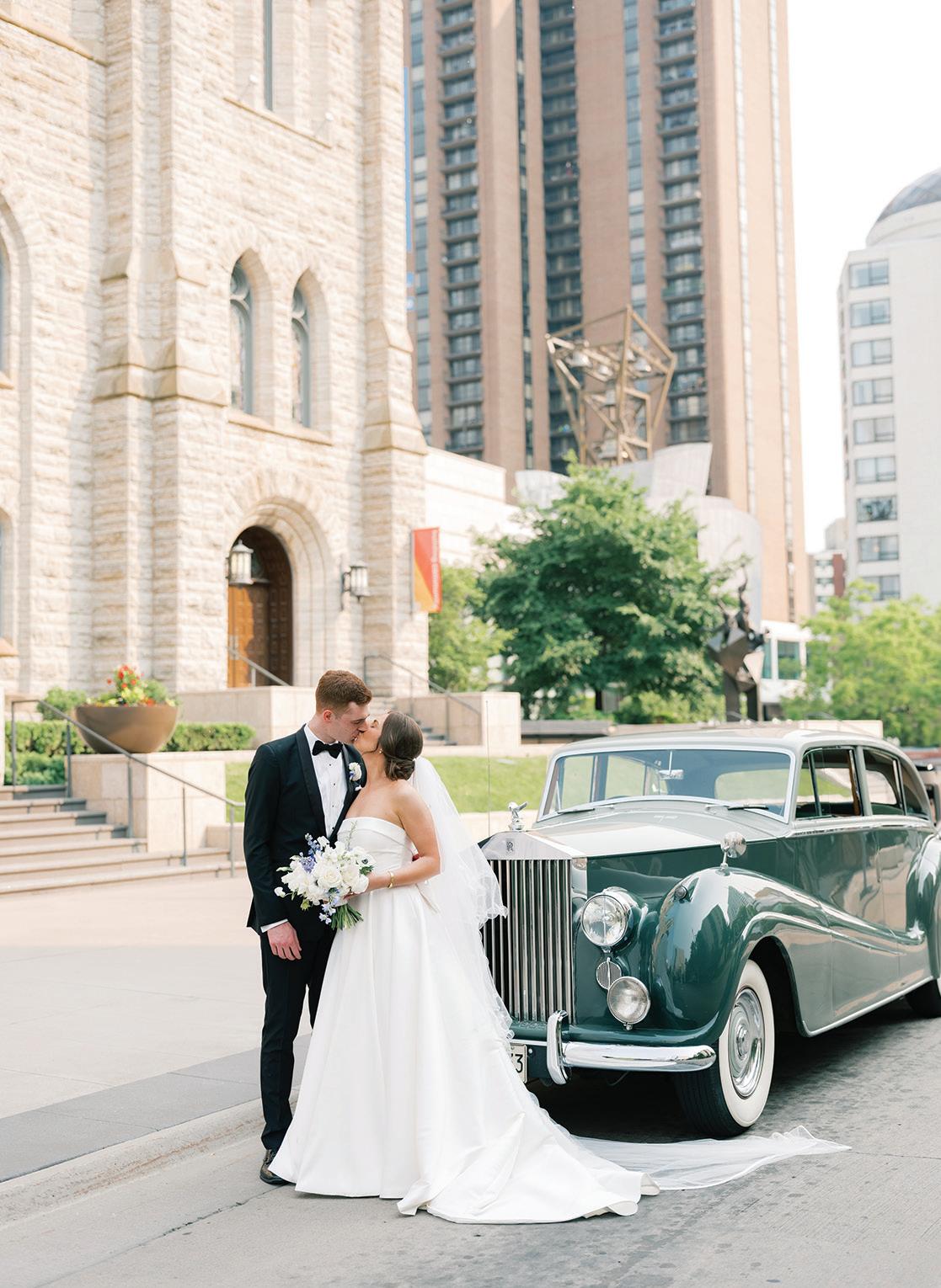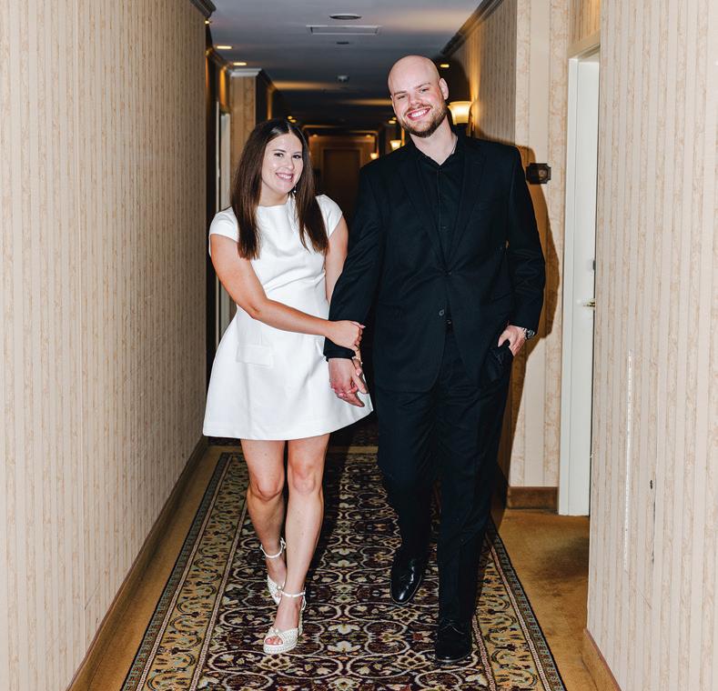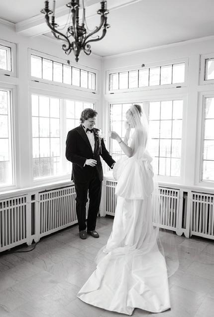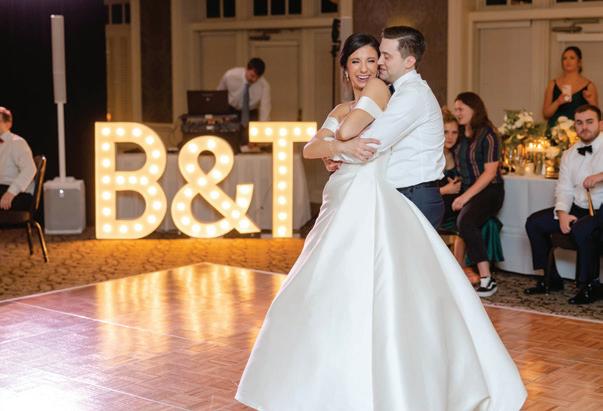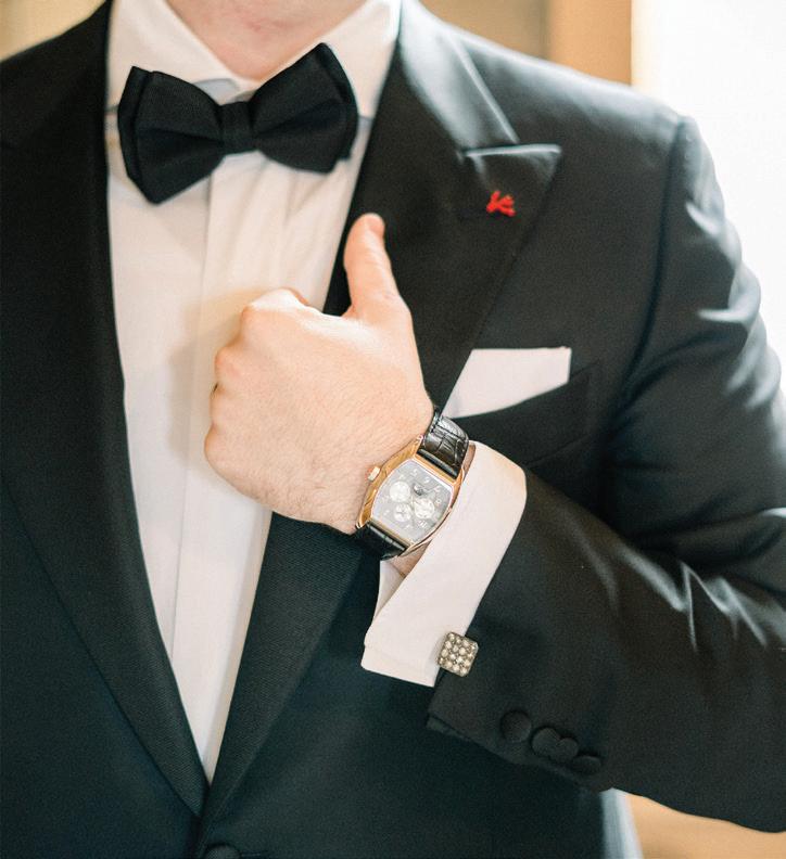On the 50th anniversary of his parents’ wedding, Trip married the love of his life, Natalie, at St. Paul College Club. The two met in law school seven years ago, and despite the serious nature of their profession, they wanted their wedding day to be laid-back, reflecting their go-with-the-flow personalities. Drawing inspiration from the venue’s colorful pops of pink and blue décor, the aesthetic for Natalie and Trip’s day was described as “classic vintage with a kitschy twist.” Pink bows along the main staircase set the tone for a playful affair. The indoor ceremony space served as a versatile blank slate. Romantic layers of pink silk fabric were fashioned into a retro backdrop. Opting to balance the cheeky pops of color, white hydrangeas, calla lilies and lush foliage in artistic sculptural arrangements to create a unique altar. With a touch of drama, Natalie glided down the aisle with a bouquet of elegant stems tied with a black bow. Her strapless gown was simple yet striking, accented with a full veil and the lengthy train of her mother’s wedding dress. Trip’s ensemble was equally intentional; his classic tuxedo accented with custom “I Do” shoes from Stubbs and Wootton and a custom cummerbund adorned with a playing card motif. The evening amplified the undeniable thread of fun woven throughout the wedding day. Laughter floated through the air as Natalie and Trip shared a meal with their loved ones before dancing the night away dressed in pink feather boas and sunglasses. — Ryley S. Hoff