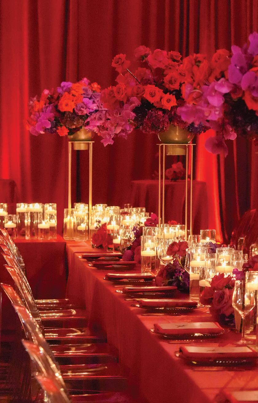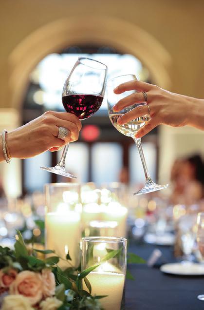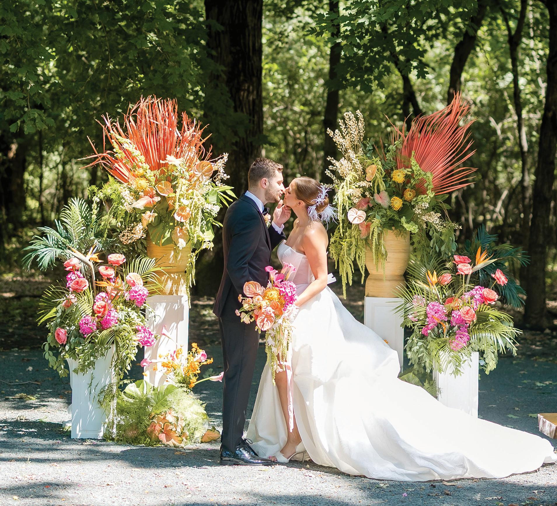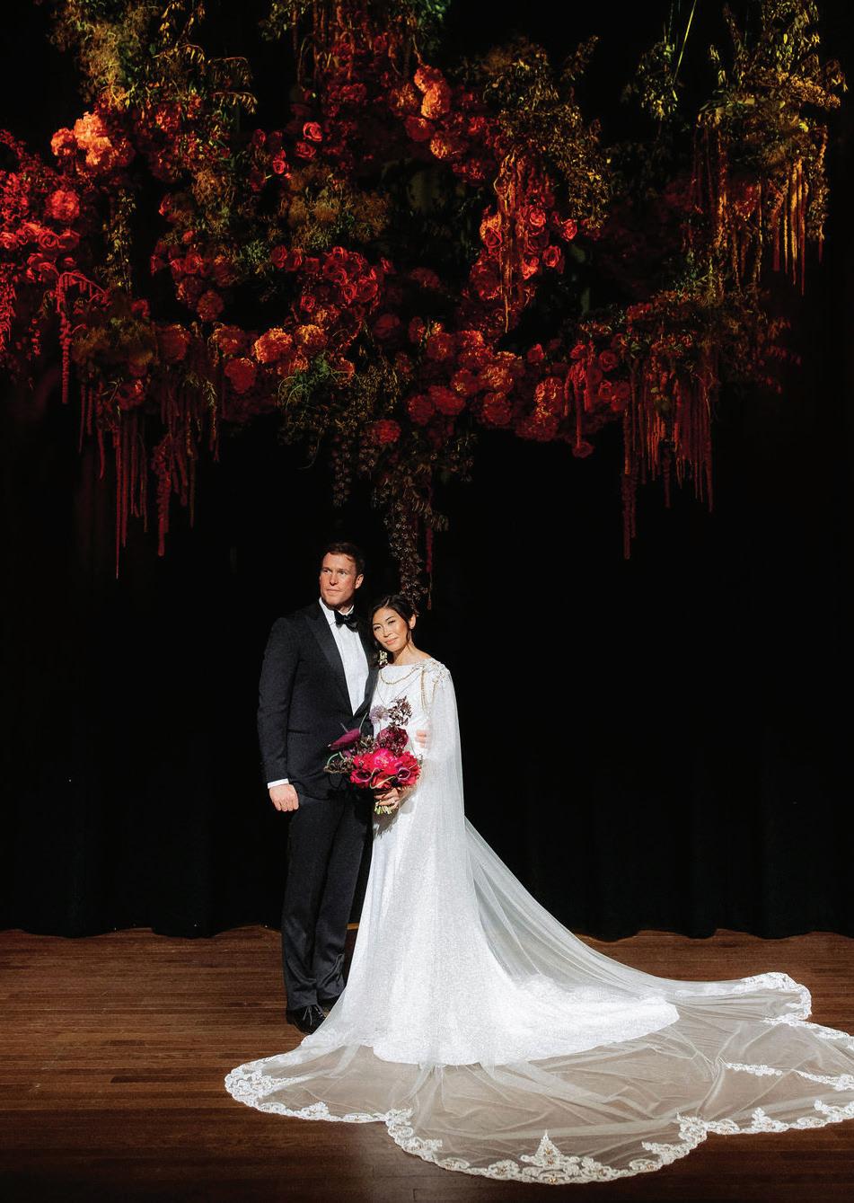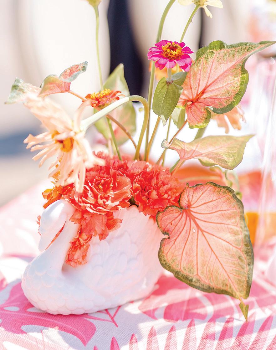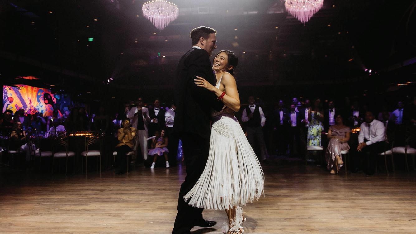 On the 50th anniversary of his parents’ wedding, Trip married the love of his life, Natalie, at St. Paul College Club. The two met in law school seven years ago, and despite the serious nature of their profession, they wanted their wedding day to be laid-back, reflecting their go-with-the-flow personalities. Drawing inspiration from the venue’s colorful pops of pink and blue décor, the aesthetic for Natalie and Trip’s day was described as “classic vintage with a kitschy twist.” Pink bows along the main staircase set the tone for a playful affair. The indoor ceremony space served as a versatile blank slate. Romantic layers of pink silk fabric were fashioned into a retro backdrop. Opting to balance the cheeky pops of color, white hydrangeas, calla lilies and lush foliage in artistic sculptural arrangements to create a unique altar. With a touch of drama, Natalie glided down the aisle with a bouquet of elegant stems tied with a black bow. Her strapless gown was simple yet striking, accented with a full veil and the lengthy train of her mother’s wedding dress. Trip’s ensemble was equally intentional; his classic tuxedo accented with custom “I Do” shoes from Stubbs and Wootton and a custom cummerbund adorned with a playing card motif. The evening amplified the undeniable thread of fun woven throughout the wedding day. Laughter floated through the air as Natalie and Trip shared a meal with their loved ones before dancing the night away dressed in pink feather boas and sunglasses. — Ryley S. Hoff