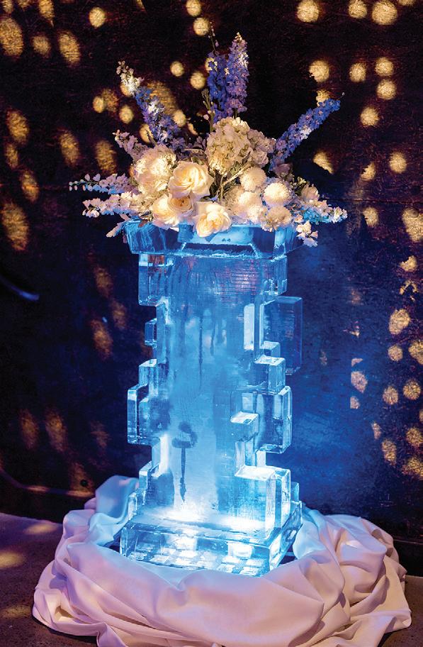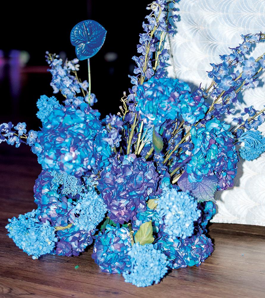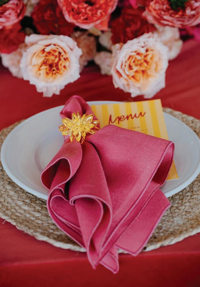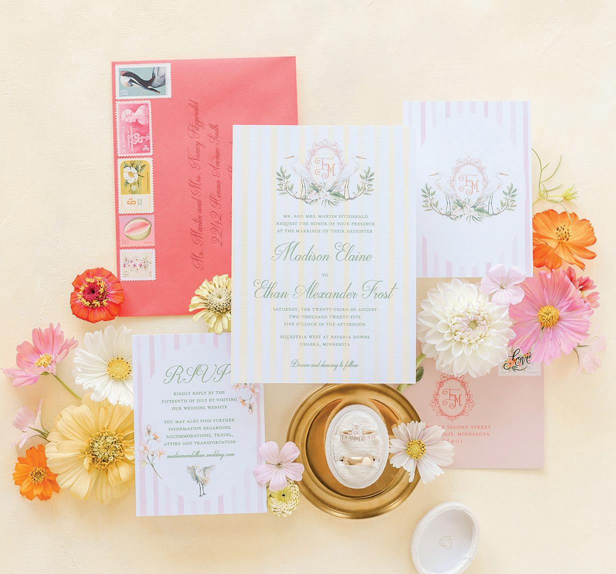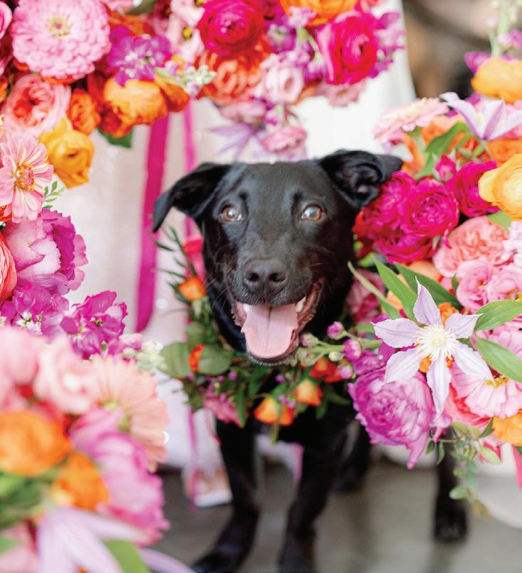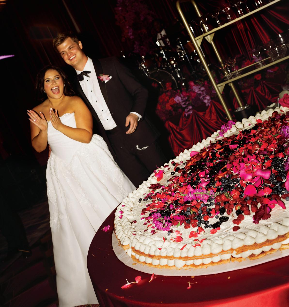 On the 50th anniversary of his parents’ wedding, Trip married the love of his life, Natalie, at St. Paul College Club. The two met in law school seven years ago, and despite the serious nature of their profession, they wanted their wedding day to be laid-back, reflecting their go-with-the-flow personalities. Drawing inspiration from the venue’s colorful pops of pink and blue décor, the aesthetic for Natalie and Trip’s day was described as “classic vintage with a kitschy twist.” Pink bows along the main staircase set the tone for a playful affair. The indoor ceremony space served as a versatile blank slate. Romantic layers of pink silk fabric were fashioned into a retro backdrop. Opting to balance the cheeky pops of color, white hydrangeas, calla lilies and lush foliage in artistic sculptural arrangements to create a unique altar. With a touch of drama, Natalie glided down the aisle with a bouquet of elegant stems tied with a black bow. Her strapless gown was simple yet striking, accented with a full veil and the lengthy train of her mother’s wedding dress. Trip’s ensemble was equally intentional; his classic tuxedo accented with custom “I Do” shoes from Stubbs and Wootton and a custom cummerbund adorned with a playing card motif. The evening amplified the undeniable thread of fun woven throughout the wedding day. Laughter floated through the air as Natalie and Trip shared a meal with their loved ones before dancing the night away dressed in pink feather boas and sunglasses. — Ryley S. Hoff