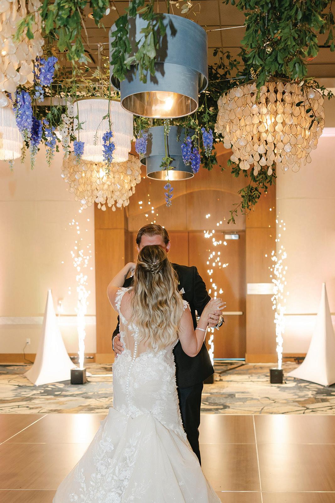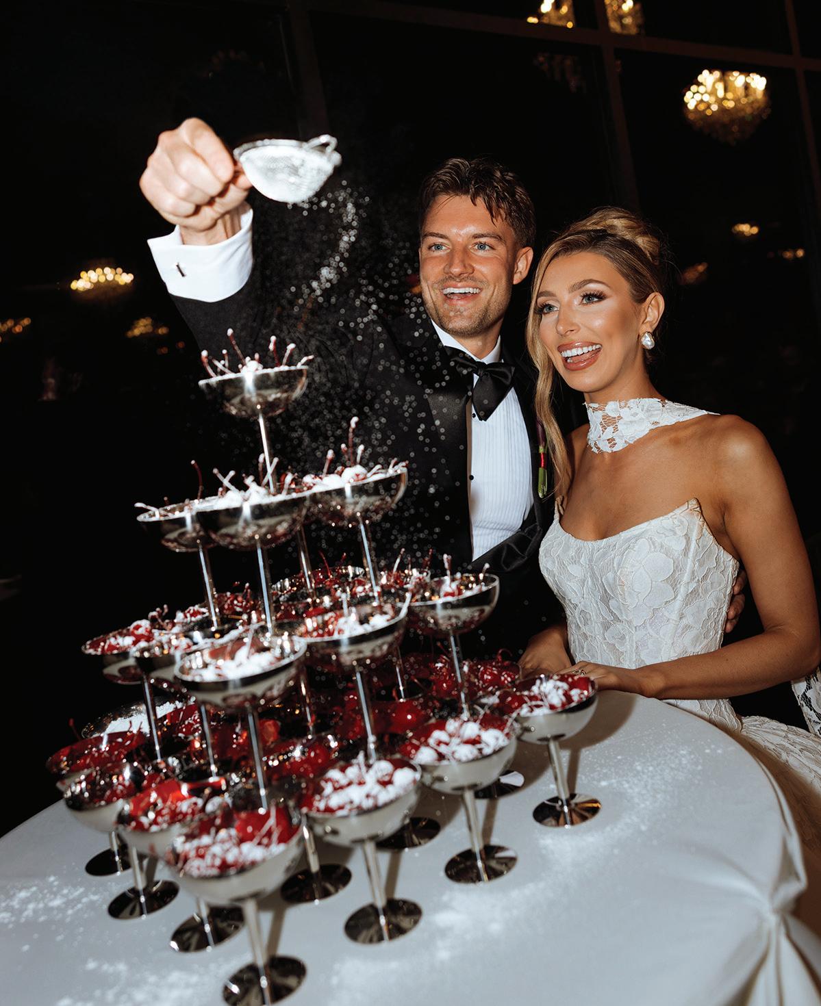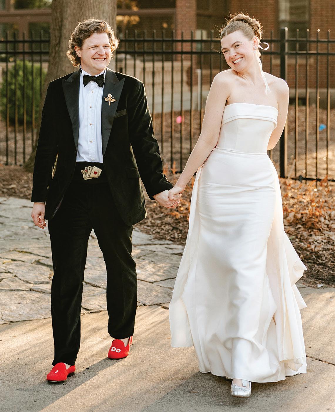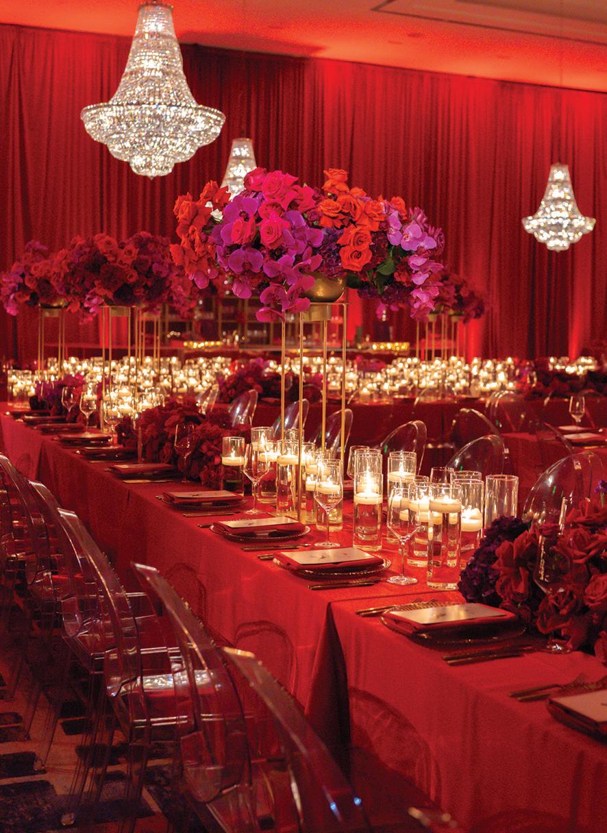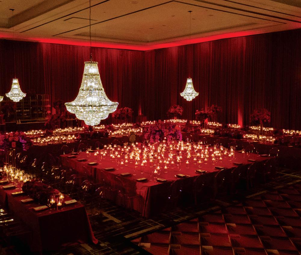 On the 50th anniversary of his parents’ wedding, Trip married the love of his life, Natalie, at St. Paul College Club. The two met in law school seven years ago, and despite the serious nature of their profession, they wanted their wedding day to be laid-back, reflecting their go-with-the-flow personalities. Drawing inspiration from the venue’s colorful pops of pink and blue décor, the aesthetic for Natalie and Trip’s day was described as “classic vintage with a kitschy twist.” Pink bows along the main staircase set the tone for a playful affair. The indoor ceremony space served as a versatile blank slate. Romantic layers of pink silk fabric were fashioned into a retro backdrop. Opting to balance the cheeky pops of color, white hydrangeas, calla lilies and lush foliage in artistic sculptural arrangements to create a unique altar. With a touch of drama, Natalie glided down the aisle with a bouquet of elegant stems tied with a black bow. Her strapless gown was simple yet striking, accented with a full veil and the lengthy train of her mother’s wedding dress. Trip’s ensemble was equally intentional; his classic tuxedo accented with custom “I Do” shoes from Stubbs and Wootton and a custom cummerbund adorned with a playing card motif. The evening amplified the undeniable thread of fun woven throughout the wedding day. Laughter floated through the air as Natalie and Trip shared a meal with their loved ones before dancing the night away dressed in pink feather boas and sunglasses. — Ryley S. Hoff