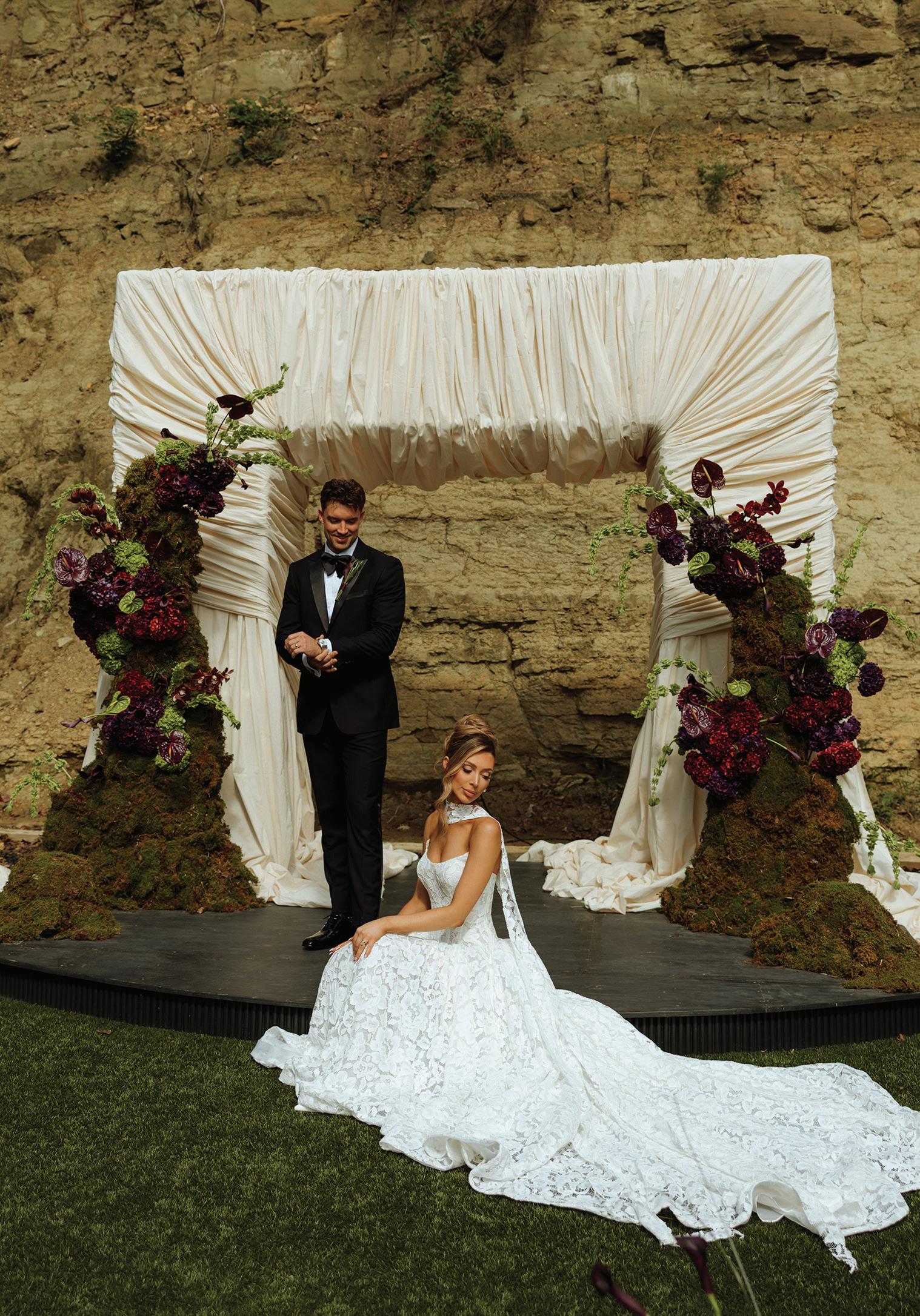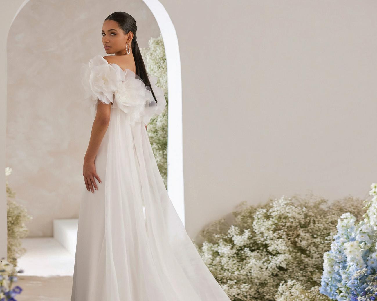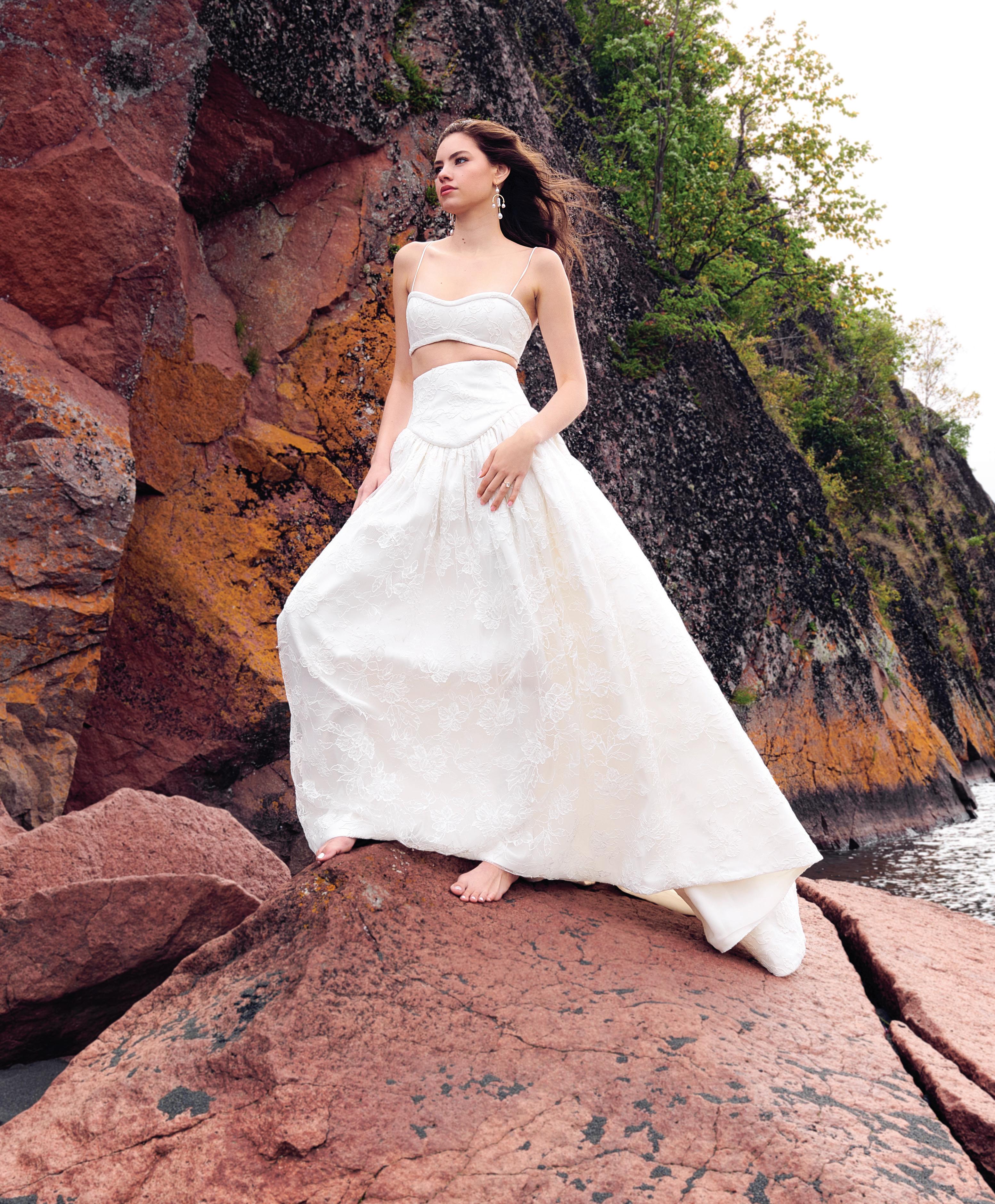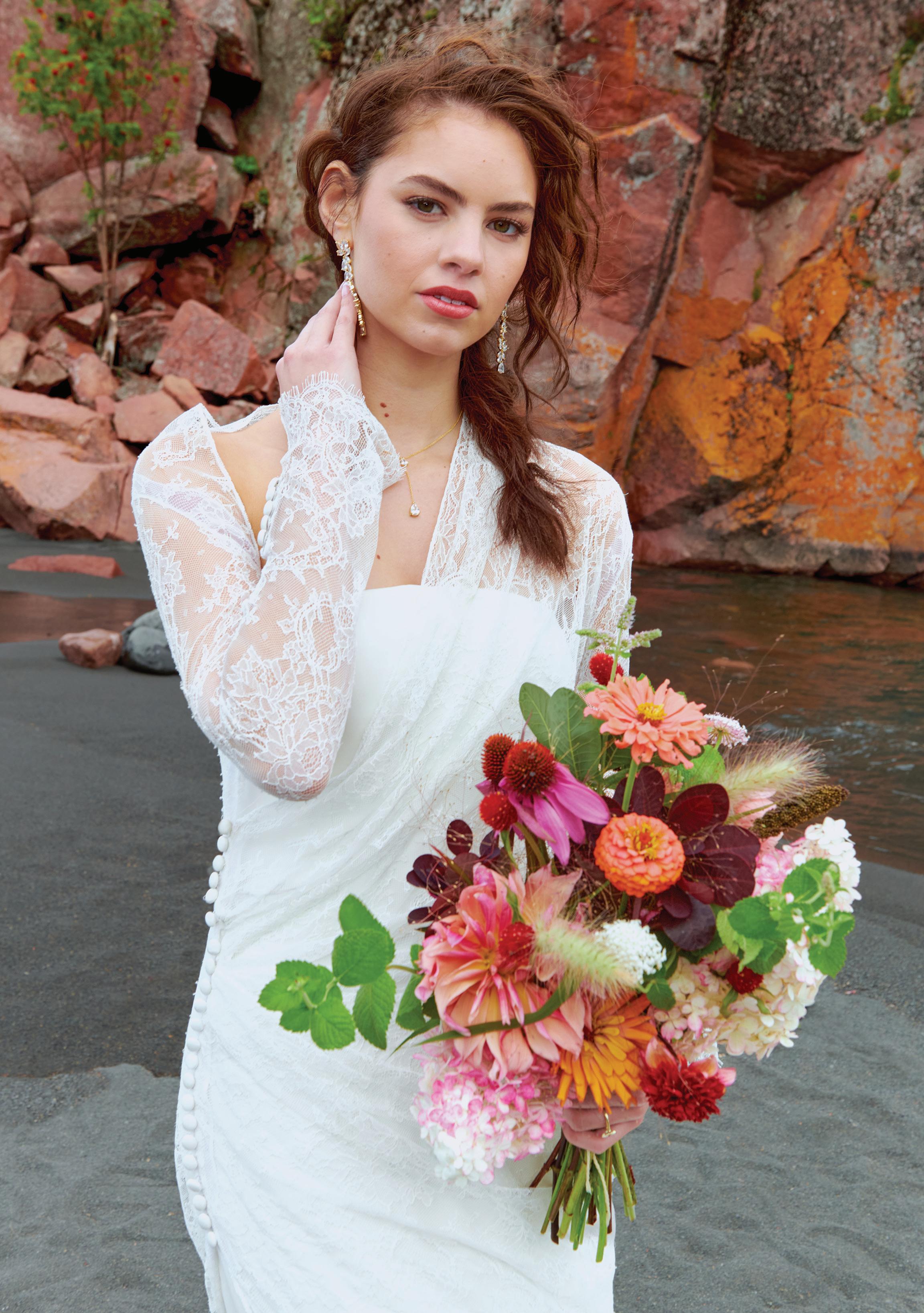 “Sandrine” gown by Elly Sofocli from Loho Bride. “Mimi” earrings by Rileyhaus. Cathedral length tulle veil by Katherine Tash. “Supernova” ring by Jenny Bird. Styled by Sydney Stevens. Hair and makeup by KC Witkamp. Photographed by Jen Lovely. More details on page 100.