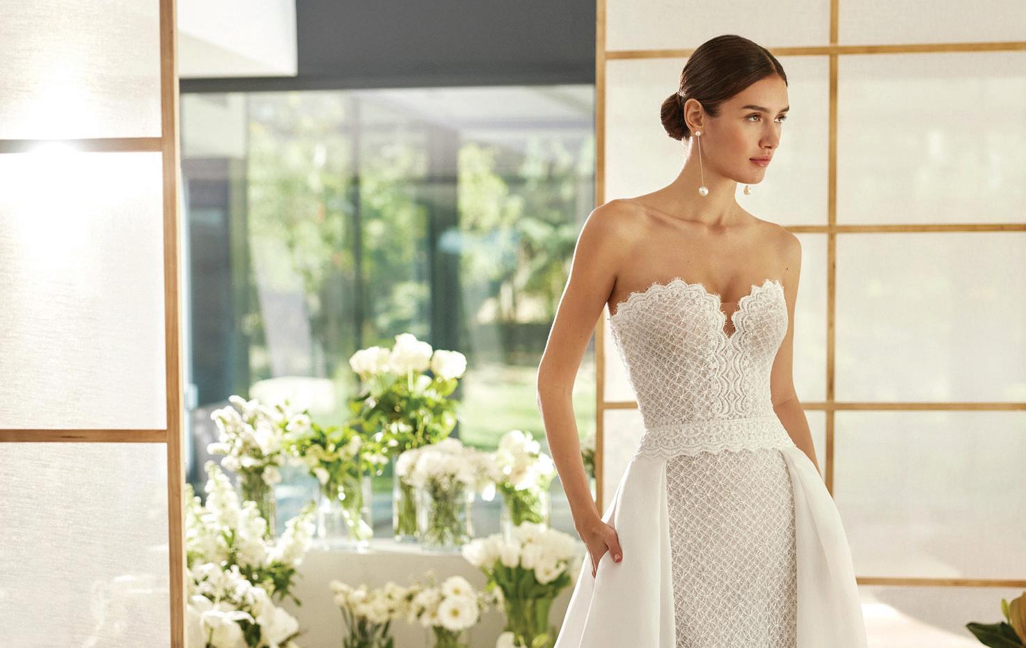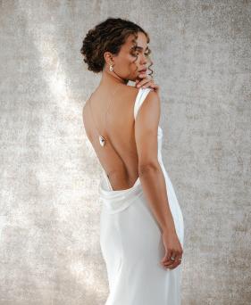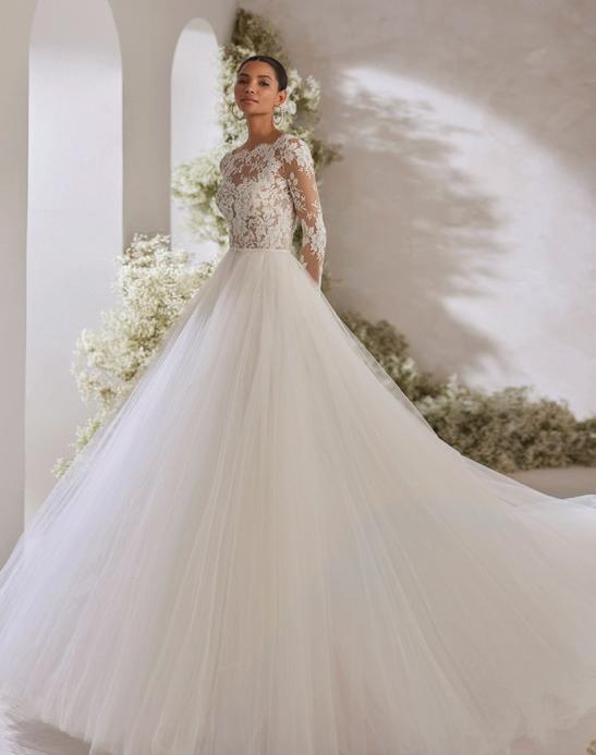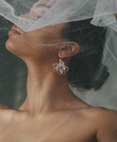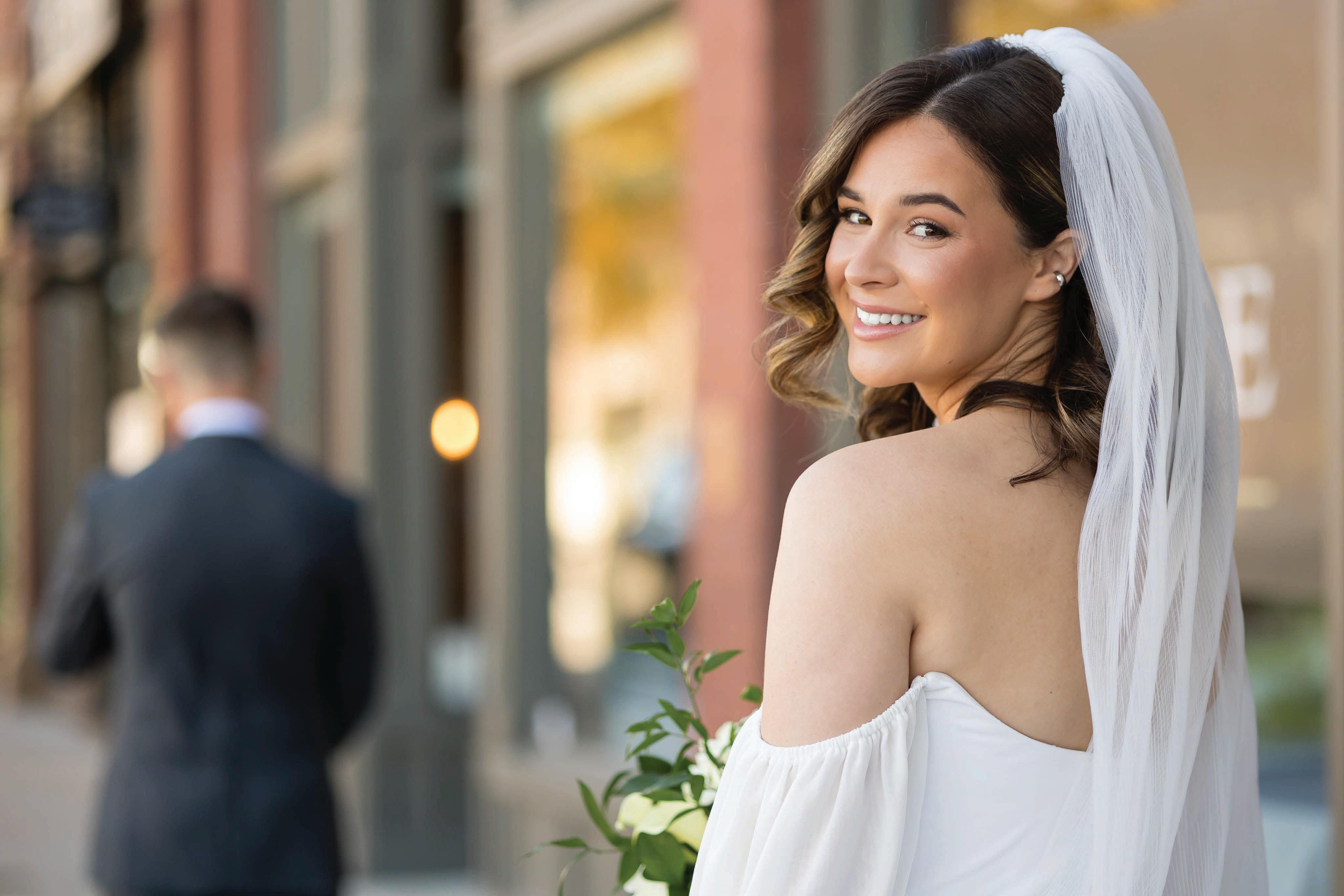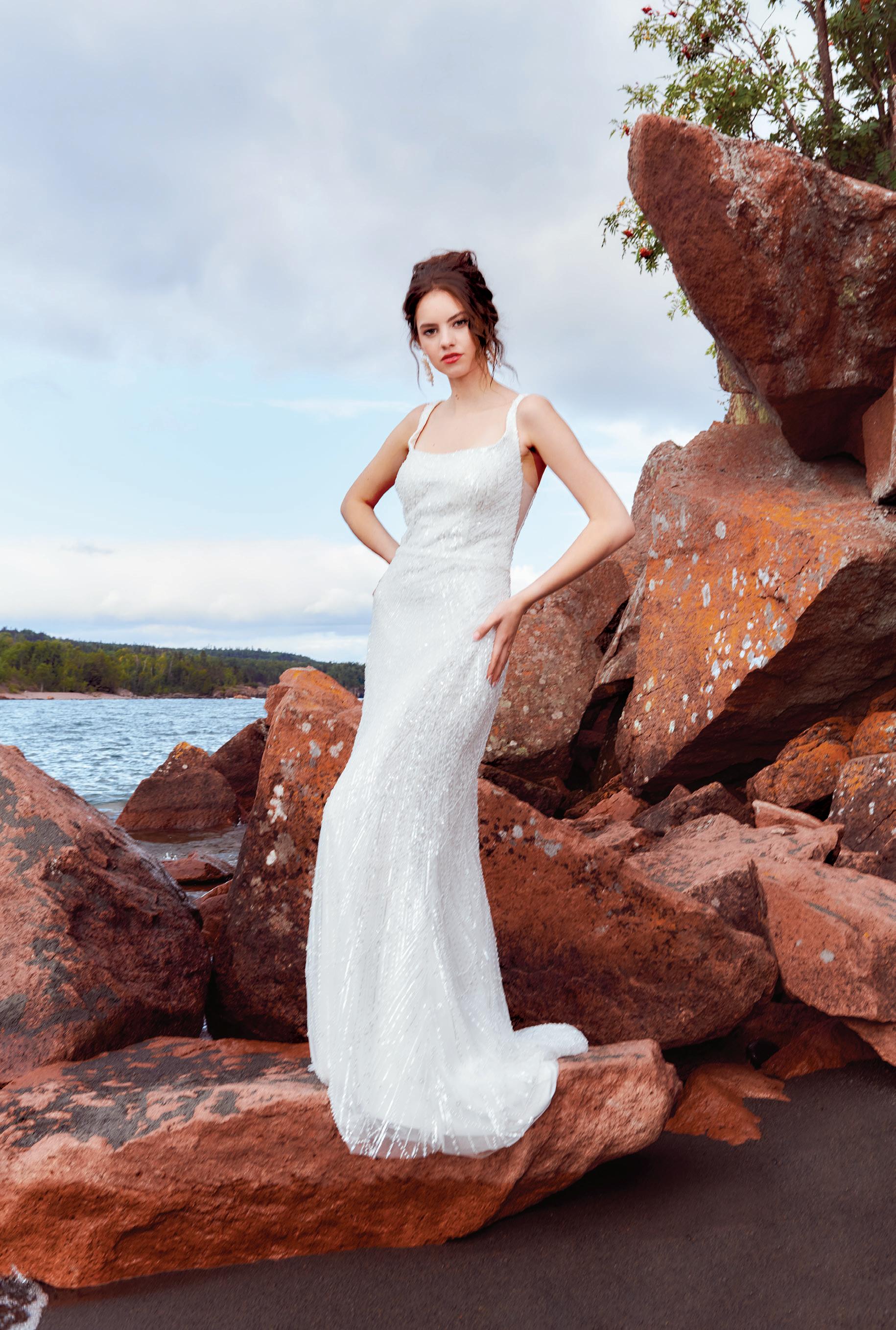 “Sandrine” gown by Elly Sofocli from Loho Bride. “Mimi” earrings by Rileyhaus. Cathedral length tulle veil by Katherine Tash. “Supernova” ring by Jenny Bird. Styled by Sydney Stevens. Hair and makeup by KC Witkamp. Photographed by Jen Lovely. More details on page 100.