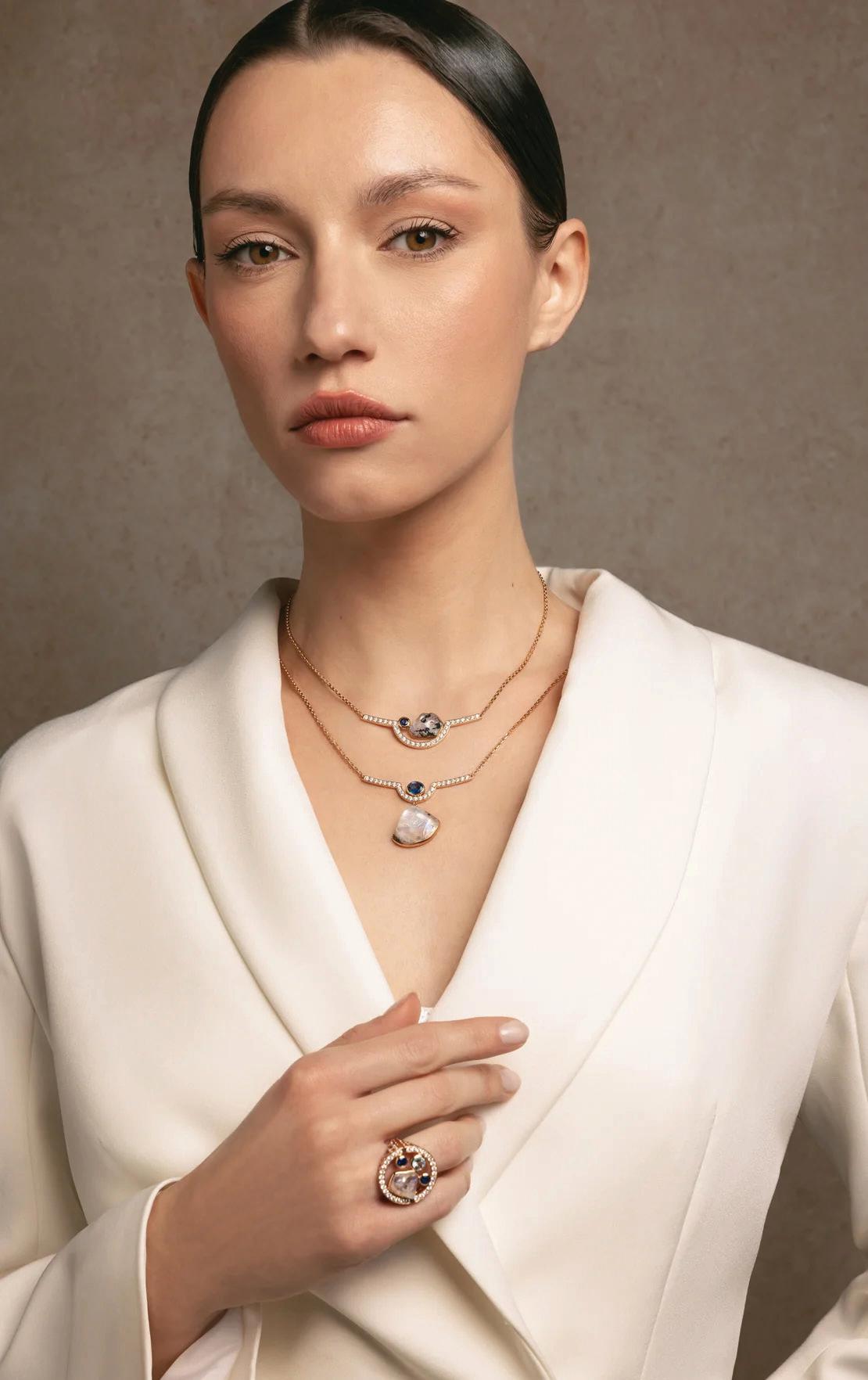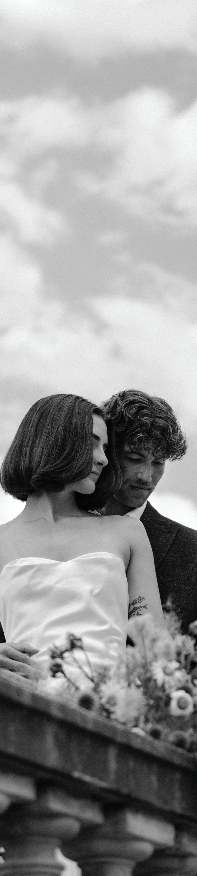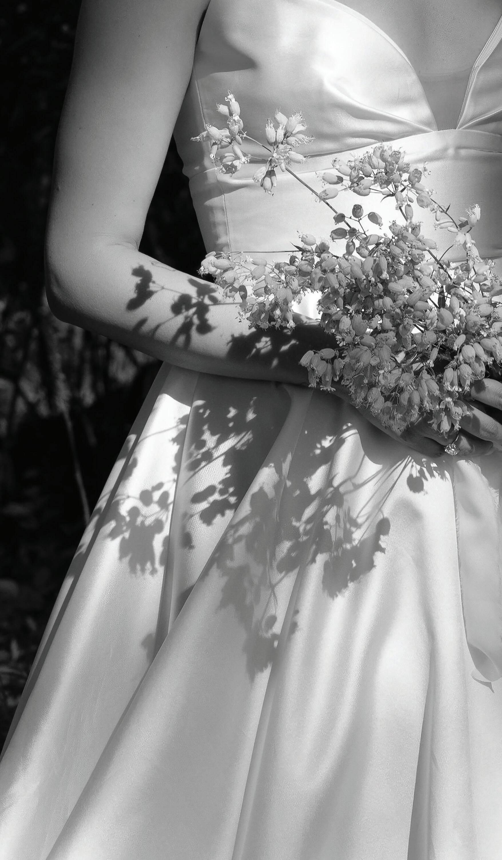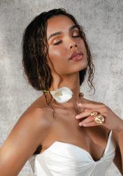 “Sandrine” gown by Elly Sofocli from Loho Bride. “Mimi” earrings by Rileyhaus. Cathedral length tulle veil by Katherine Tash. “Supernova” ring by Jenny Bird. Styled by Sydney Stevens. Hair and makeup by KC Witkamp. Photographed by Jen Lovely. More details on page 100.