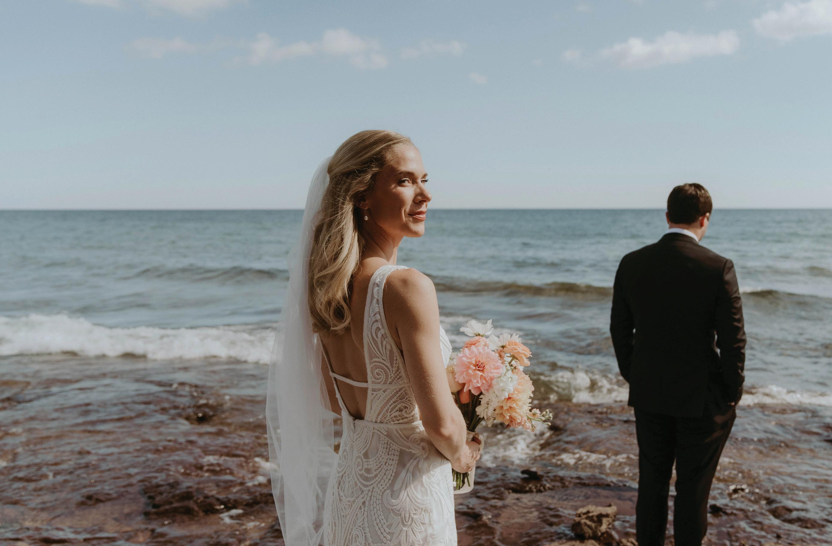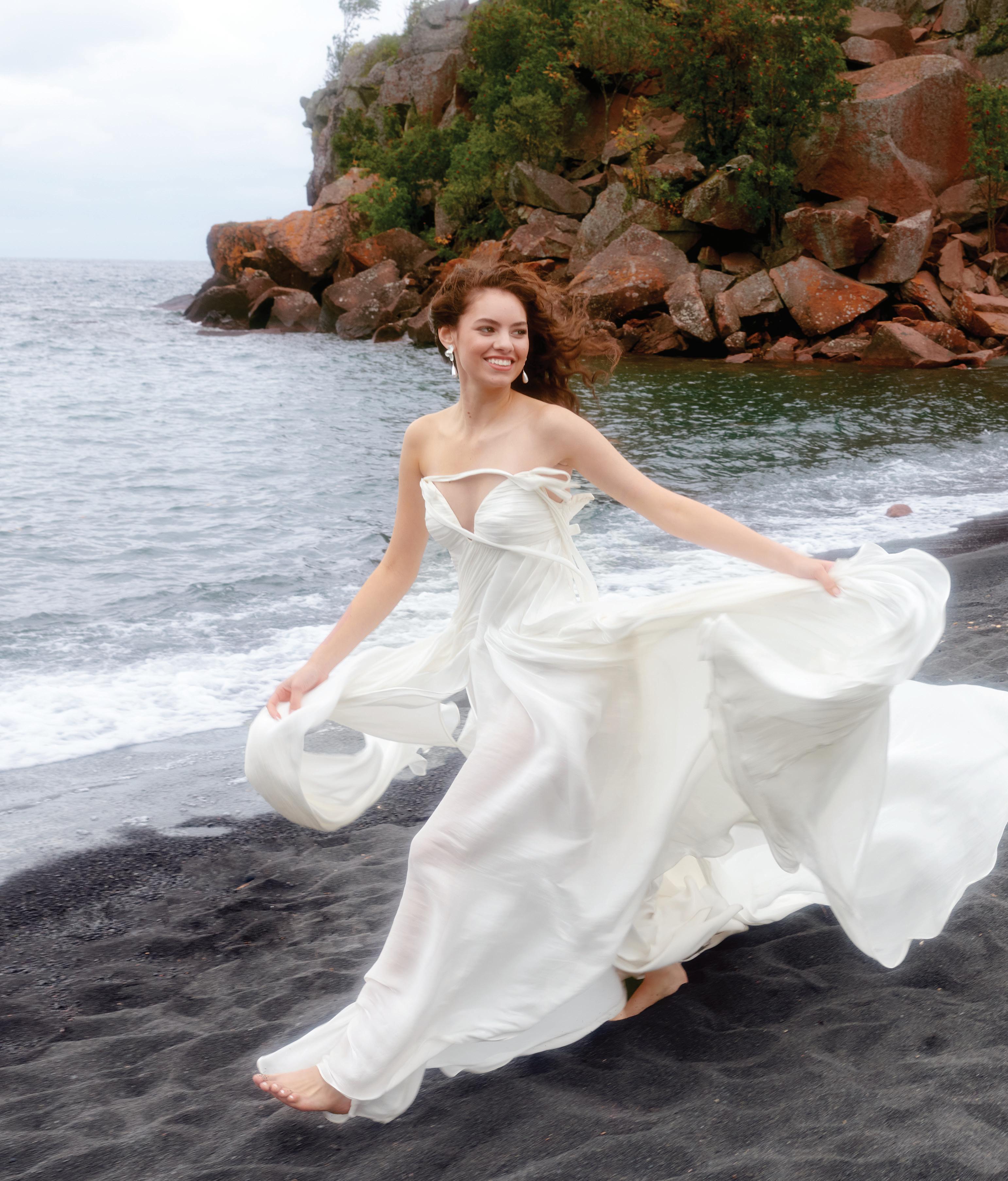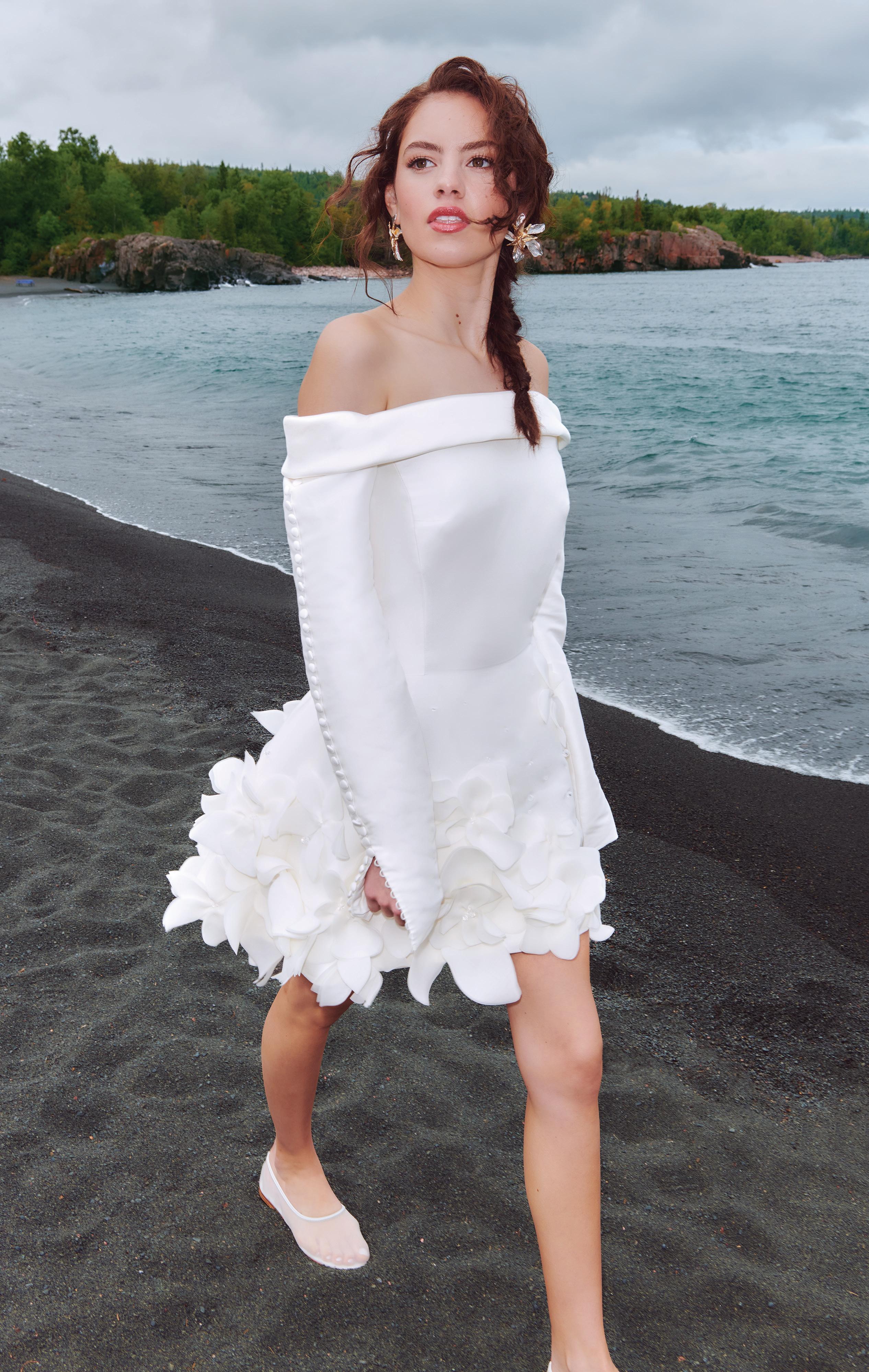 A series of bridal looks evoke sophistication on the shores of Black Beach.