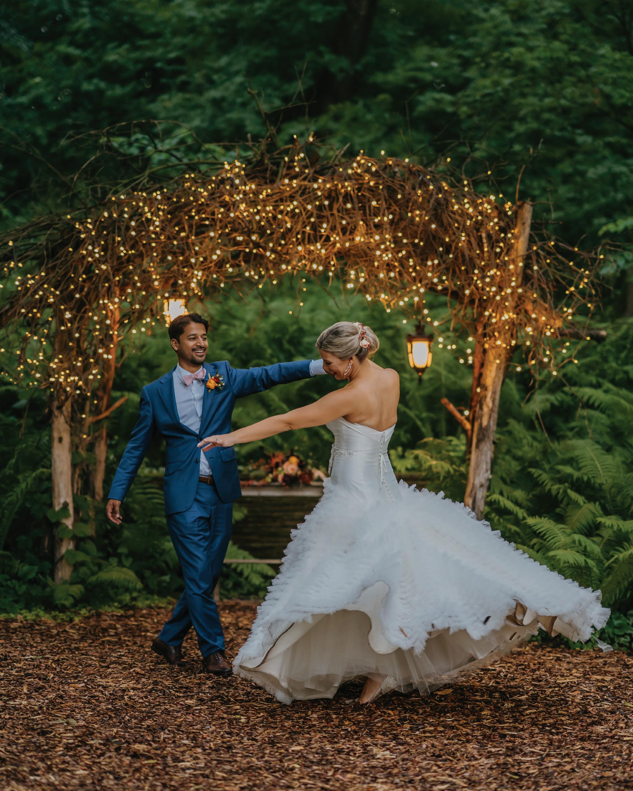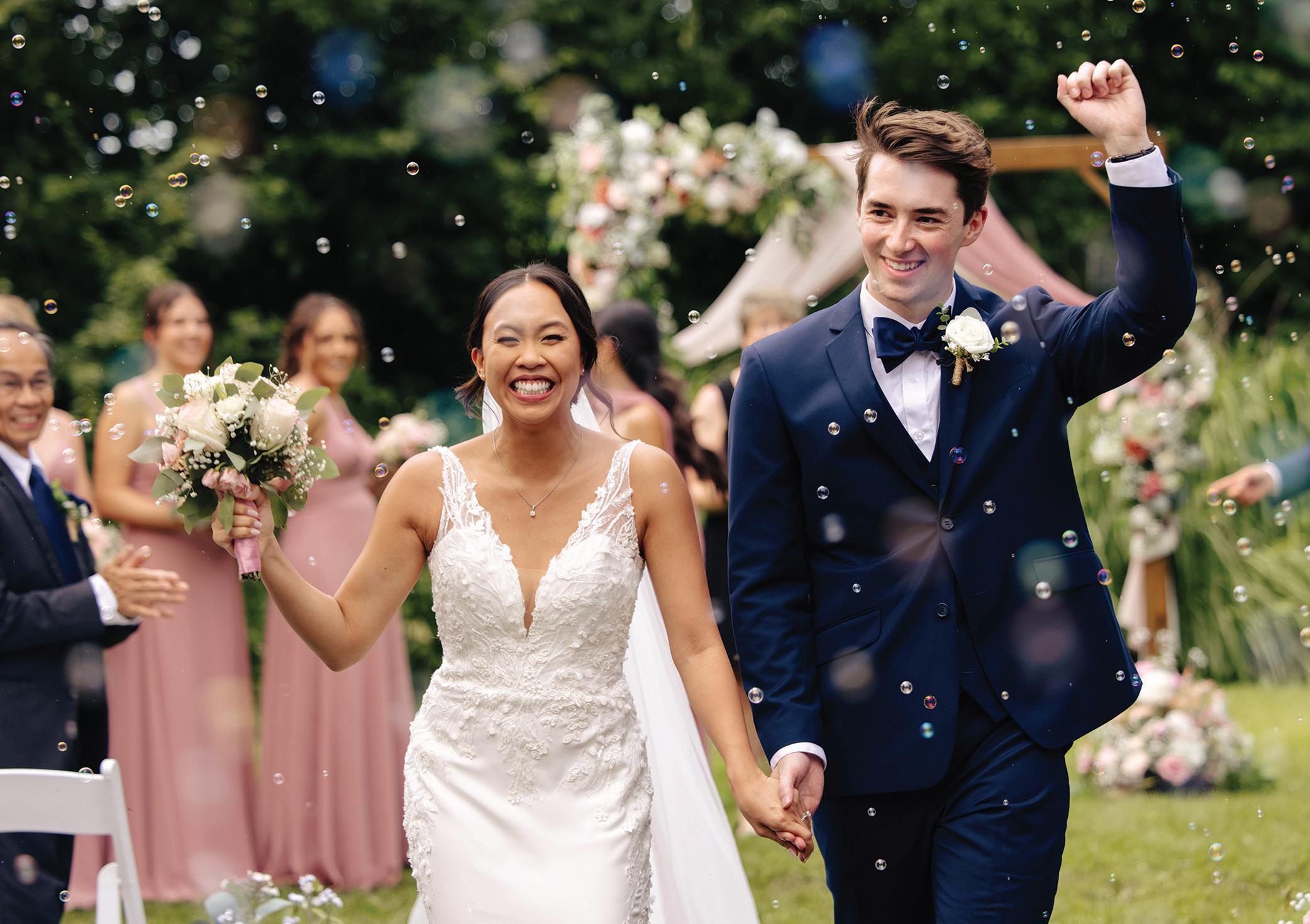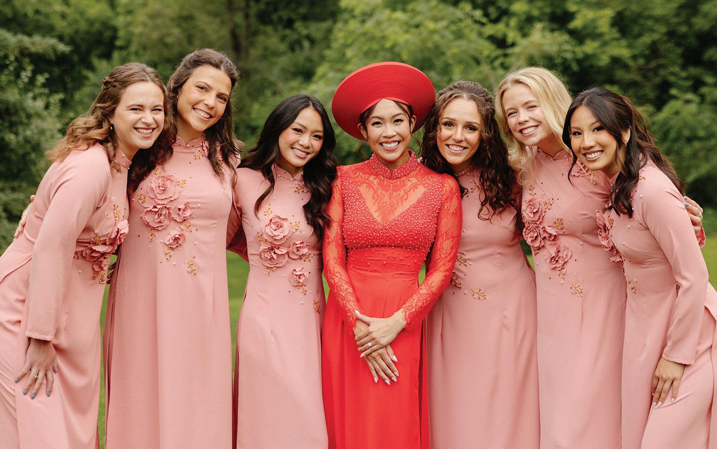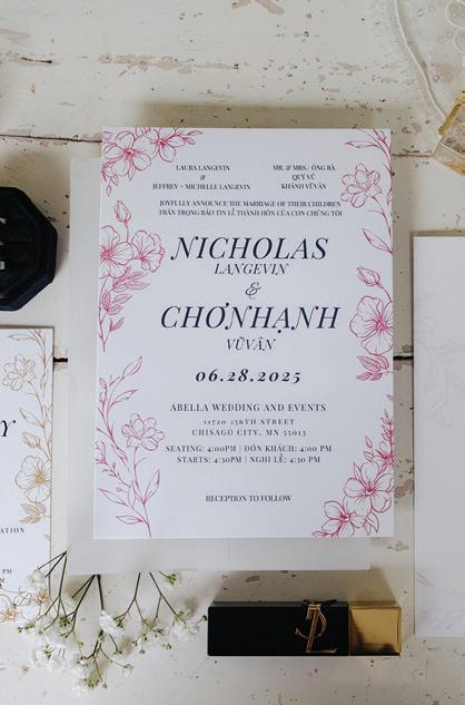 Chonhanh and Nicholas’s wedding weekend beautifully combined Vietnamese and American traditions into one meaningful celebration. The festivities began on Friday morning with a traditional Vietnamese Tea Ceremony, where the couple honored ancestors and received blessings and advice from immediate family and, most importantly, offered tea to their parents and elders as a gesture of gratitude. Proceeding that was a traditional Vietnamese Le Cuoi—held at a Buddhist temple and led by a monk—where the couple exchanged vows, offered prayers to honor their ancestors and received blessings surrounded by family and friends. Vibrant red and gold décor filled the space with warmth and symbolism, while the bride and groom, dressed in traditional áo dài, shared tea with their parents and elders as a gesture of gratitude. The day ended with a buffet of homemade Vietnamese vegetarian dishes—perfectly representing both heritage and hospitality. On Saturday, the couple hosted a Western alfresco ceremony and reception inspired by modern elegance and soft, romantic tones. The open-air ceremony took place beneath a wooden arch adorned with cascading blooms, surrounded by a beautifully lush woodland scene. Inside the airy reception space, long farmhouse tables were adorned in blush runners and centerpieces of roses, greenery and baby’s breath—all lovingly handcrafted by the bride’s mother and family. As the night went on, the couple slipped away for a few quiet minutes beneath the string lights, taking in the sight of their friends and family dancing together. Their advice for other couples: “Embrace your traditions, infuse your personalities into every detail and take time to savor each moment.” — Megan Simpson Teeter