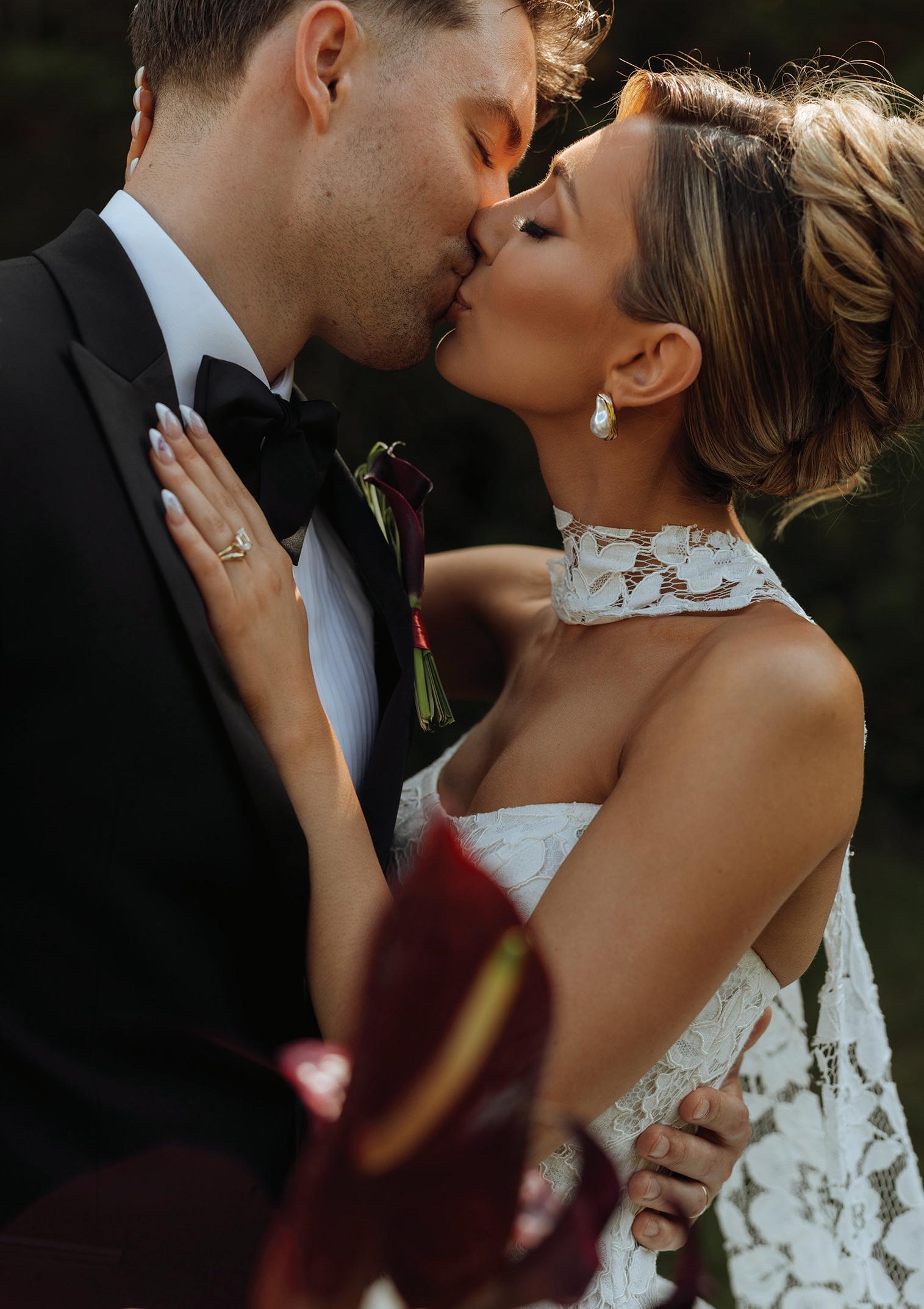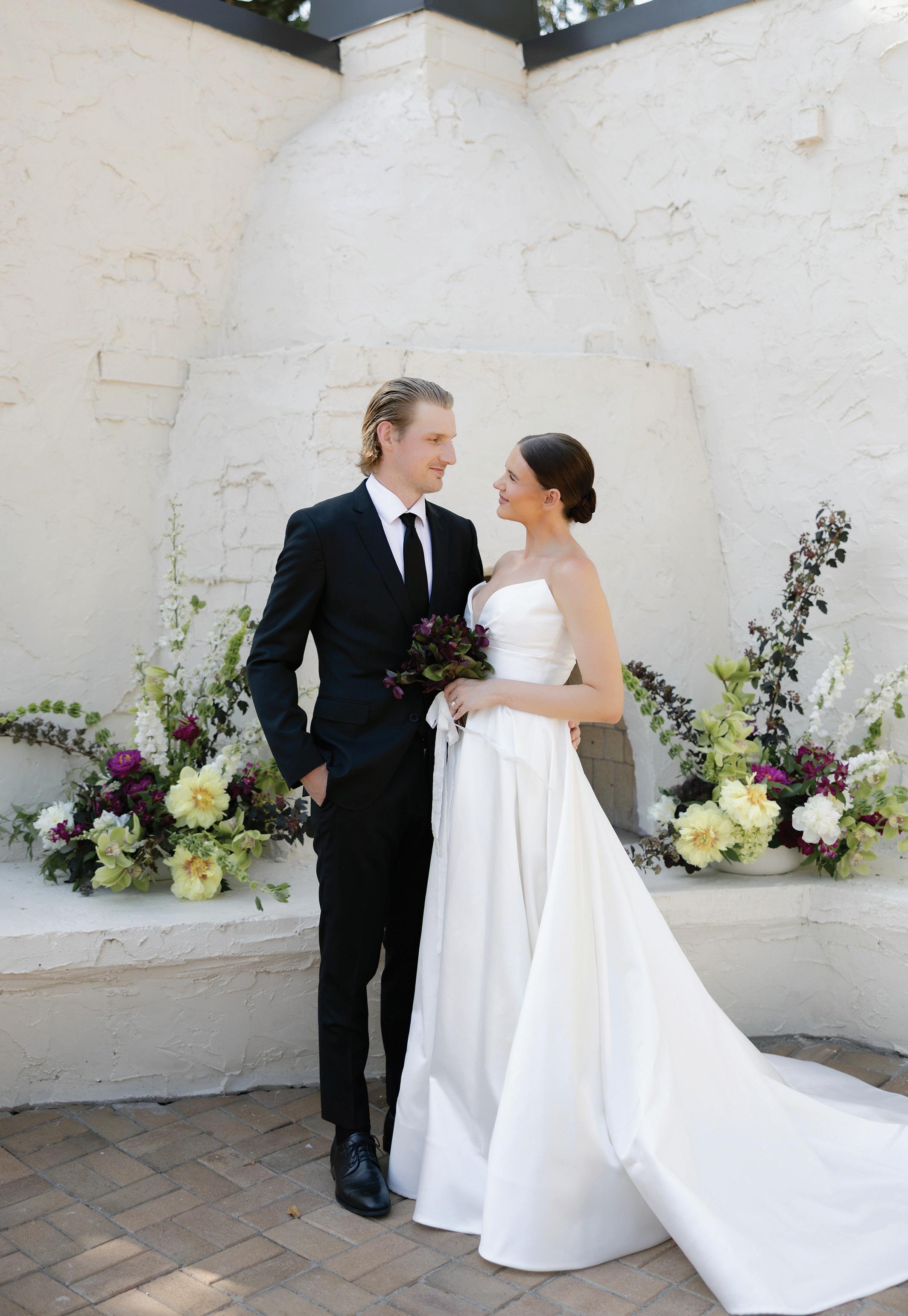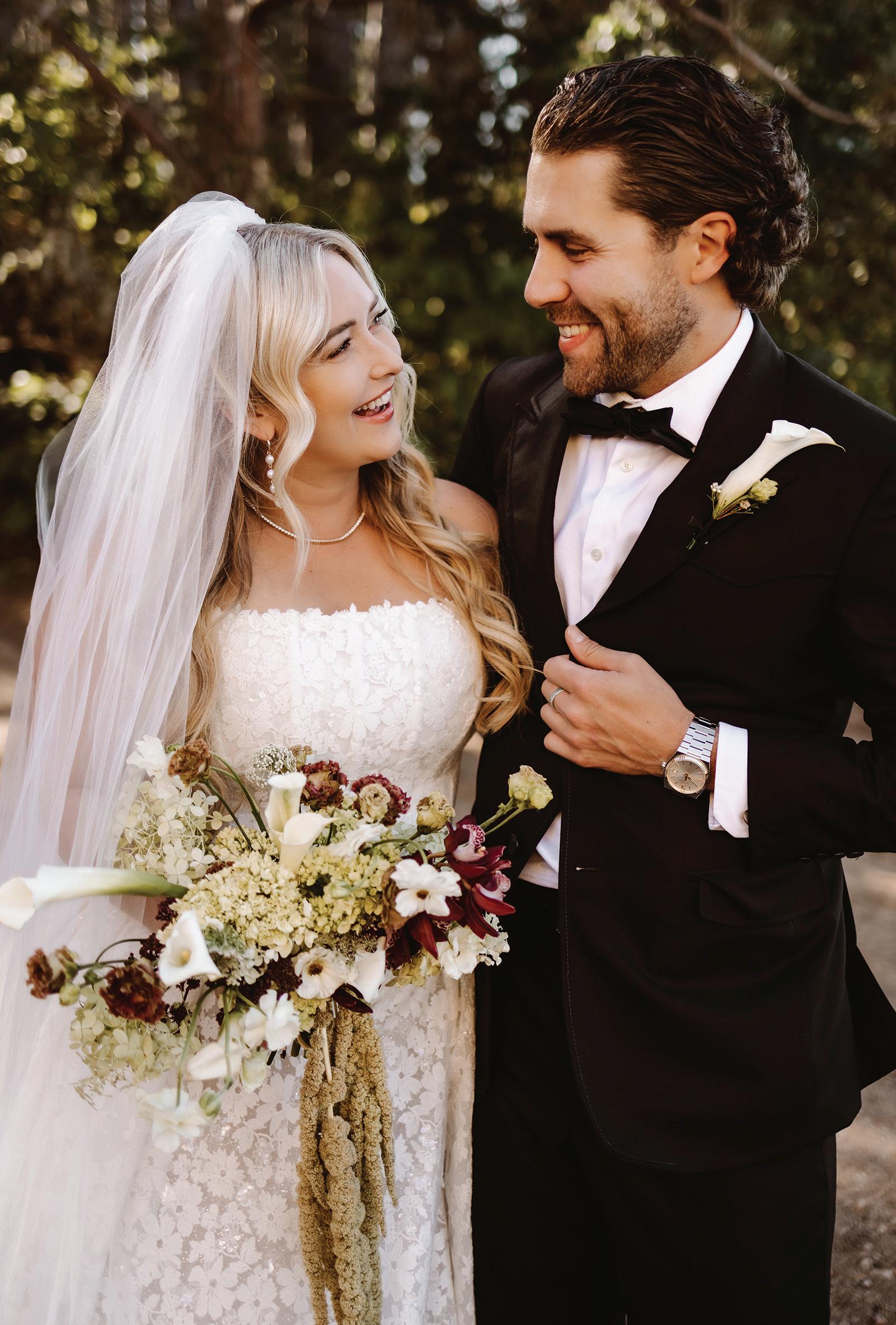 Gown from The White Room. Suit from Hugo Boss. Bouquet by Apricot Floral. Hair by Manes by Annie. Makeup by Beauty By LC. Produced and designed by Collected & Co. Photographed by Loui Photography at Woodland Glasshaus at Bavaria Downs. More details on page 108.