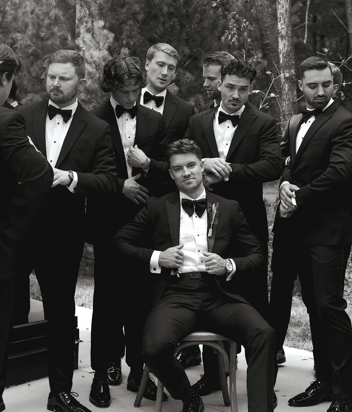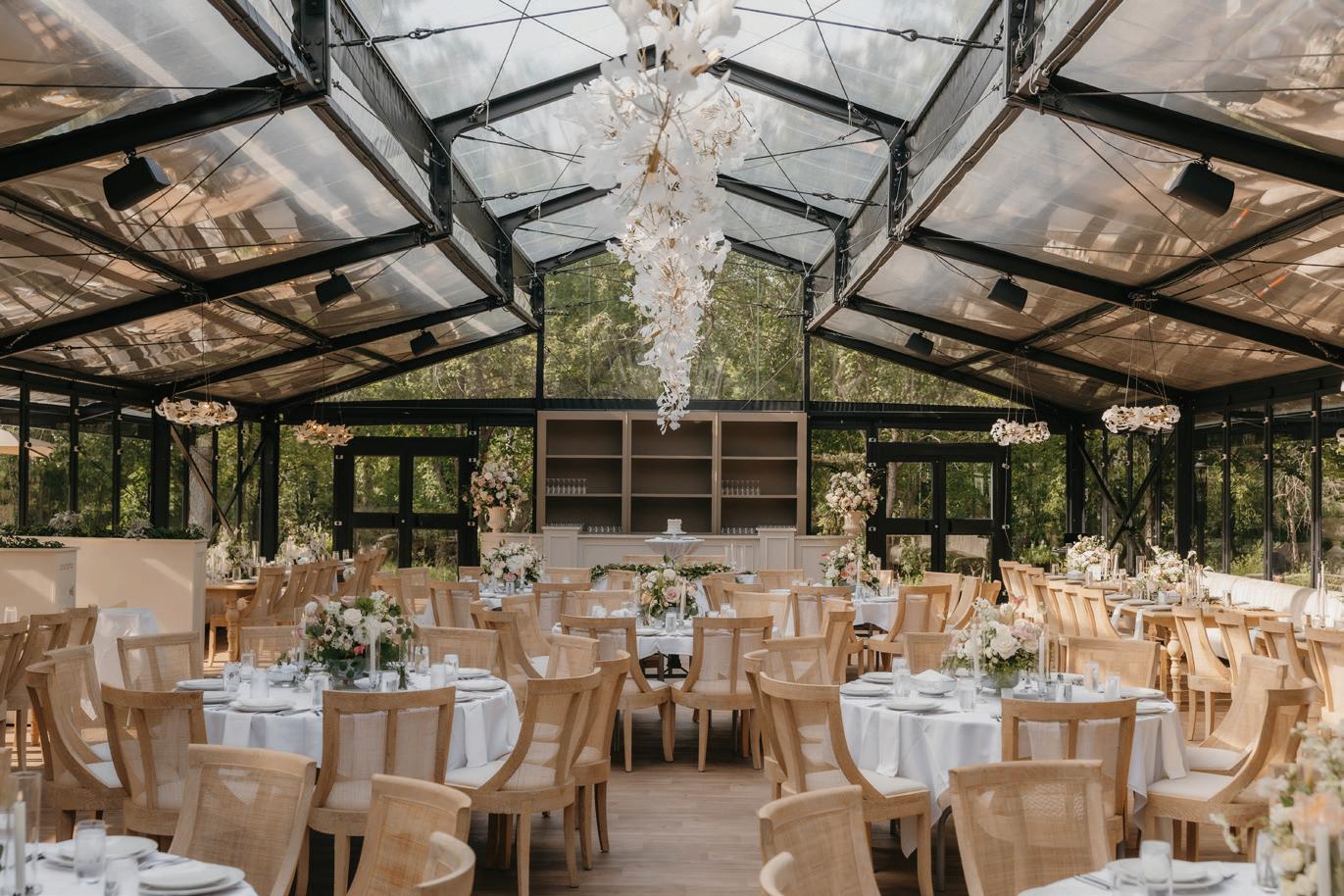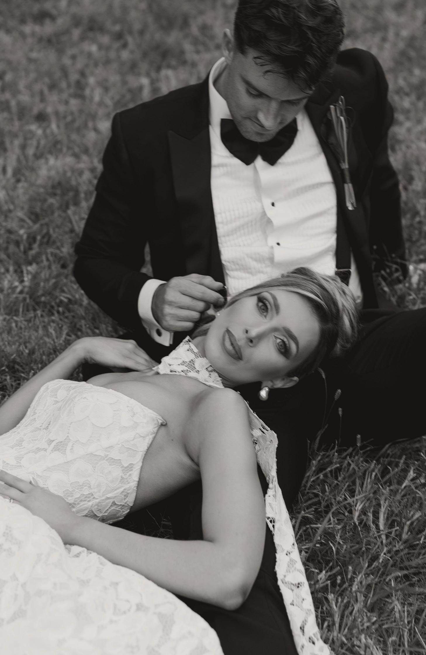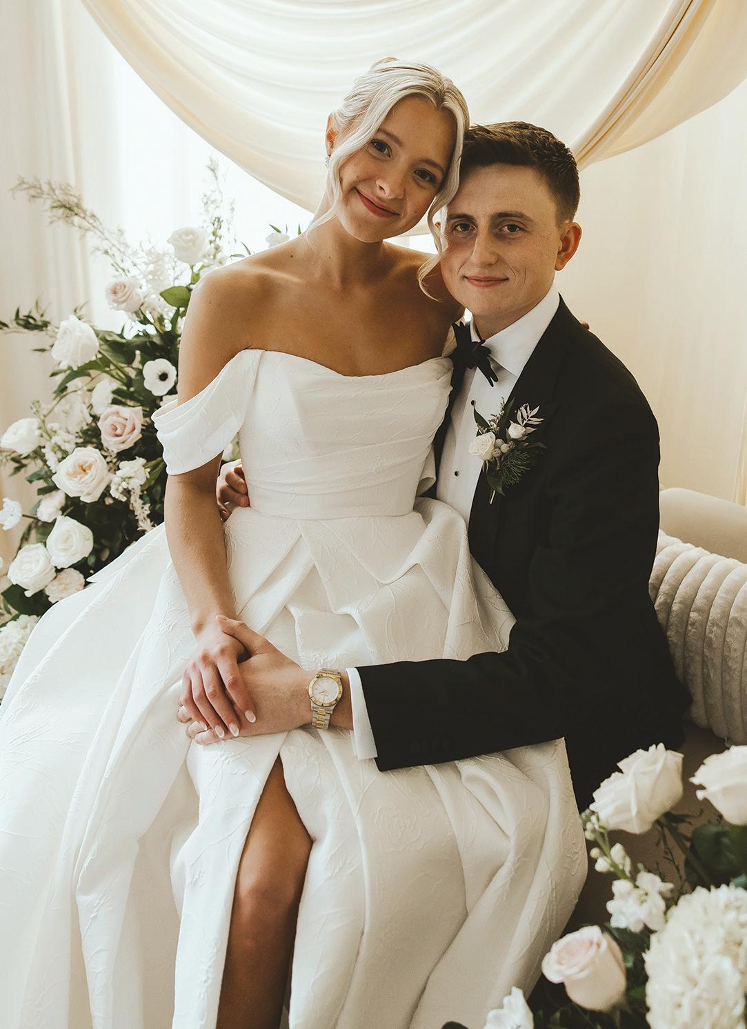 Gown from The White Room. Suit from Hugo Boss. Bouquet by Apricot Floral. Hair by Manes by Annie. Makeup by Beauty By LC. Produced and designed by Collected & Co. Photographed by Loui Photography at Woodland Glasshaus at Bavaria Downs. More details on page 108.