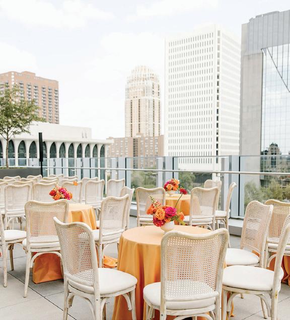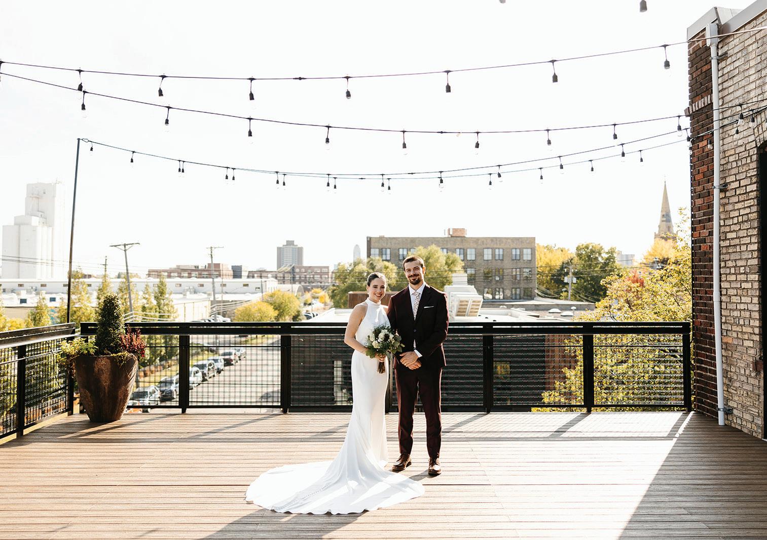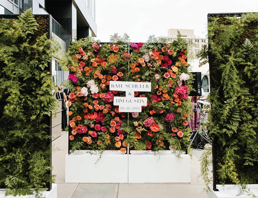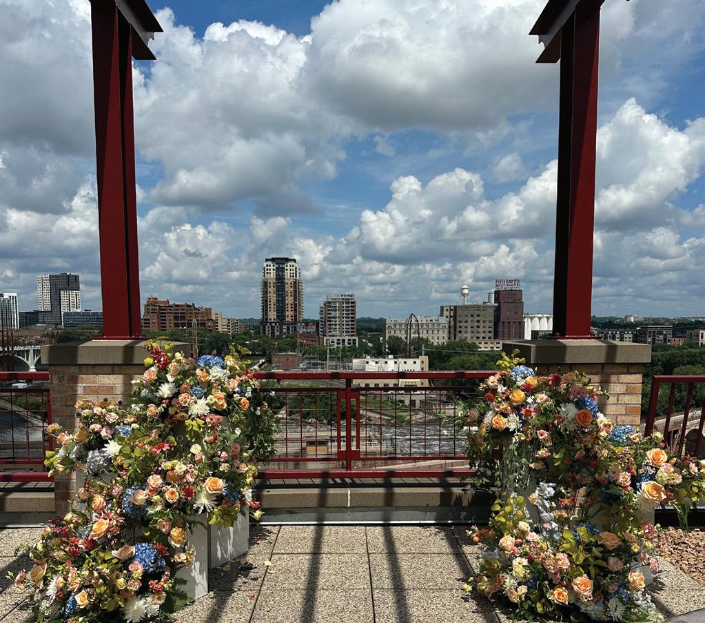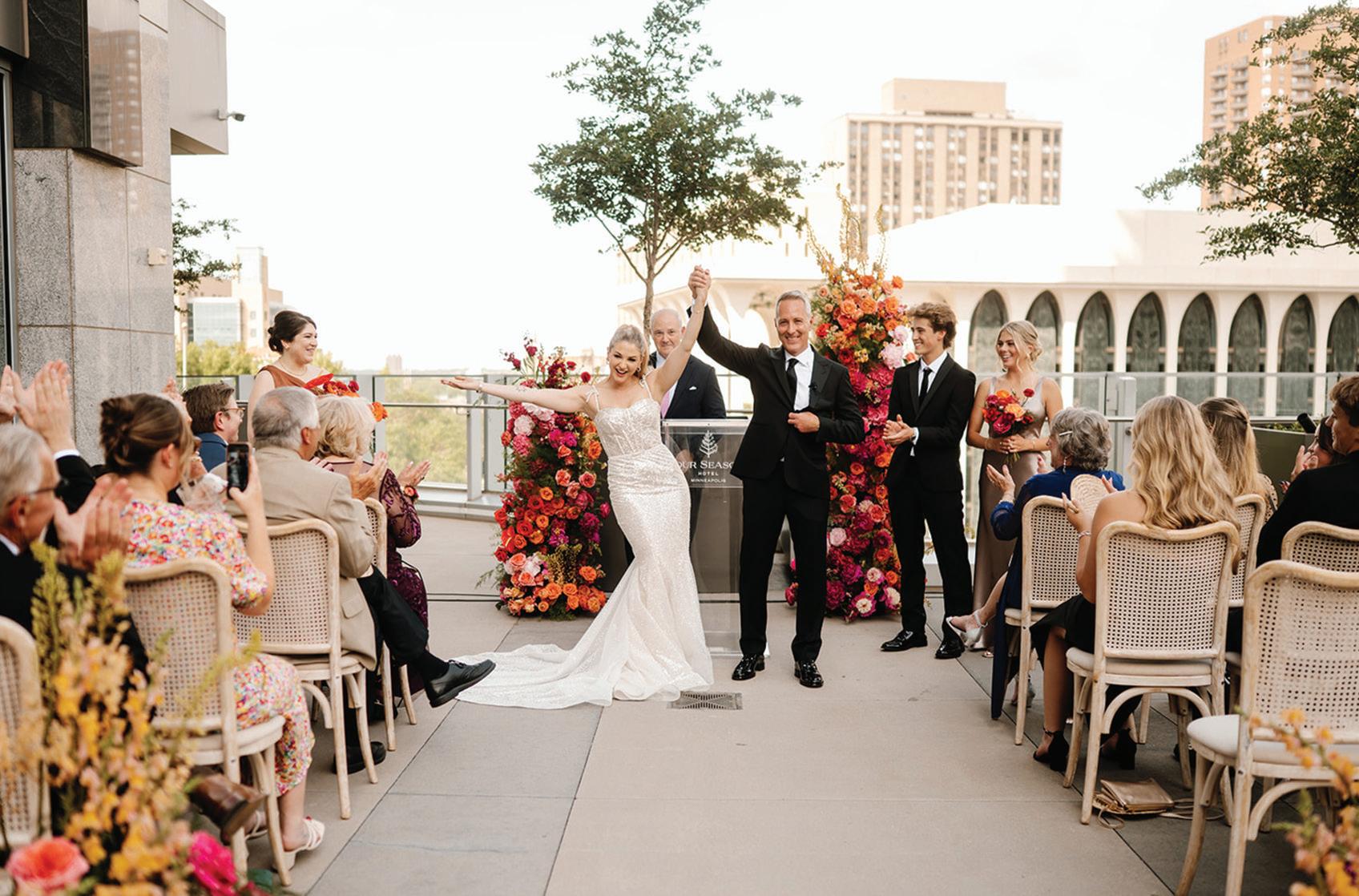 Kate and Tim had three things they were absolutely set on for their wedding day: vivid florals, live music and a memorable dining experience. Having met at Martina, a Linden Hills staple, the pair's relationship grew over countless date nights filled with food, drinks and time with their favorite people—an element they sought to reflect in their celebration. The Four Seasons Hotel Minneapolis was an obvious choice for the couple with its outdoor area ideal for a grand ceremony and its renowned restaurant, Mara, serving as the intimate counterpart for the reception. Inspired by the French Riviera, vibrant-hued blooms graced the rooftop space. Lush bundles of nontraditional stems lined the aisle and altar, creating an elegant backdrop against the city skyline. In a stunning, glittering gown and playful high ponytail, Kate pledged her love to Tim surrounded by friends and family. A live Bossa Nova band scored the evening with its modern jazzy vibe. Slipping away for a private moment, Kate and Tim shared a champagne toast at Porzana, sister restaurant to Martina, before joining their guests for dinner and dancing. A retro ambiance welcomed guests to the reception at Mara. Gold accents and burnt orange velvet chairs set the scene for a warm and intimate celebration. Fully immersed in their vision of the perfect wedding day come to life, Kate and Tim rang in their first night as husband and wife with delicious cuisine, a chocolate fountain and lots of love. — Ryley S. Hoff
