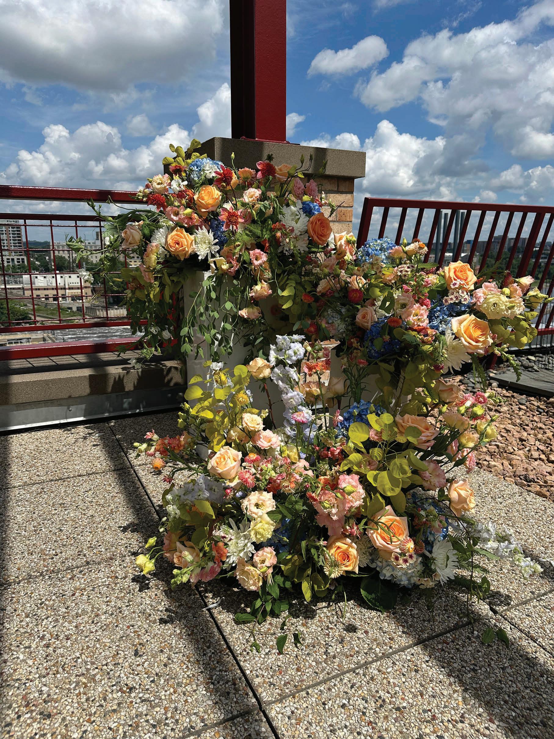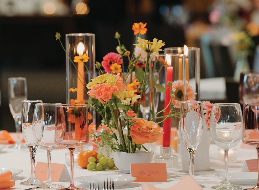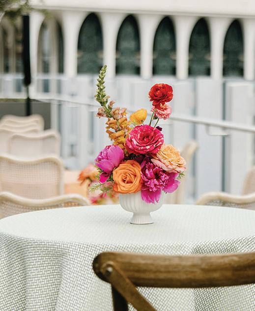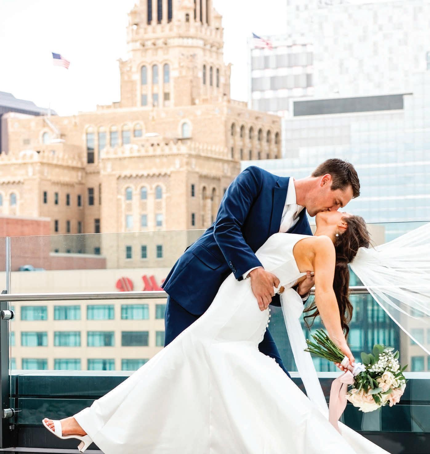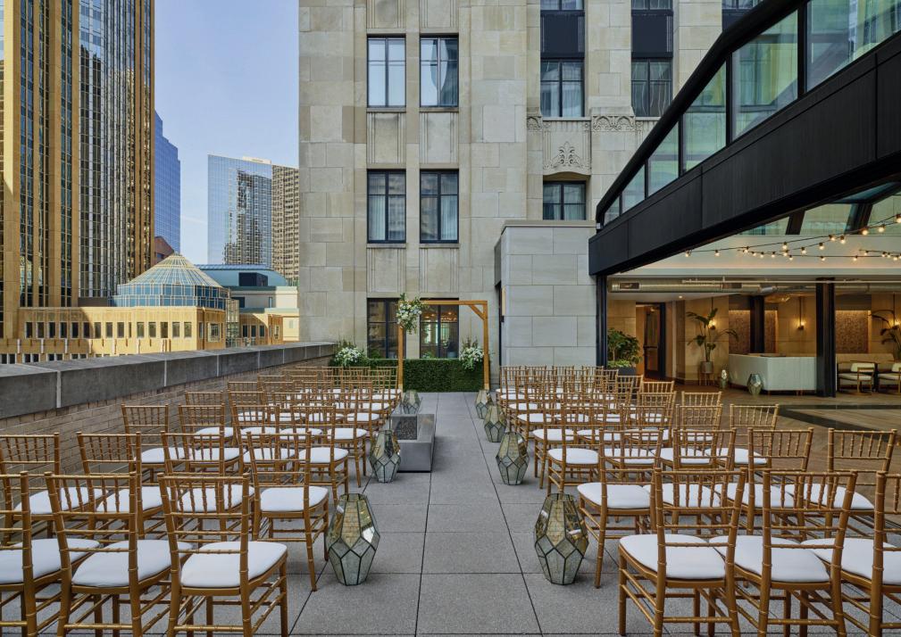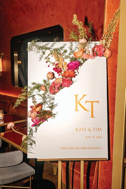 Kate and Tim had three things they were absolutely set on for their wedding day: vivid florals, live music and a memorable dining experience. Having met at Martina, a Linden Hills staple, the pair's relationship grew over countless date nights filled with food, drinks and time with their favorite people—an element they sought to reflect in their celebration. The Four Seasons Hotel Minneapolis was an obvious choice for the couple with its outdoor area ideal for a grand ceremony and its renowned restaurant, Mara, serving as the intimate counterpart for the reception. Inspired by the French Riviera, vibrant-hued blooms graced the rooftop space. Lush bundles of nontraditional stems lined the aisle and altar, creating an elegant backdrop against the city skyline. In a stunning, glittering gown and playful high ponytail, Kate pledged her love to Tim surrounded by friends and family. A live Bossa Nova band scored the evening with its modern jazzy vibe. Slipping away for a private moment, Kate and Tim shared a champagne toast at Porzana, sister restaurant to Martina, before joining their guests for dinner and dancing. A retro ambiance welcomed guests to the reception at Mara. Gold accents and burnt orange velvet chairs set the scene for a warm and intimate celebration. Fully immersed in their vision of the perfect wedding day come to life, Kate and Tim rang in their first night as husband and wife with delicious cuisine, a chocolate fountain and lots of love. — Ryley S. Hoff