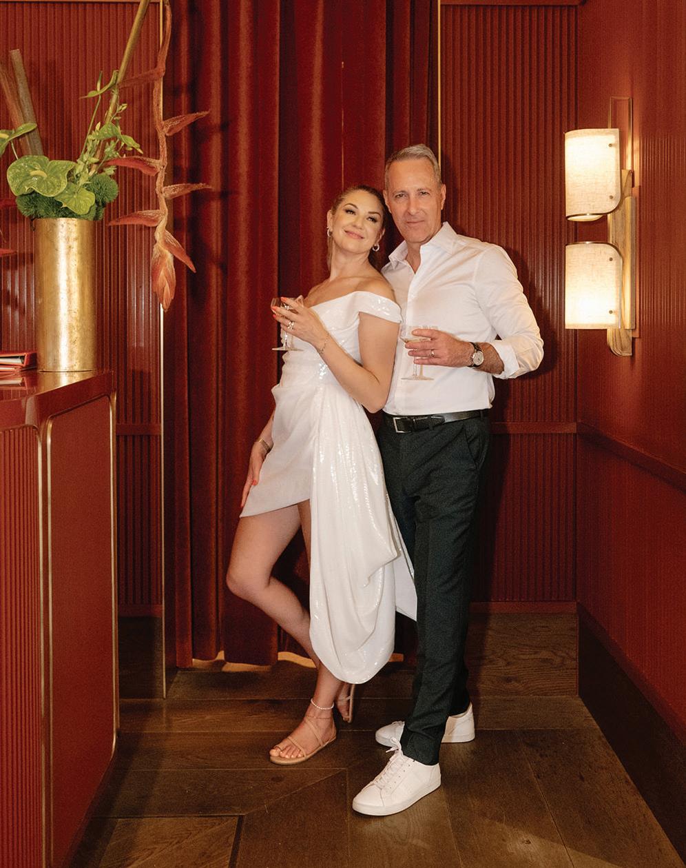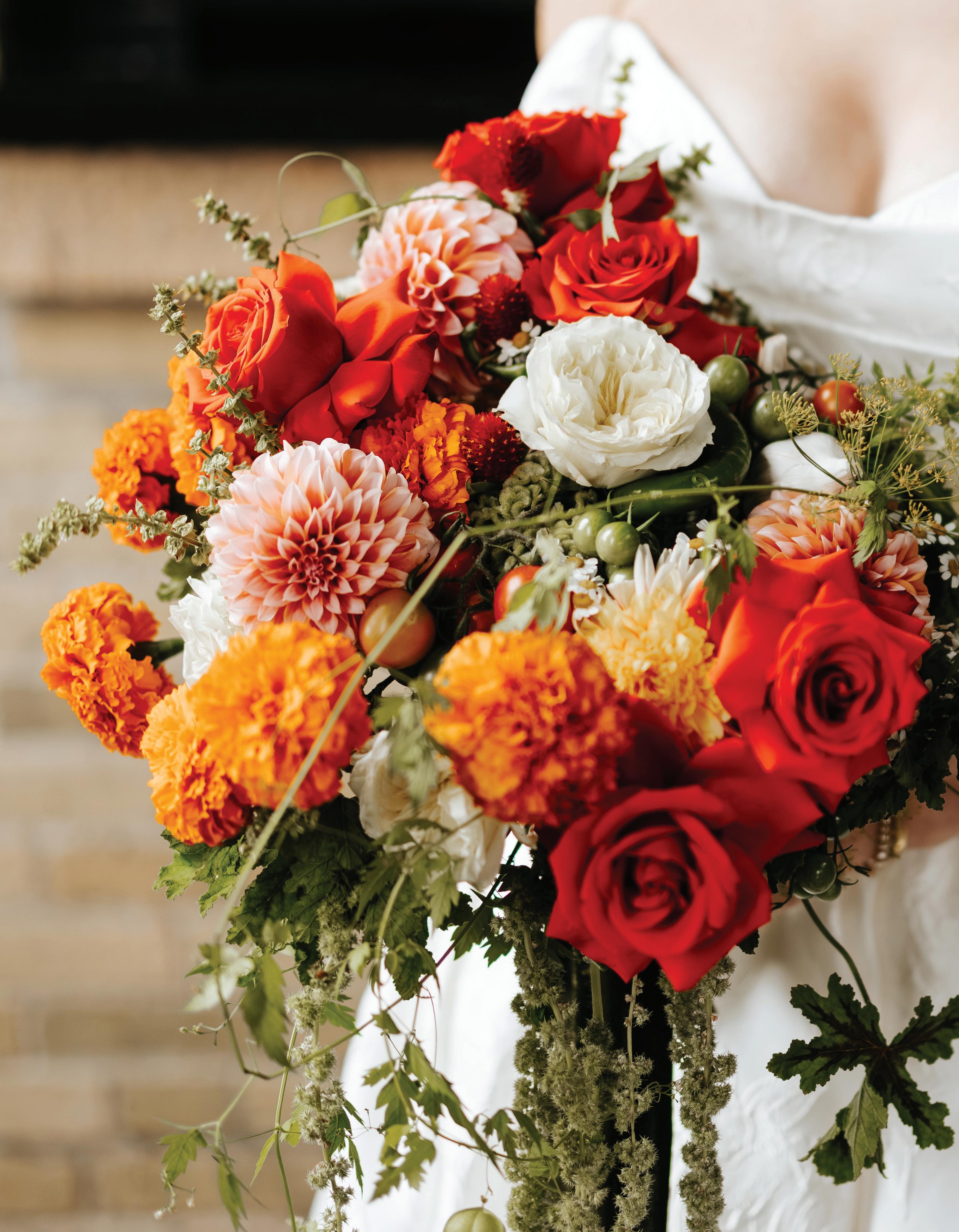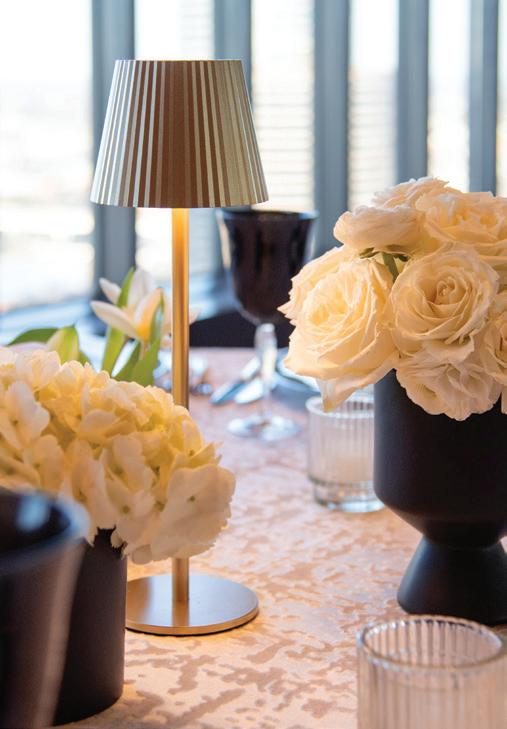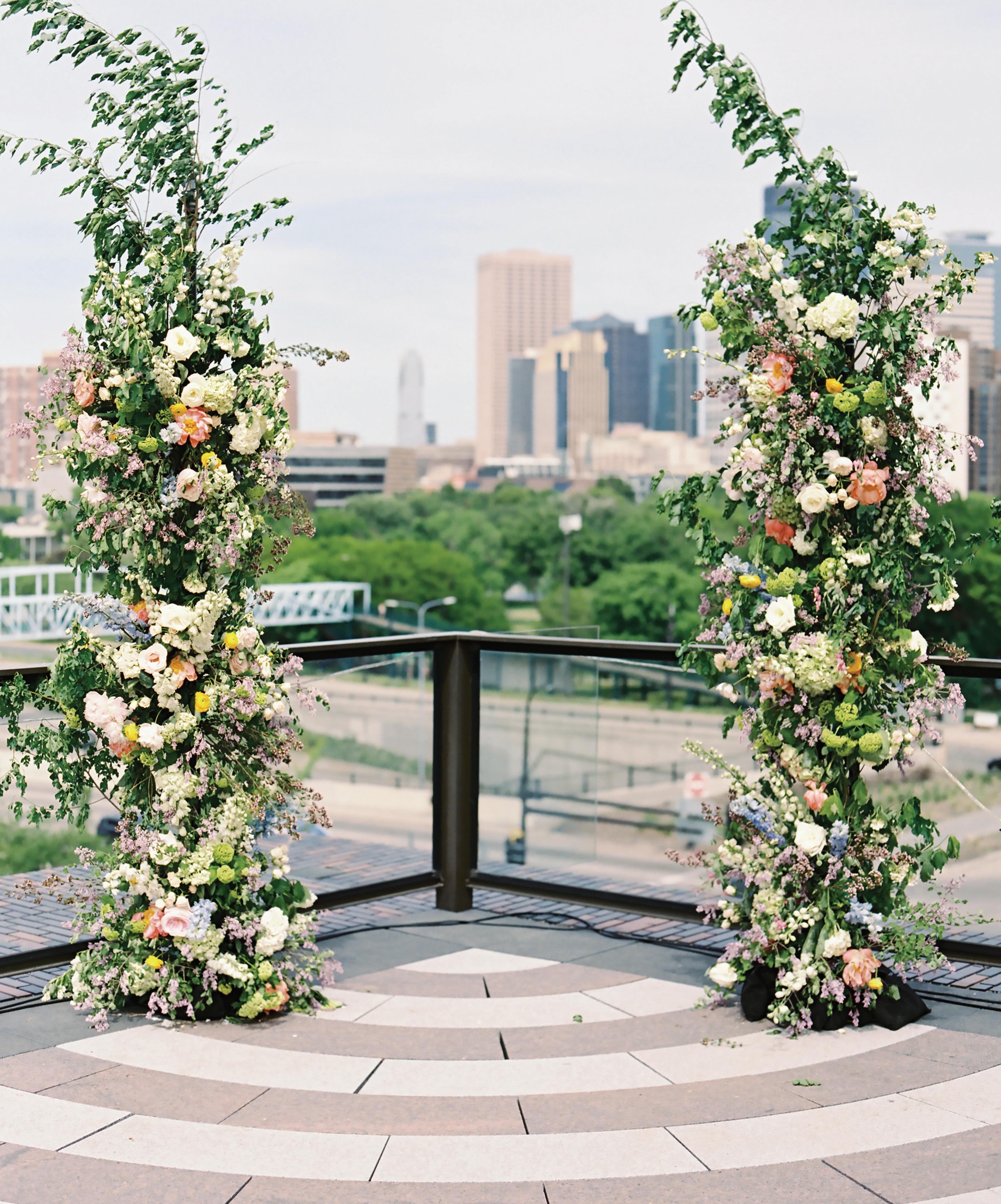 Kate and Tim had three things they were absolutely set on for their wedding day: vivid florals, live music and a memorable dining experience. Having met at Martina, a Linden Hills staple, the pair's relationship grew over countless date nights filled with food, drinks and time with their favorite people—an element they sought to reflect in their celebration. The Four Seasons Hotel Minneapolis was an obvious choice for the couple with its outdoor area ideal for a grand ceremony and its renowned restaurant, Mara, serving as the intimate counterpart for the reception. Inspired by the French Riviera, vibrant-hued blooms graced the rooftop space. Lush bundles of nontraditional stems lined the aisle and altar, creating an elegant backdrop against the city skyline. In a stunning, glittering gown and playful high ponytail, Kate pledged her love to Tim surrounded by friends and family. A live Bossa Nova band scored the evening with its modern jazzy vibe. Slipping away for a private moment, Kate and Tim shared a champagne toast at Porzana, sister restaurant to Martina, before joining their guests for dinner and dancing. A retro ambiance welcomed guests to the reception at Mara. Gold accents and burnt orange velvet chairs set the scene for a warm and intimate celebration. Fully immersed in their vision of the perfect wedding day come to life, Kate and Tim rang in their first night as husband and wife with delicious cuisine, a chocolate fountain and lots of love. — Ryley S. Hoff