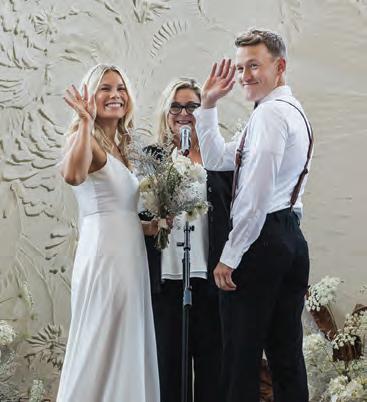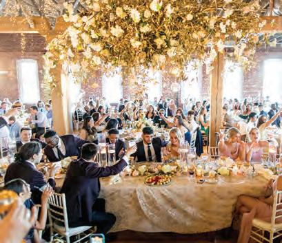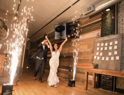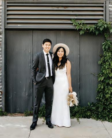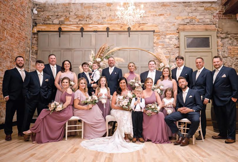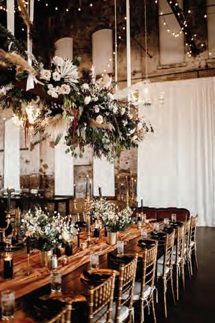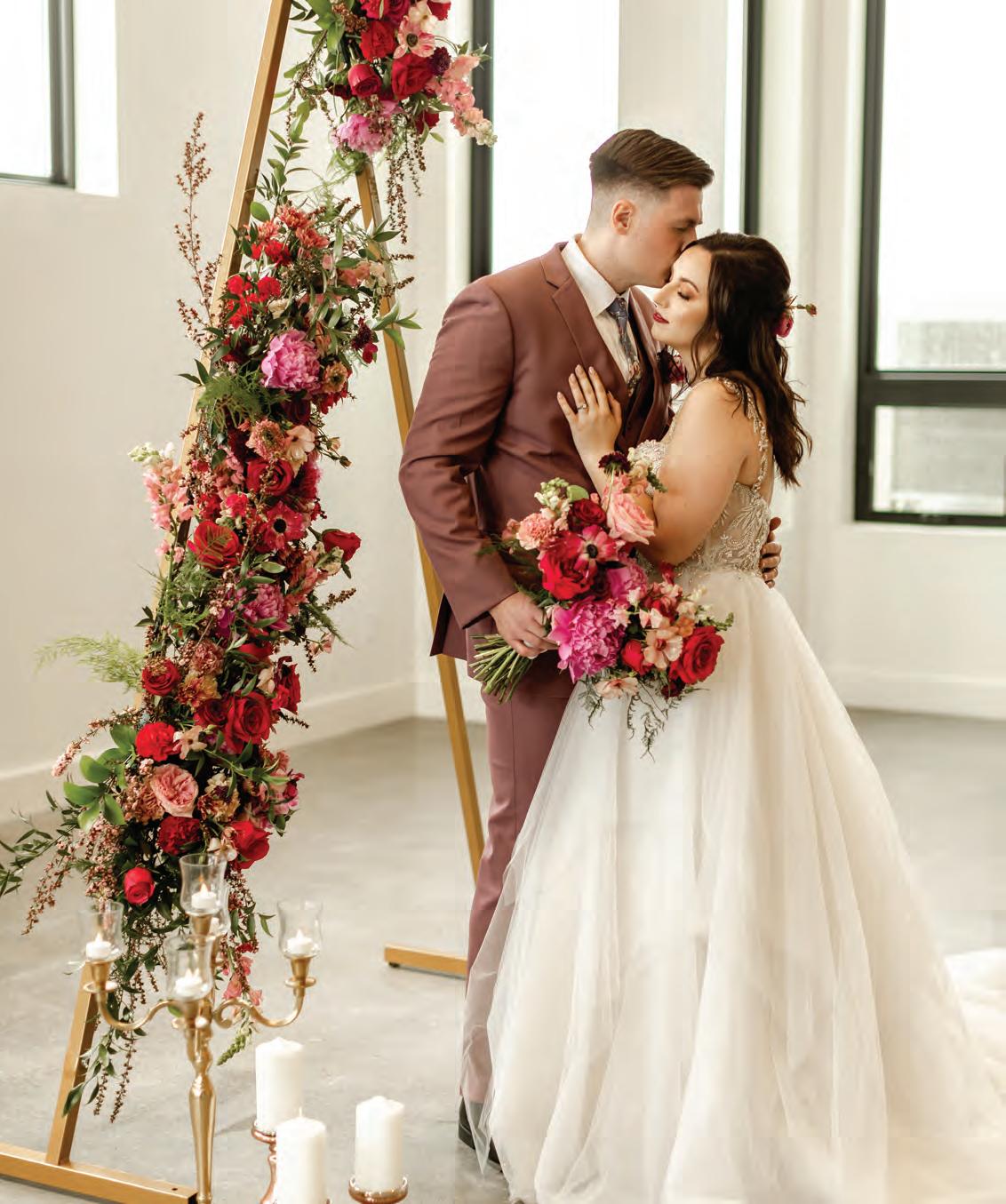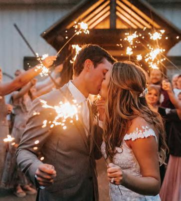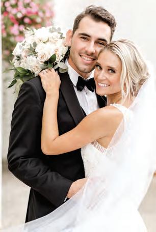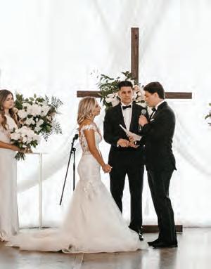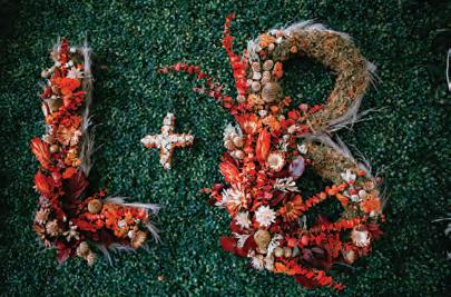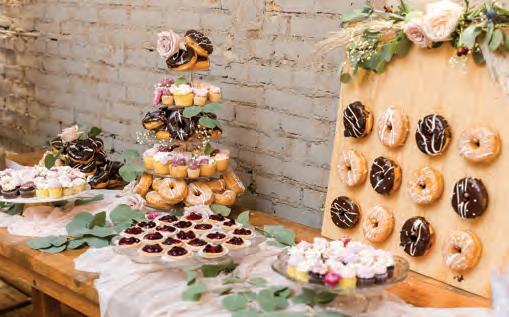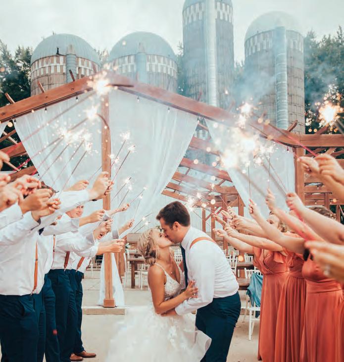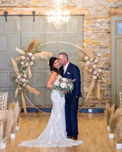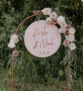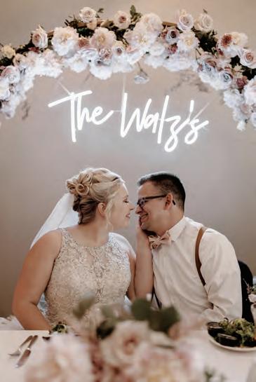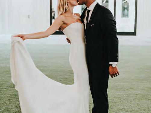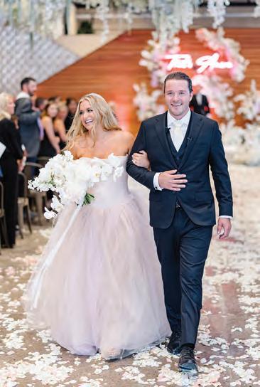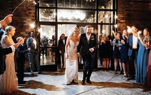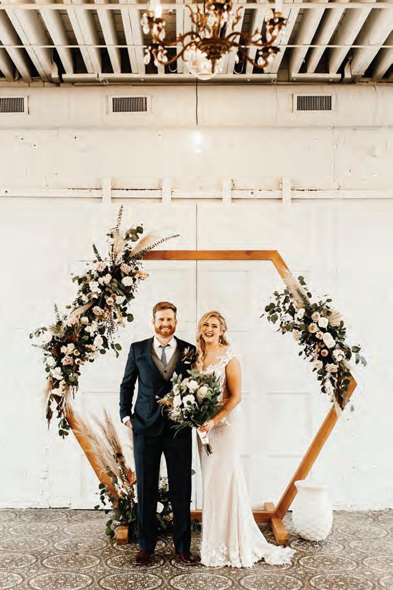 law officiated, his sisters were bridesmaids and his sons were groomsmen. Adena’s favorite moments were walking down the aisle with her new stepsons and hearing the cheers after the couple’s first kiss, making it all feel official. A wedding planner herself, the bride filled the space with gold accents, pampas grass and greenery, complete with a ceremony arch and doughnut wall. Sparkler fountains made a bright beginning to a night full of dancing and celebration.