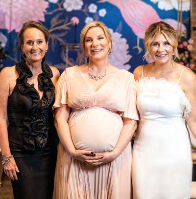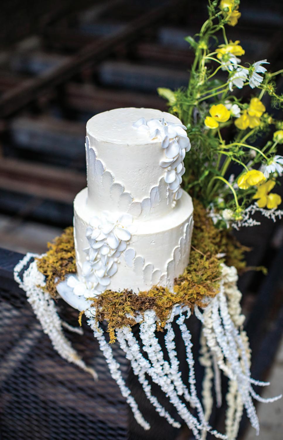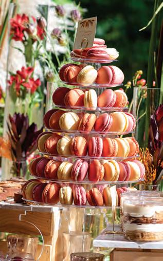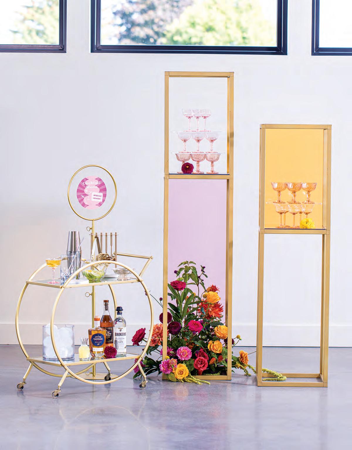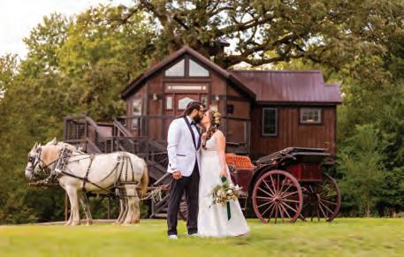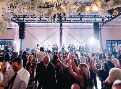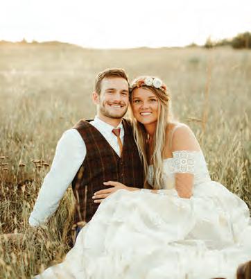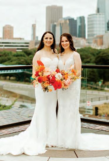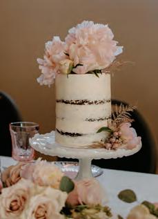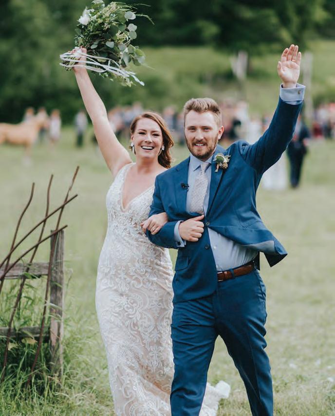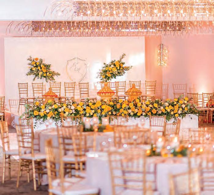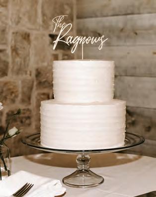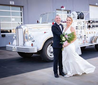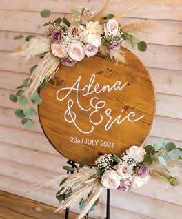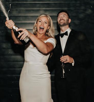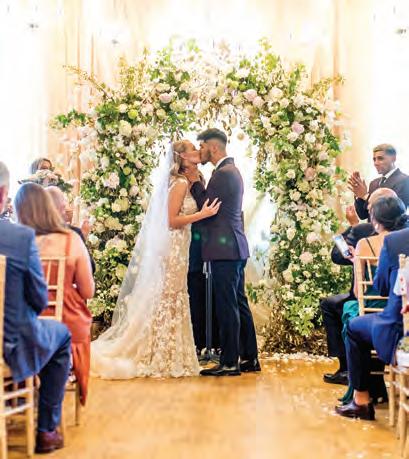 law officiated, his sisters were bridesmaids and his sons were groomsmen. Adena’s favorite moments were walking down the aisle with her new stepsons and hearing the cheers after the couple’s first kiss, making it all feel official. A wedding planner herself, the bride filled the space with gold accents, pampas grass and greenery, complete with a ceremony arch and doughnut wall. Sparkler fountains made a bright beginning to a night full of dancing and celebration.