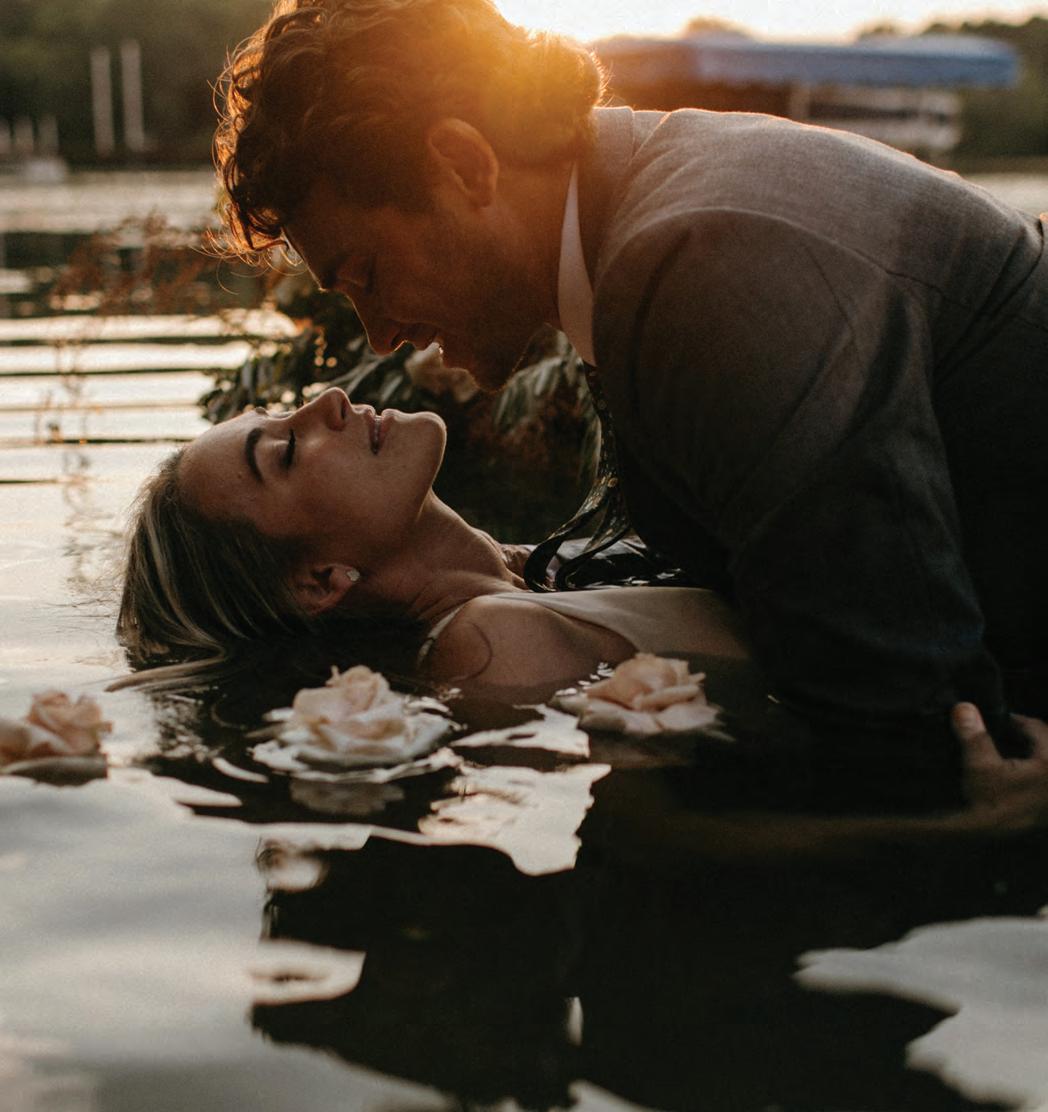 The ineffable beauty of a Minnesota lake at sunset provides the backdrop for a playful portrait of true love.