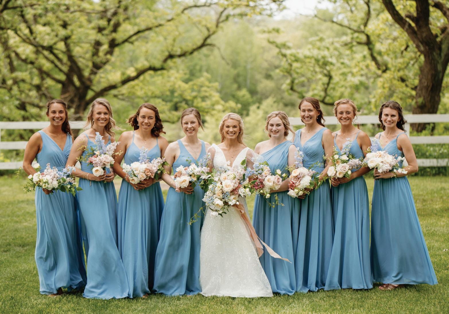 GOWN: Colby John, @colbyjohnbridal; Flutter Bridal Co., @flutterbridalco | BRIDE’S ACCESSORIES: Olive & Piper, @oliveandpiper | RINGS: Wedding Day Diamonds, @weddingdaydiamonds | BRIDESMAIDS’ ATTIRE: Show Me Your Mumu, @showmeyourmumu; Petal & Pup, @petalandpup; BHLDN, @bhldn; Azazie, @azazieofficial; Baltic Born, @balticbornclothing | HAIR: Suite Beatrice, @shiann.suitebeatrice; Salon Astoria, @alyssa.salonastoria