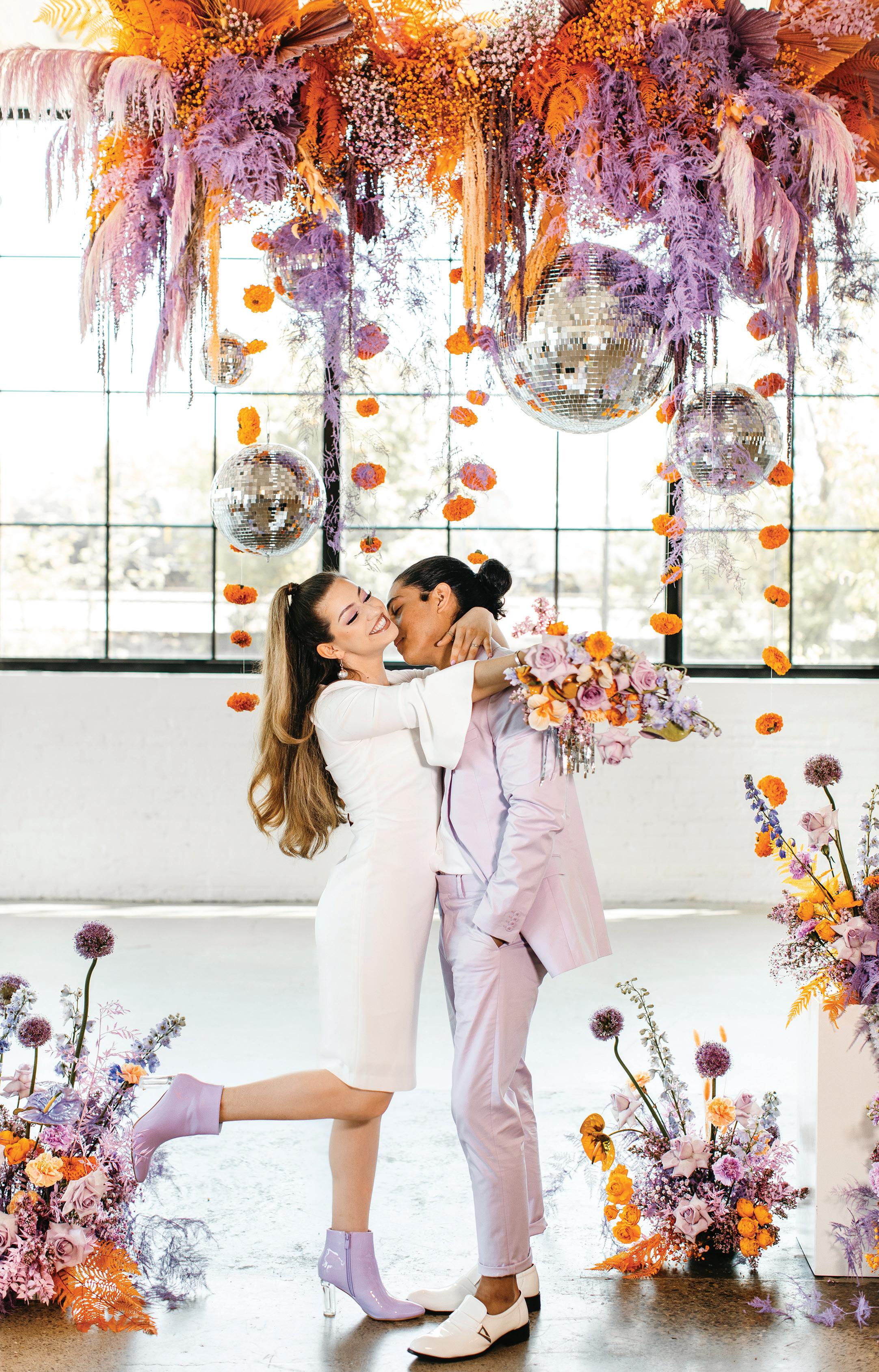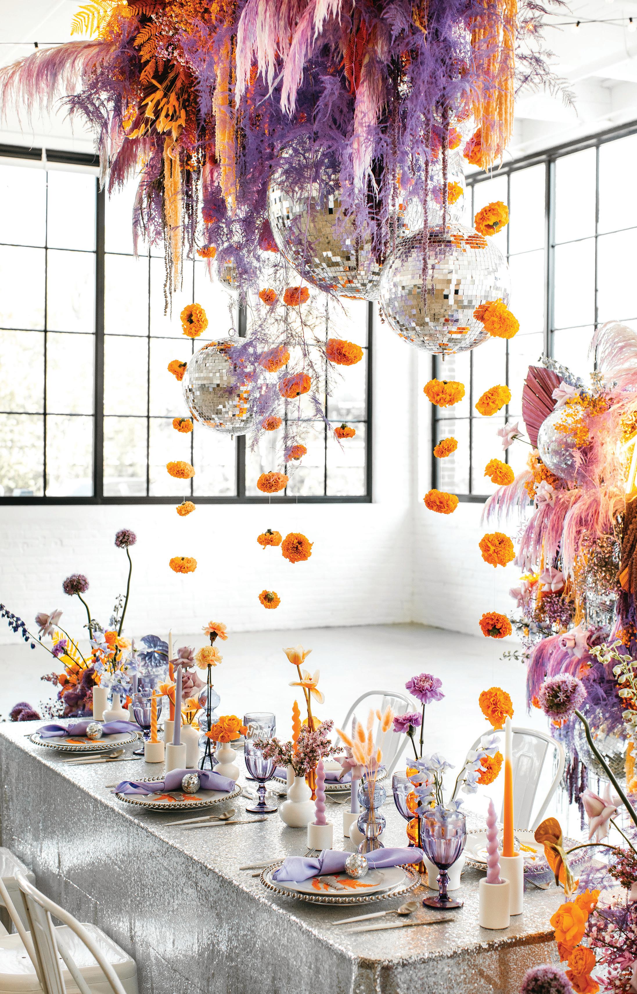 It’s good vibes only at this retro reception, where awesome outfits, funky colors and far-out florals rule. Chill out or boogie down, this is one hip scene.