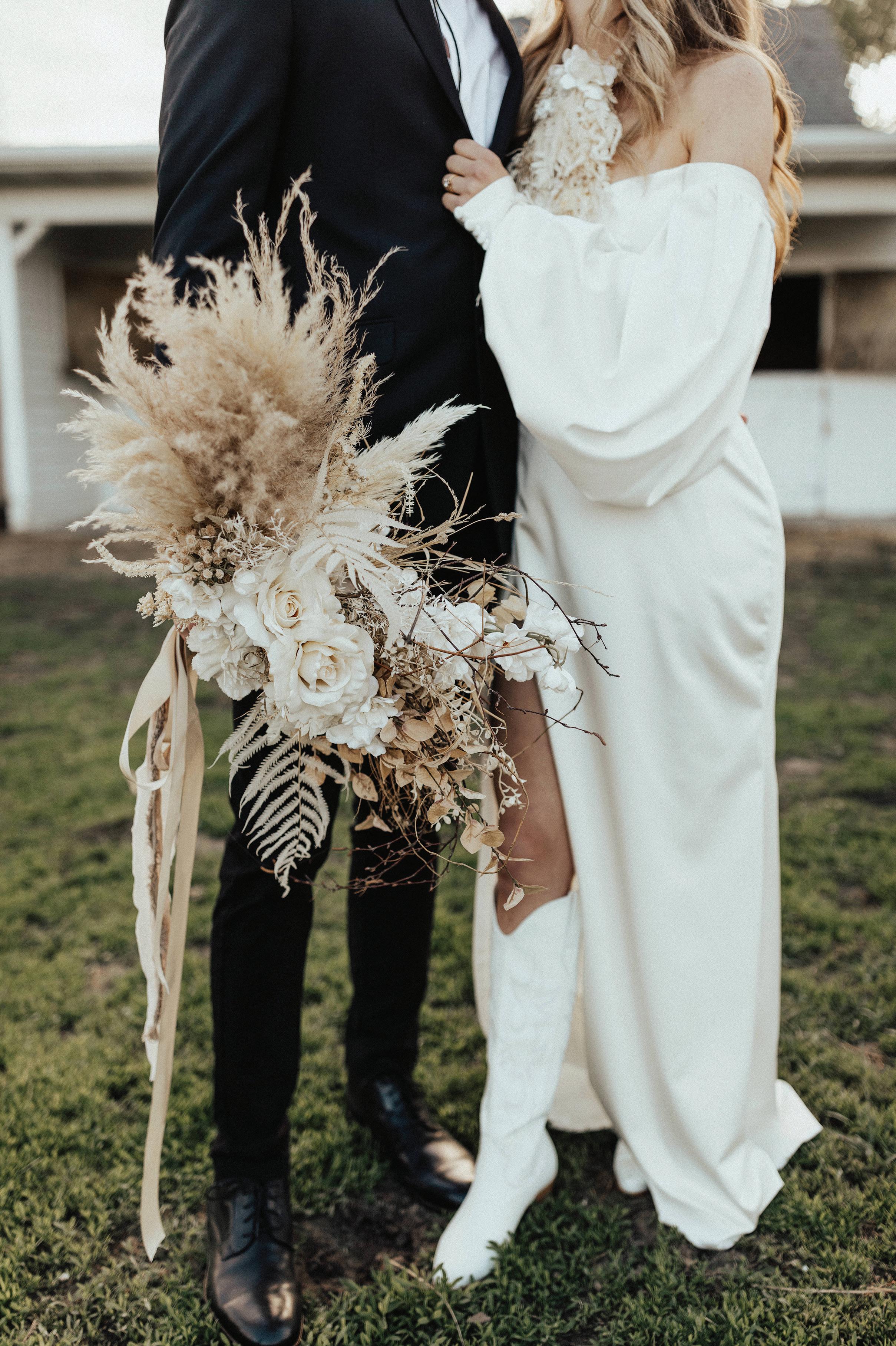 day engagement celebration full of excited calls to inform loved ones of the news. Their sunny May nuptials featured a black, white and beige palette with white floral installations. After exchanging vows, flower cannons went off as the new Mr. and Mrs. Meidl were introduced to the guests. At the reception, “In loving memory” cards and candles honored lost loved ones, and Samantha changed into her late grandmother’s wedding dress, with some modern alterations, to dance with her grandpa, much to his surprise and delight. Their day was unforgettable, from the emotional first look to the crowded dance floor.