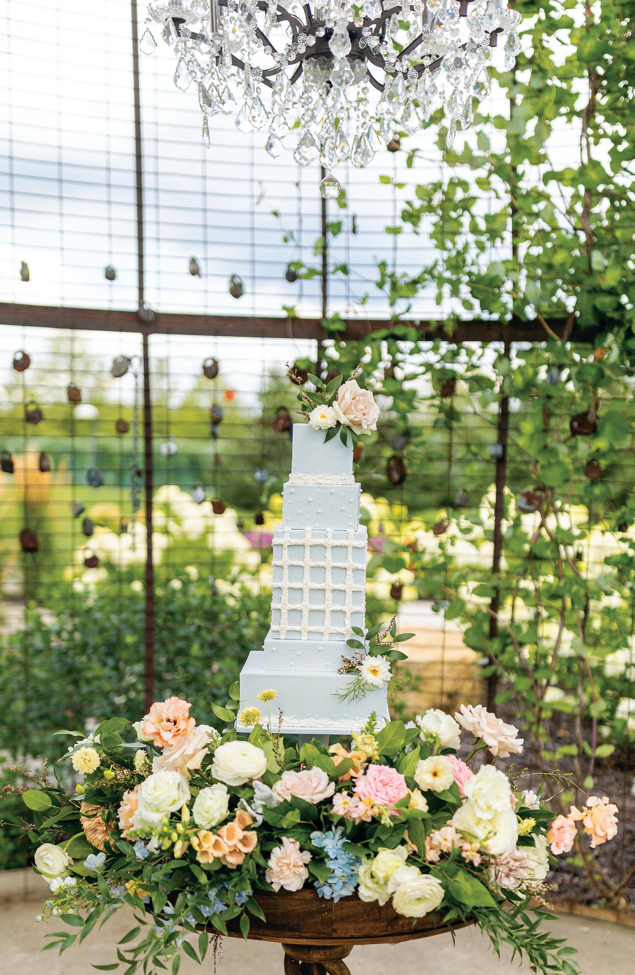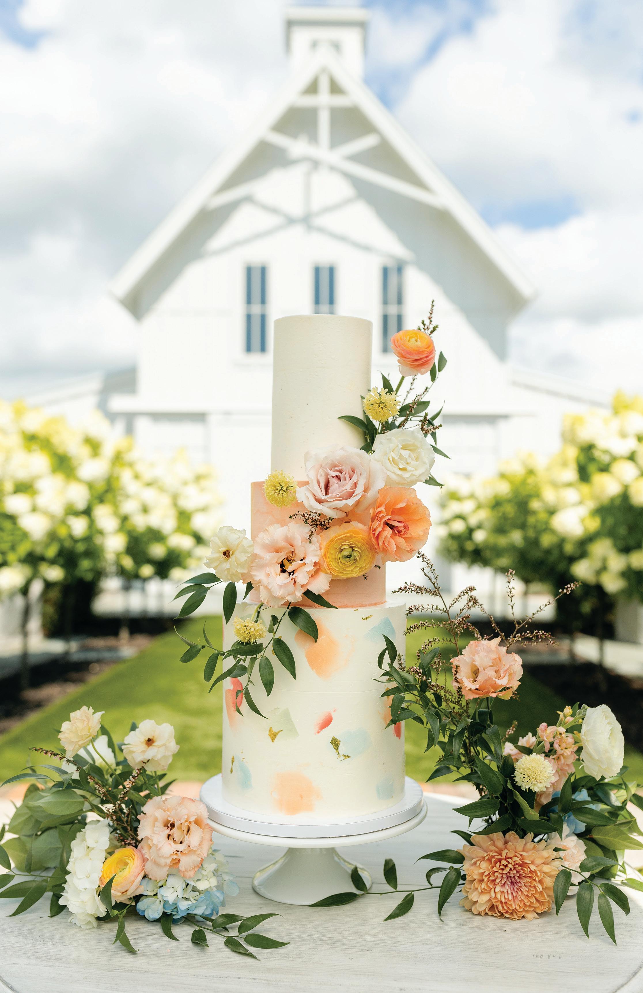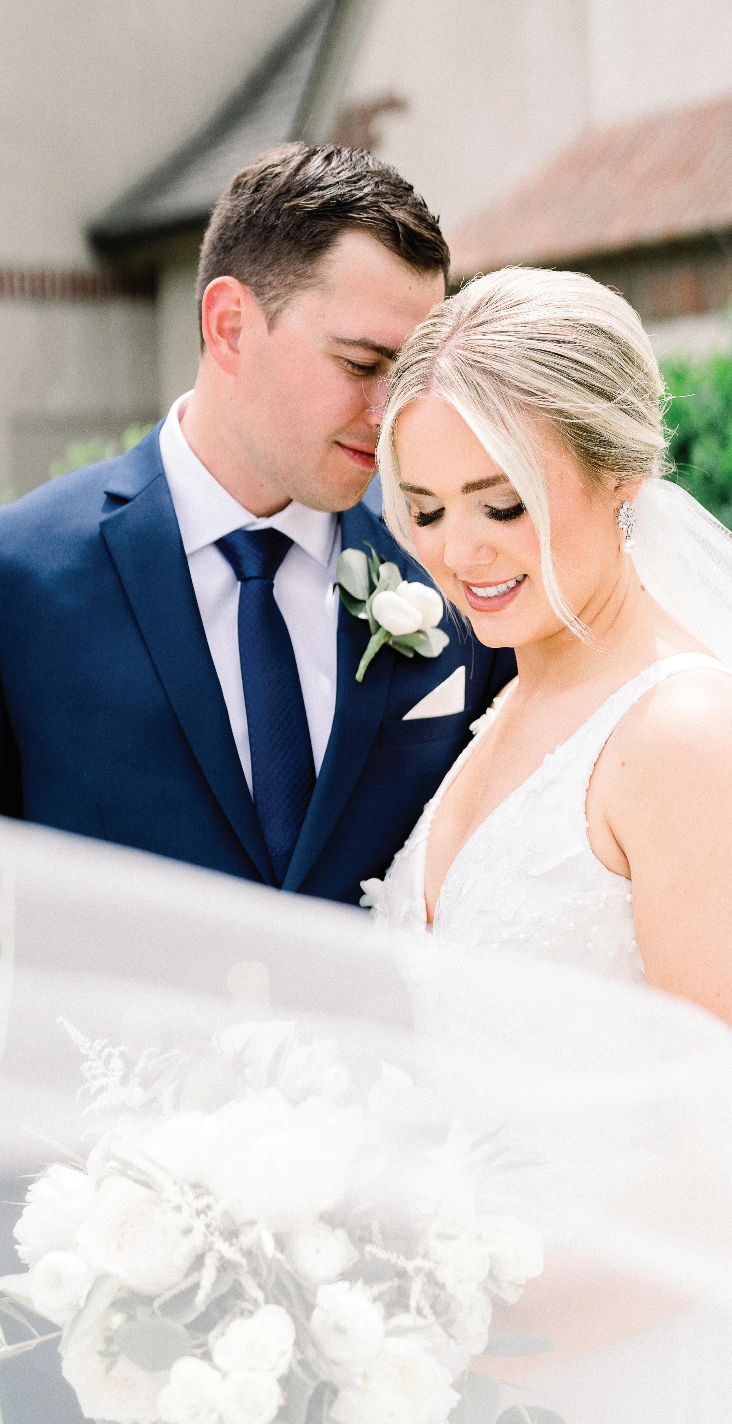 and crystal elements, the dress details were incorporated into the décor of the day. “I wanted it to feel bright and cheerful,” she said. The couple opted for white blooms and greenery, with white baby’s breath adding an ethereal touch, while the bride and bridesmaids held elegant bouquets of white peonies. Clear vessels with orchids adorned tables at the reception for contemporary flair. Abby’s favorite moment of the day was seeing her groom for the first time when she came down the aisle. “It was a surreal feeling, and it felt so special having all our friends and family there during that moment.”