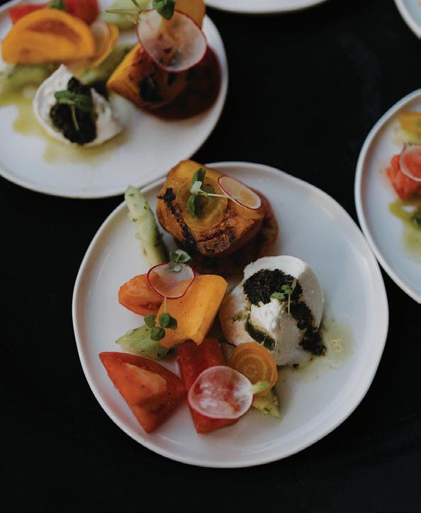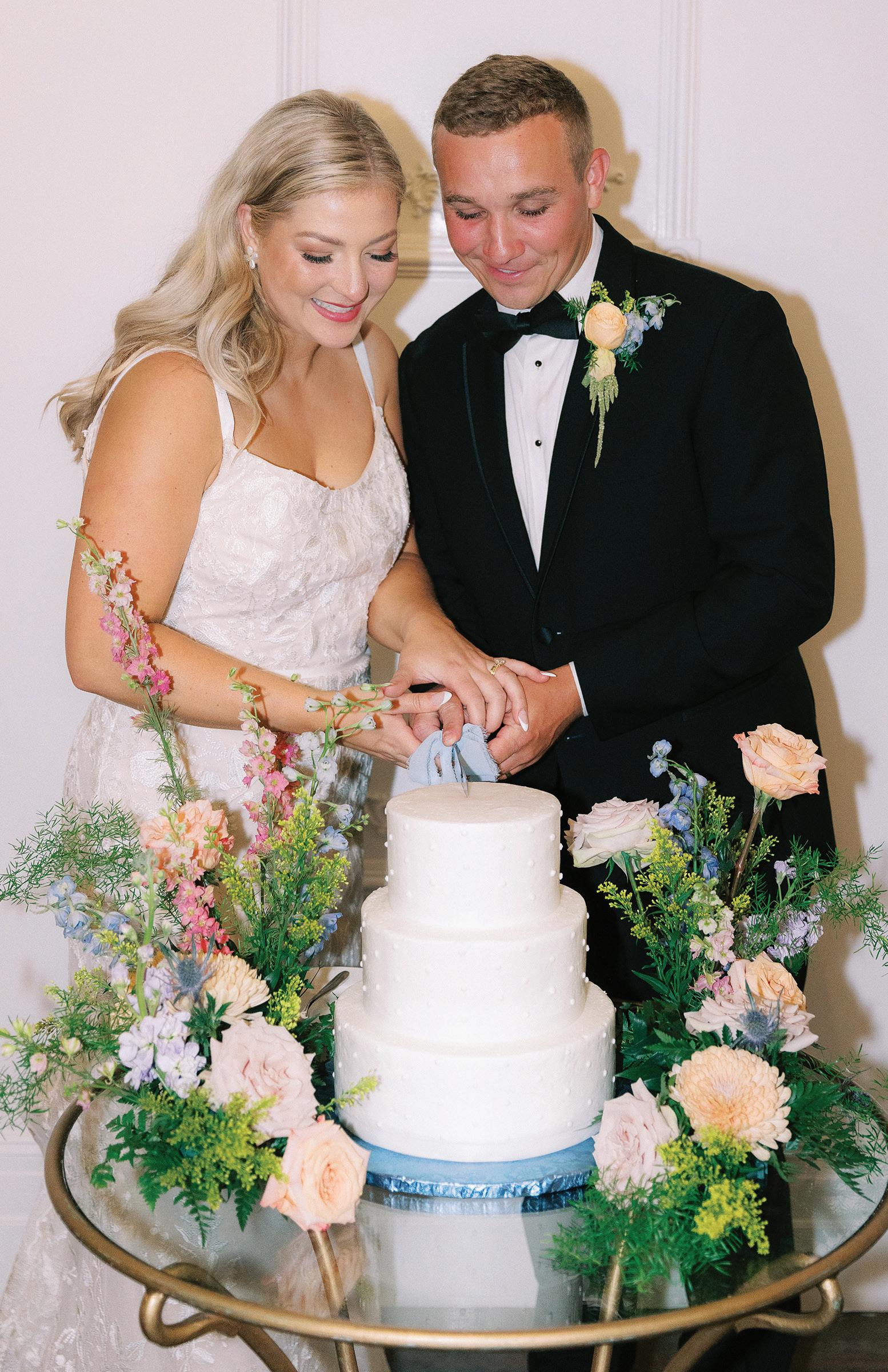 Gourmet food, exquisite wines and creative details were at the forefront of Meg Drahota and Kane Adkisson’s waterside wedding day at the bride’s parents’ waterside residence. Meg stunned in a sleek fit-and-flare gown as she and Kane, outfitted in a dapper three-piece ensemble, said “I do” beneath an arch garnished with blooms in late-summer hues. Influenced by bright and bold color palettes, the couple worked with Gabi Hughes of Unfolding Events to bring their vision to life. The color “Mallard” from a linen sample supplied by BBJ La Tavola was the center of the design and acted as a nod to the groom’s birdhunting hobby. As Kane is a James Beard semifinalist chef, providing a one-of-a-kind dining experience featuring the best food and beverage was paramount. Cocktail hour kicked off with caviar bumps, a grazing board and napkins featuring heartfelt messages the bride and groom have shared during their journey of love. To mimic the movement of water, serpentine tables adorned with Mallard tablecloths, petite lamps, patterned napkins and modern paper goods hosted the intimate two-course culinary feast. In lieu of a Champagne toast, the newlyweds provided a red wine toast using a discontinued 2015 bottle from Nine Suns, an homage to one of the first vineyards they visited in Napa together. From first kiss to last dance, Meg and Kane’s wedding perfectly reflected them as a couple, capturing their love story in a magical celebration that was uniquely and quintessentially theirs. —Sydney Stevens