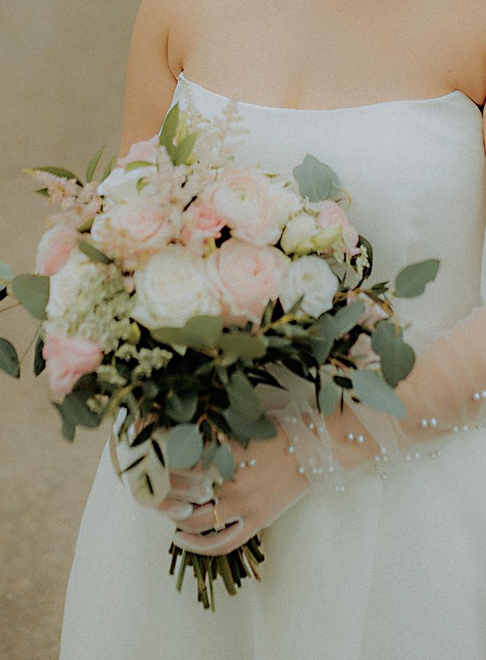 “Wes” by Amsale from For The One Bridal accessorized with jewelry from 14 Karat and earrings by Sashi. Bouquet by Fresh Floral. Hair by Pin and Pose and makeup by Addi Malena Esthetics. Photographed by Heather and Jameson at The Joslyn.