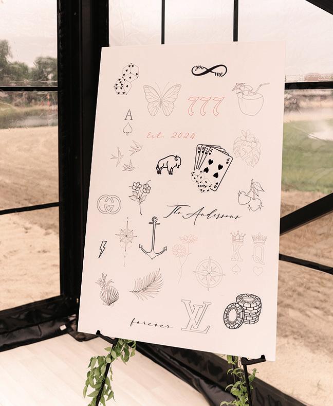 glass structures overseas, and crafted it all together. Accented by gorgeous tropical florals, the space housed a reception with a dance floor, dinner tables, a lounge area and even a tattoo station with flash tattoos inspired by the couple’s interests. Over the course of four short months, this impressive feat resulted in a one-of-a-kind lakeside venue for Amber and Scott to celebrate their love.