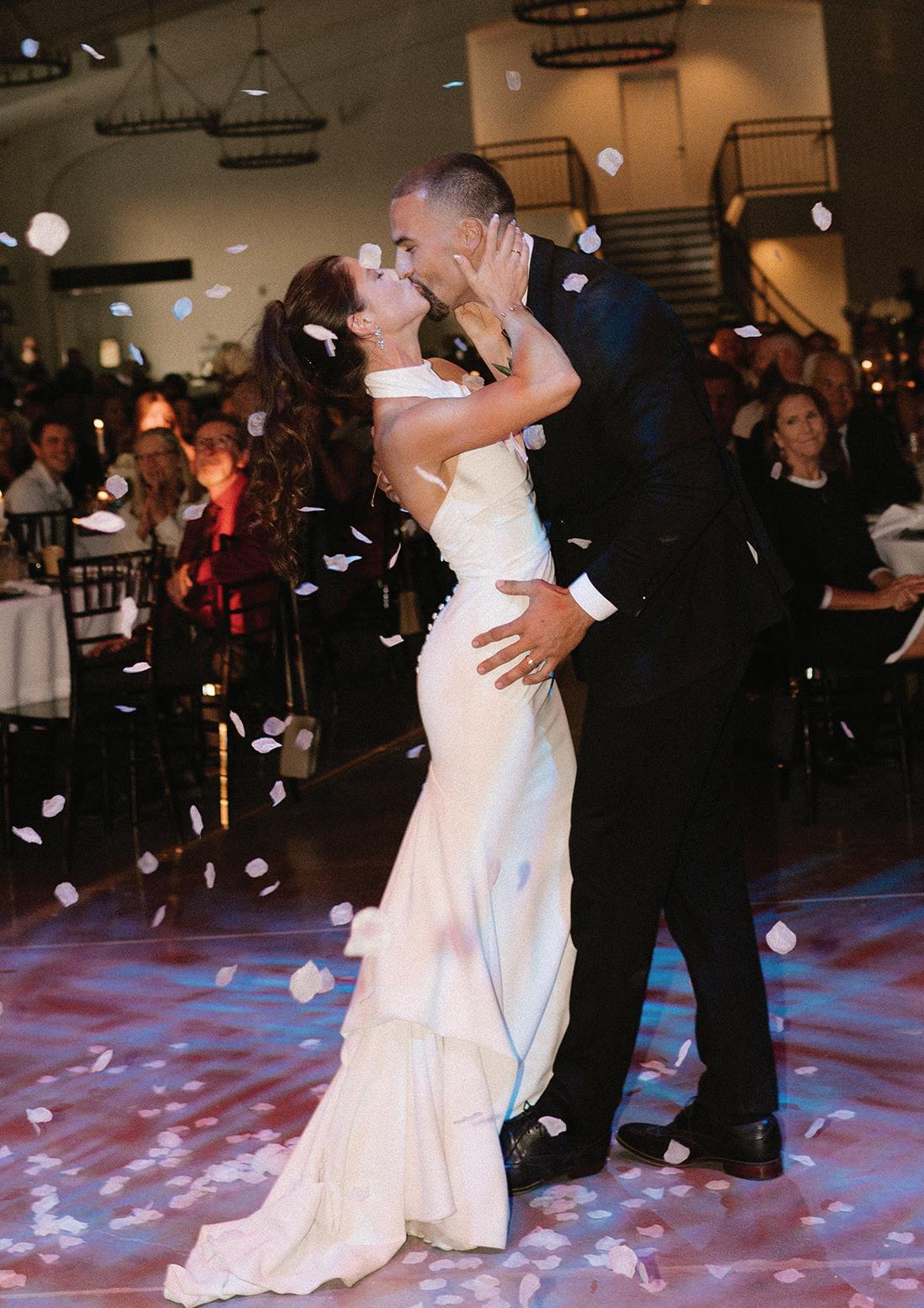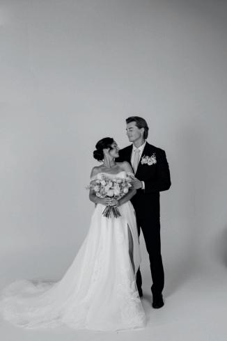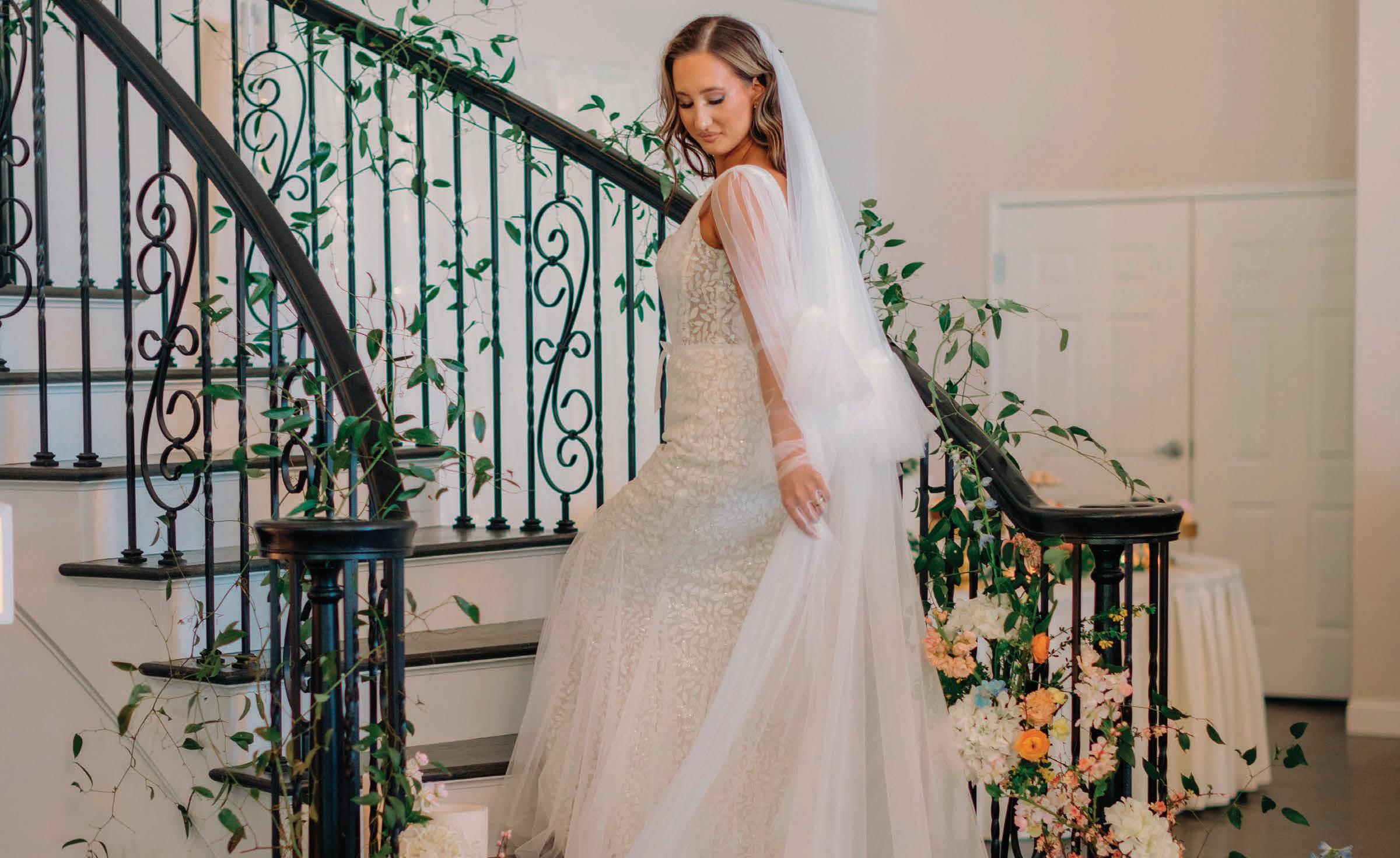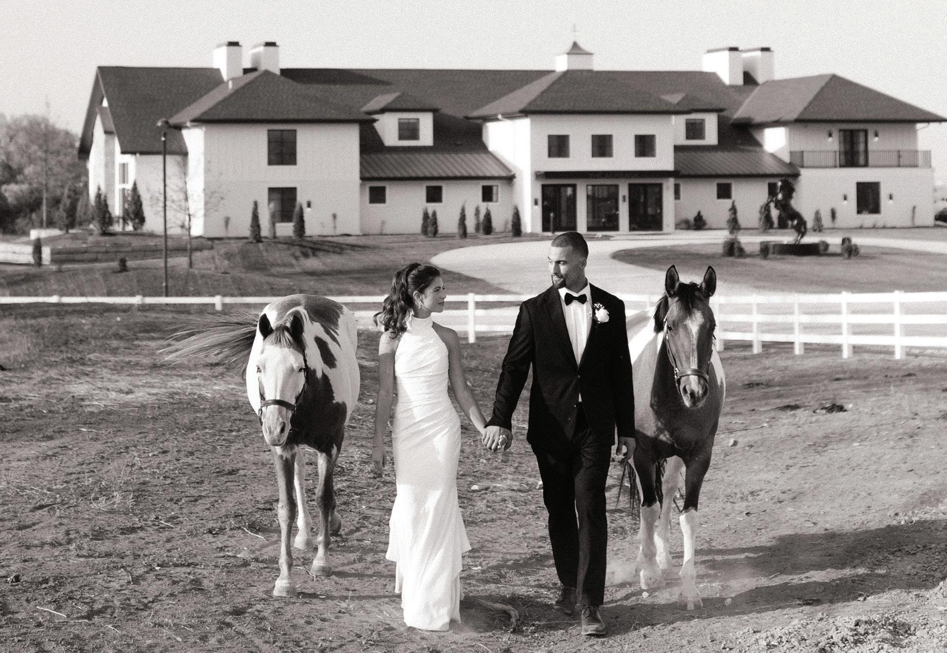 Equestrian elegance meets contemporary chic was the theme of Lydia Robertus and Josh Banderas’ wedding day. Despite attending middle school, high school and college together, romance didn’t bloom until the end of Lydia’s college career when Josh won her over with ice cream at Pioneer Park. After Josh’s sister’s wedding, the couple jokingly said, “We could do this!” and that joke soon became a reality when they decided to create The Acreage together. It only made sense their wedding would be the first celebration to grace the new space. As avid horse riders and animal lovers, they wanted the venue to exude a refined vibe with equestrian flair. “The entire building reflects our interests and time together as a couple,” Lydia says. On the day of their marriage, Lydia traded her cowboy boots for heels and opted for a sleek high-neck gown while the groom chose a classic tux and black hat for the occasion. Cocktail hour was dreamy with a saxophonist serenading guests as they sipped on libations with napkins featuring the couple’s dog and drink stirrers with their three cats on them. A timeless black-and-white palette matched the venue flawlessly with warmth from gold accents and candlelight. White florals decorated the tables and grand steps while minimalist table décor made the space Lydia and Josh worked so hard on shine. A packed dance floor was the perfect ending to their lively nuptials and a perfect start to their life together as husband and wife. — Sydney Stevens
