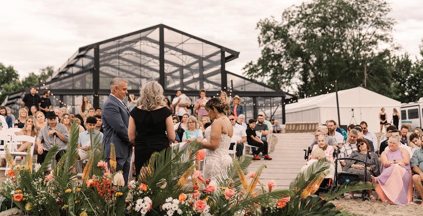 For their wedding day, Amber Caniglia and Scott Anderson wanted a venue completely unique to them—so they built one on their own property! The bride and groom were considering a destination wedding because they weren’t sure if their idea of a wedding on their property was just a fantasy, but they were thrilled to find their dream could be realized thanks to 402 Events. The process started with removing the house that had previously existed in the space they intended to use for their nuptials. The team then reworked the land, fabricated steel and