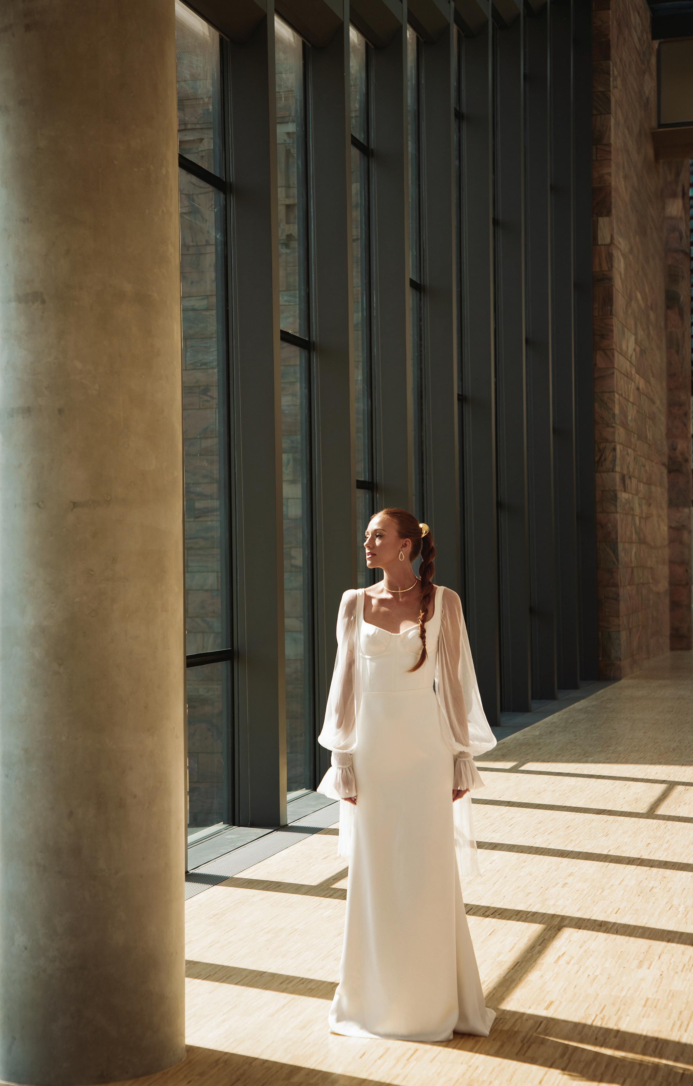 “Angelica in Liquid Satin” and Crimped Tulle Bishop Sleeve, both by Aesling from Noa Brides accessorized with jewelry from 14 Karat, necklace by Adina Eden and hair cuff by Lelet NY. Bouquet by Fresh Floral. Hair by Pin and Pose and makeup by Addi Malena Esthetics. Photographed by Heather and Jameson at The Joslyn.