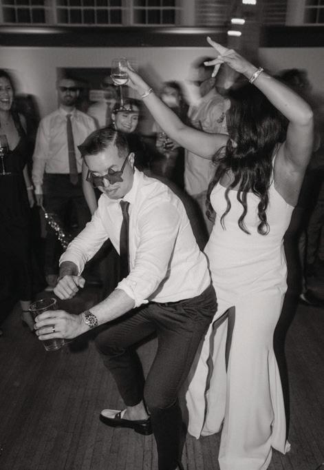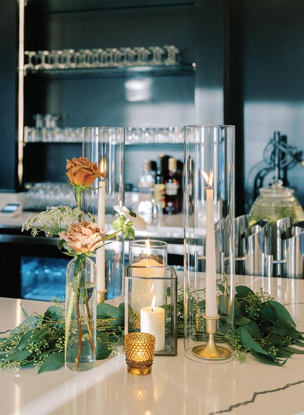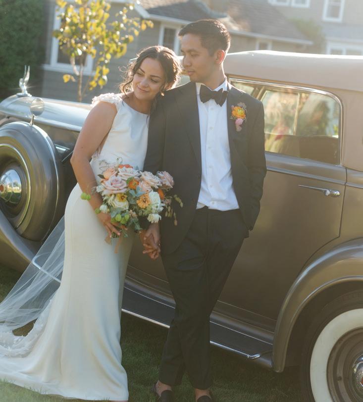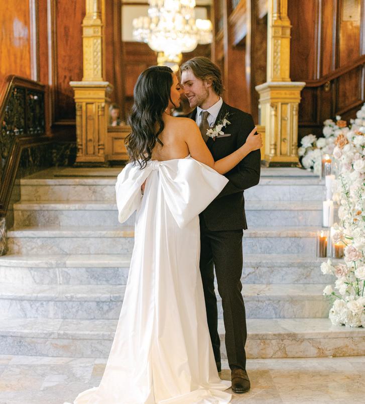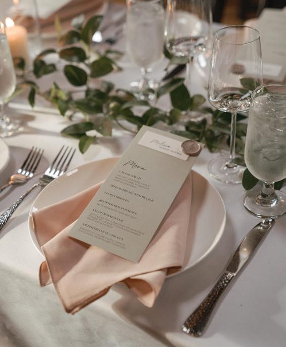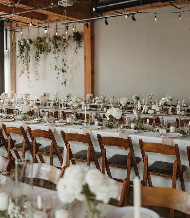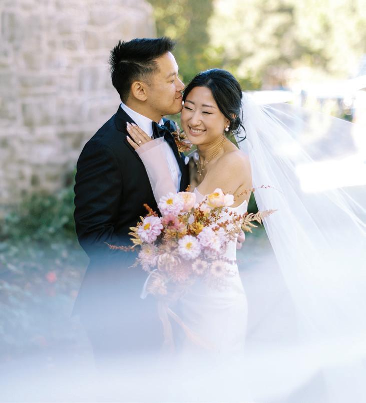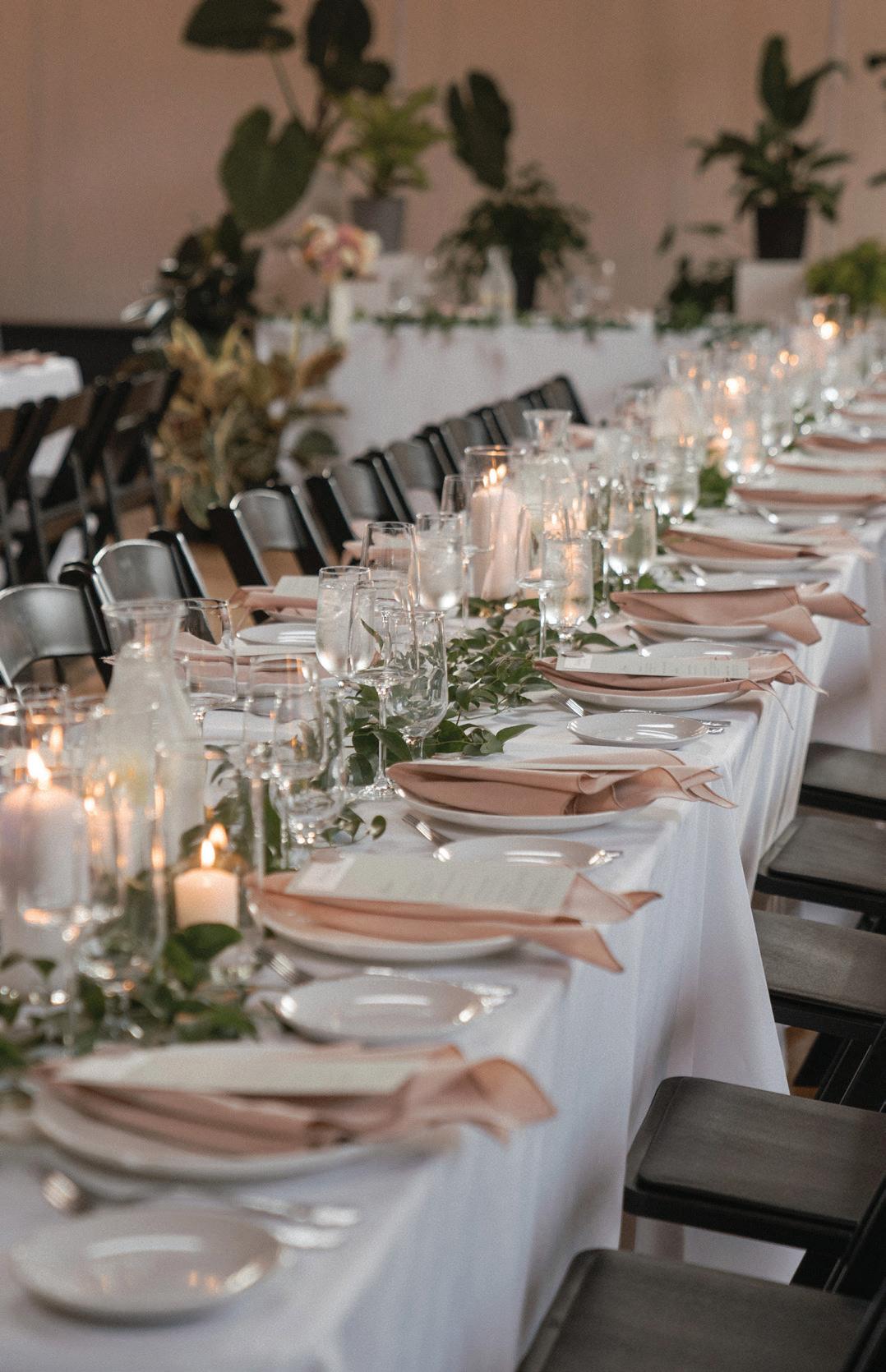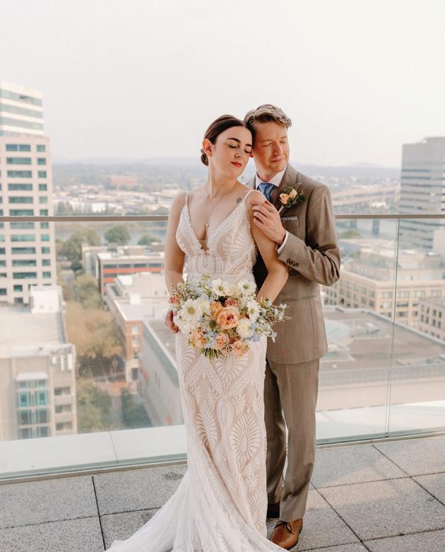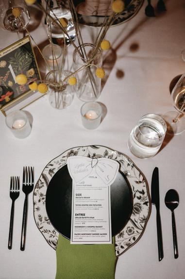 Just across the river from downtown Portland, Lindsey Wilson and Brian Ki tied the knot at The Evergreen. The groom had tears in his eyes as his bride joined him at the altar, which was adorned with a wide variety of potted plants—the mismatched greenery providing an organic feel against the ceremony space. Sunlight reflected off the shimmering champagne-colored bridesmaid dresses and beamed through the windows on either side of the couple as they said their vows. The unique reception design was largely centered on cultivating a memorable guest experience with a delicious donut bar, creative drink displays and a lineup of hourly surprise signature cocktails—each drink inspired by a special memory in their love story. Guests were invited to “Take a hike” to their seats with a themed seating chart that featured silhouettes of mountain ranges against a chic sage-green backdrop. Foregoing traditional numbers, tables were named after a few of the bride and groom’s favorite hiking spots. Tablescapes were simple and refined, with blush pink napkins to contrast the beautiful greenery and candlelight that flowed down the length of the tables. Following their dance to “Motion” by Emotional Oranges, the first concert the couple attended together, colorful glasses were passed around to ramp up the party atmosphere, transforming their day of love and celebration into an incredibly electric night that is sure to be remembered forever. Reflecting on their personalityfilled event, Lindsey shares, “Every part of the celebration felt intentional and full of heart, and getting to share those moments with all our friends and family made it truly unforgettable.” —Kaitlyn Meehan
