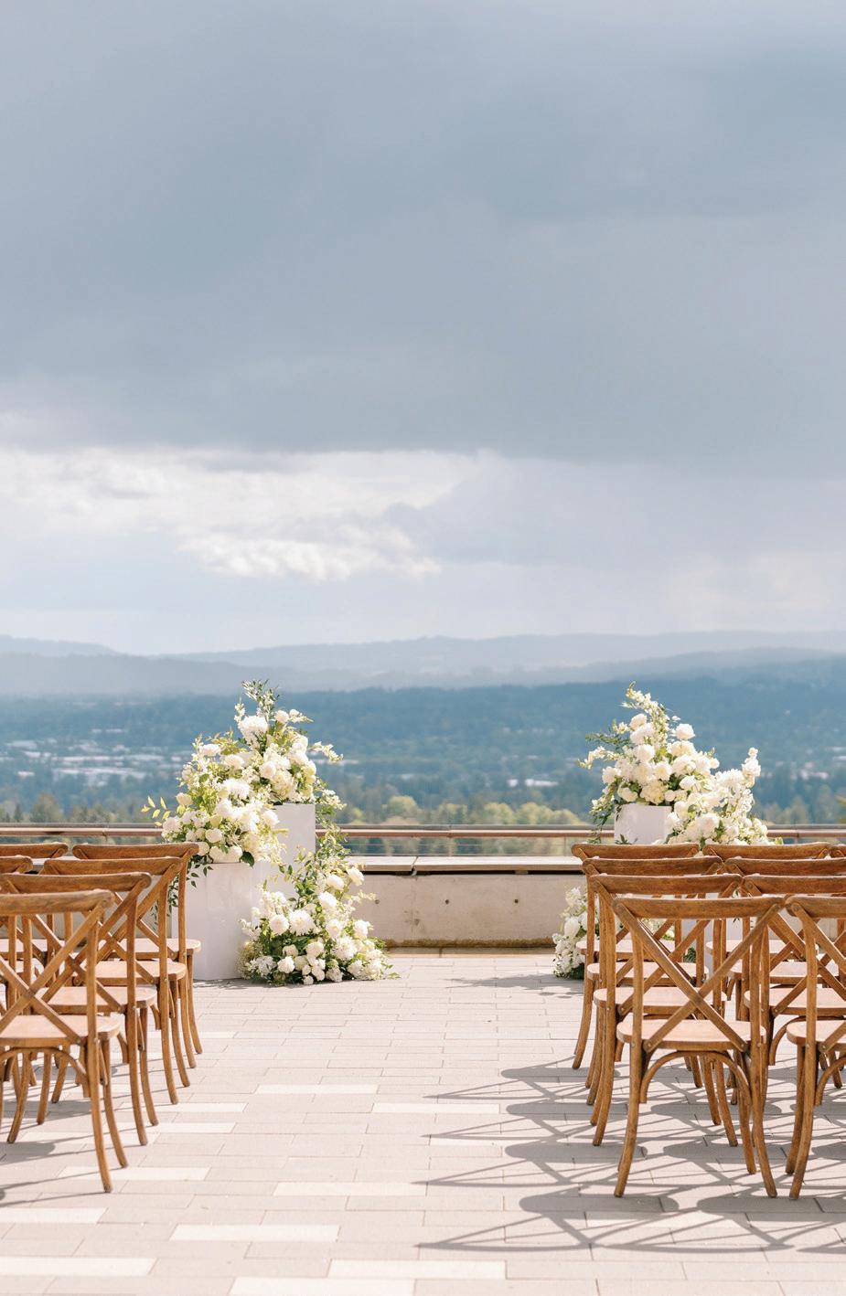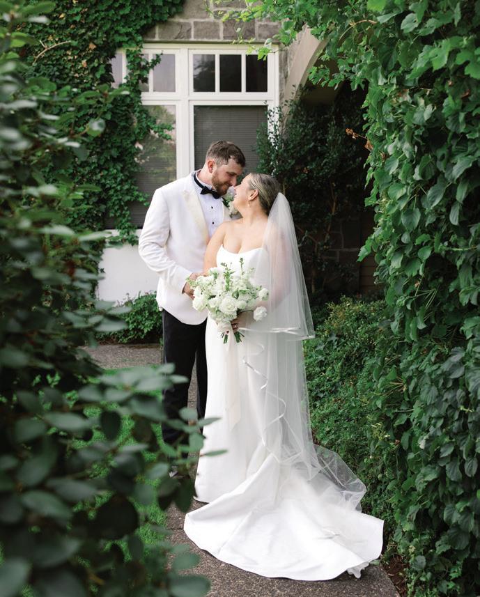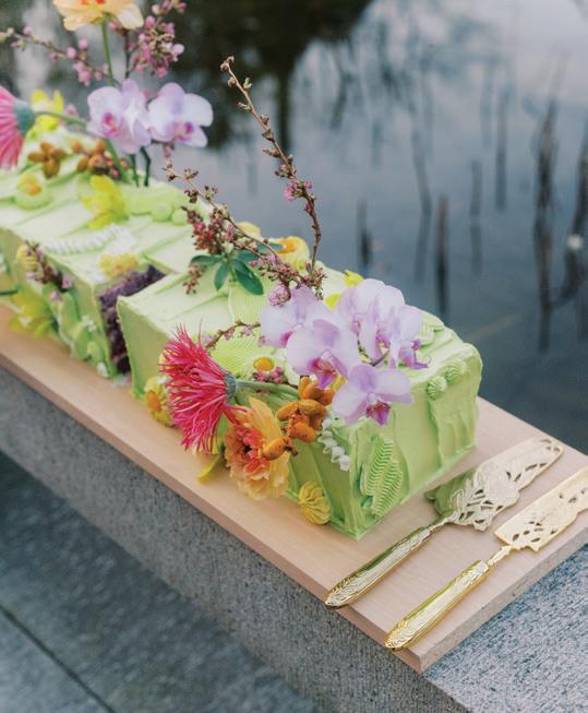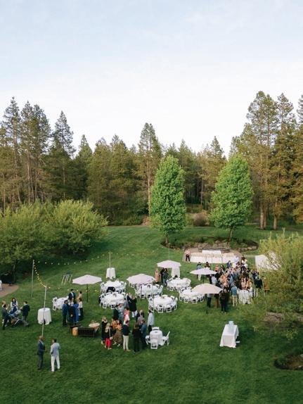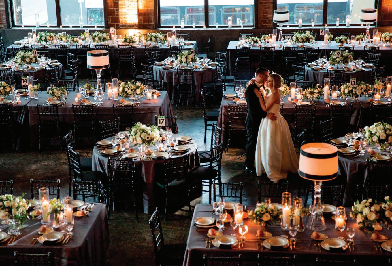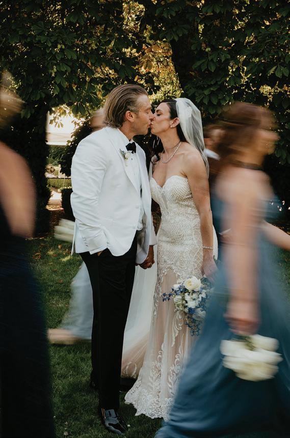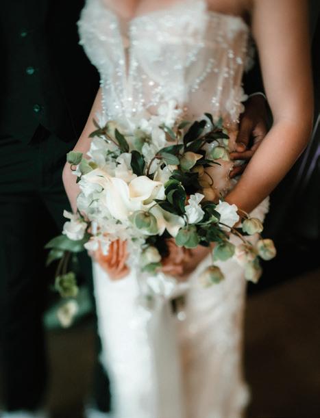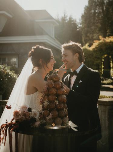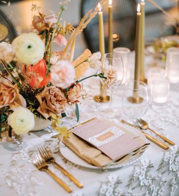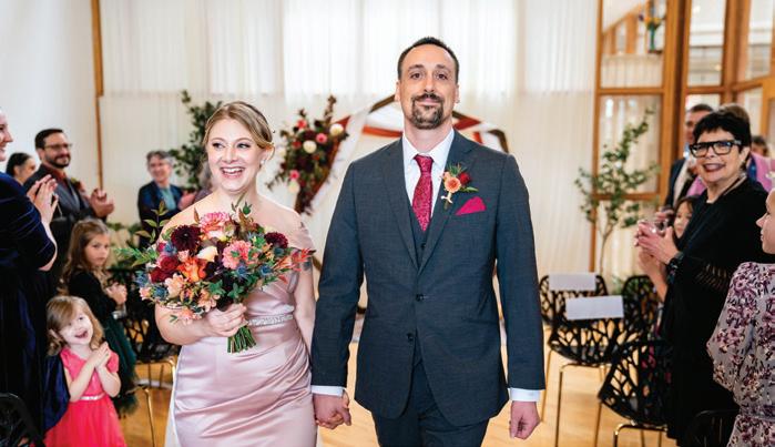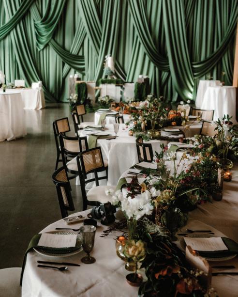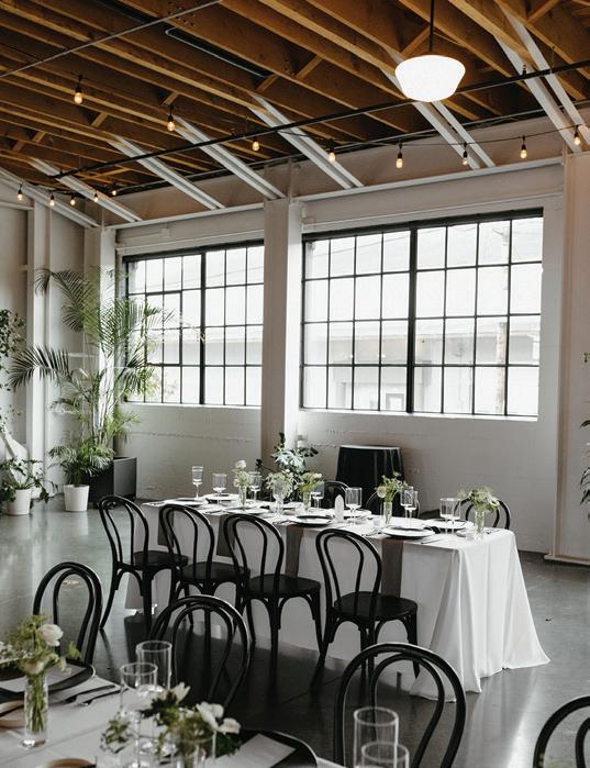 Just across the river from downtown Portland, Lindsey Wilson and Brian Ki tied the knot at The Evergreen. The groom had tears in his eyes as his bride joined him at the altar, which was adorned with a wide variety of potted plants—the mismatched greenery providing an organic feel against the ceremony space. Sunlight reflected off the shimmering champagne-colored bridesmaid dresses and beamed through the windows on either side of the couple as they said their vows. The unique reception design was largely centered on cultivating a memorable guest experience with a delicious donut bar, creative drink displays and a lineup of hourly surprise signature cocktails—each drink inspired by a special memory in their love story. Guests were invited to “Take a hike” to their seats with a themed seating chart that featured silhouettes of mountain ranges against a chic sage-green backdrop. Foregoing traditional numbers, tables were named after a few of the bride and groom’s favorite hiking spots. Tablescapes were simple and refined, with blush pink napkins to contrast the beautiful greenery and candlelight that flowed down the length of the tables. Following their dance to “Motion” by Emotional Oranges, the first concert the couple attended together, colorful glasses were passed around to ramp up the party atmosphere, transforming their day of love and celebration into an incredibly electric night that is sure to be remembered forever. Reflecting on their personalityfilled event, Lindsey shares, “Every part of the celebration felt intentional and full of heart, and getting to share those moments with all our friends and family made it truly unforgettable.” —Kaitlyn Meehan
