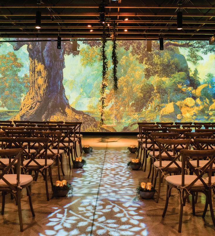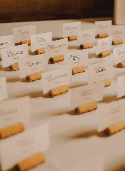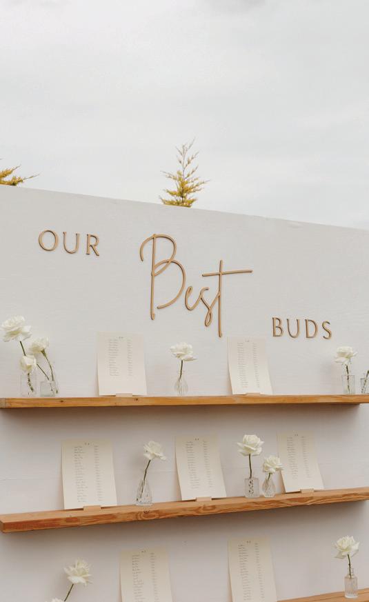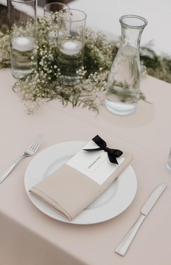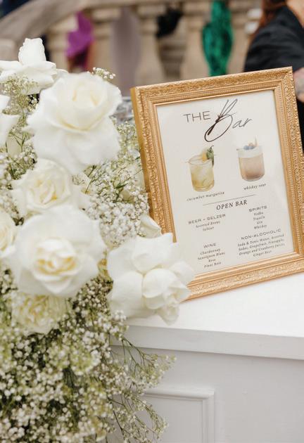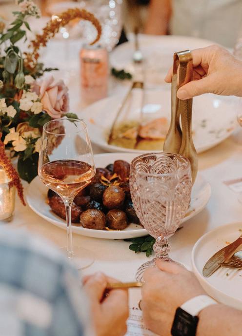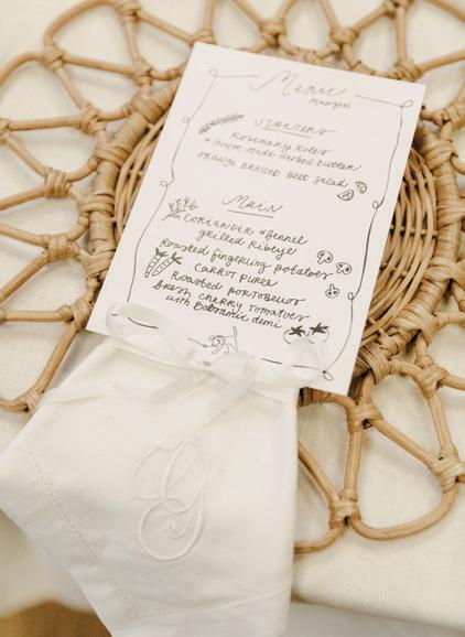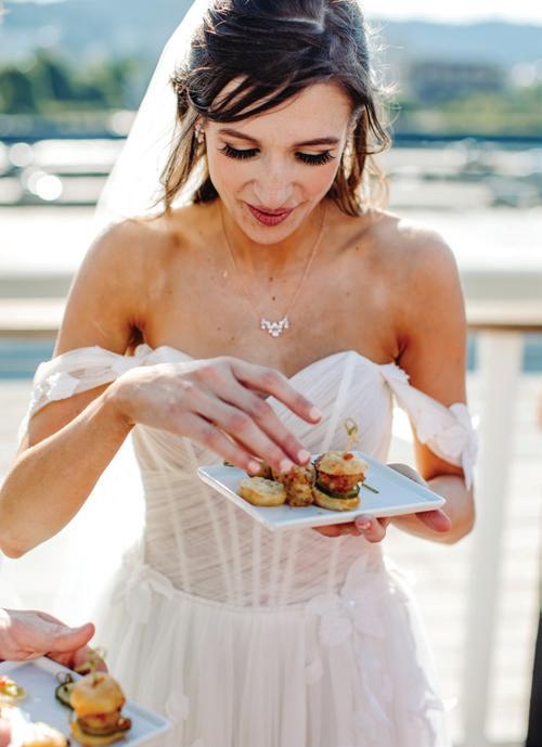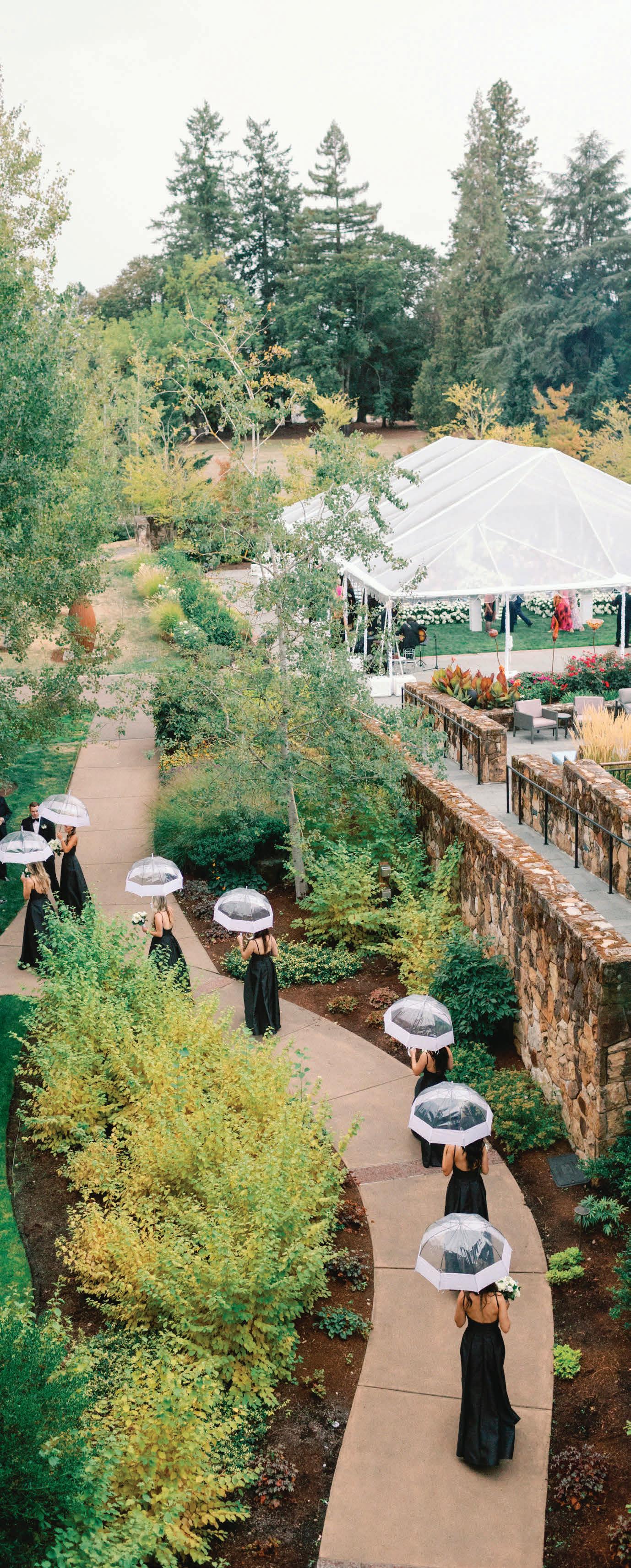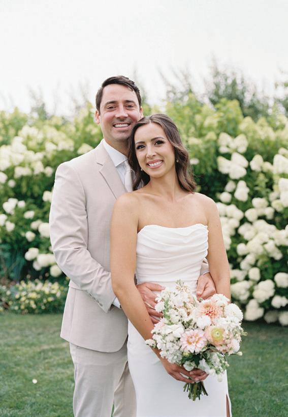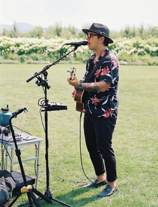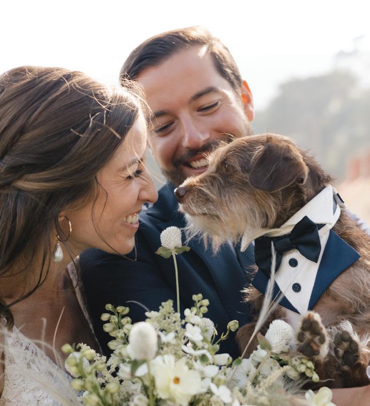 Just across the river from downtown Portland, Lindsey Wilson and Brian Ki tied the knot at The Evergreen. The groom had tears in his eyes as his bride joined him at the altar, which was adorned with a wide variety of potted plants—the mismatched greenery providing an organic feel against the ceremony space. Sunlight reflected off the shimmering champagne-colored bridesmaid dresses and beamed through the windows on either side of the couple as they said their vows. The unique reception design was largely centered on cultivating a memorable guest experience with a delicious donut bar, creative drink displays and a lineup of hourly surprise signature cocktails—each drink inspired by a special memory in their love story. Guests were invited to “Take a hike” to their seats with a themed seating chart that featured silhouettes of mountain ranges against a chic sage-green backdrop. Foregoing traditional numbers, tables were named after a few of the bride and groom’s favorite hiking spots. Tablescapes were simple and refined, with blush pink napkins to contrast the beautiful greenery and candlelight that flowed down the length of the tables. Following their dance to “Motion” by Emotional Oranges, the first concert the couple attended together, colorful glasses were passed around to ramp up the party atmosphere, transforming their day of love and celebration into an incredibly electric night that is sure to be remembered forever. Reflecting on their personalityfilled event, Lindsey shares, “Every part of the celebration felt intentional and full of heart, and getting to share those moments with all our friends and family made it truly unforgettable.” —Kaitlyn Meehan