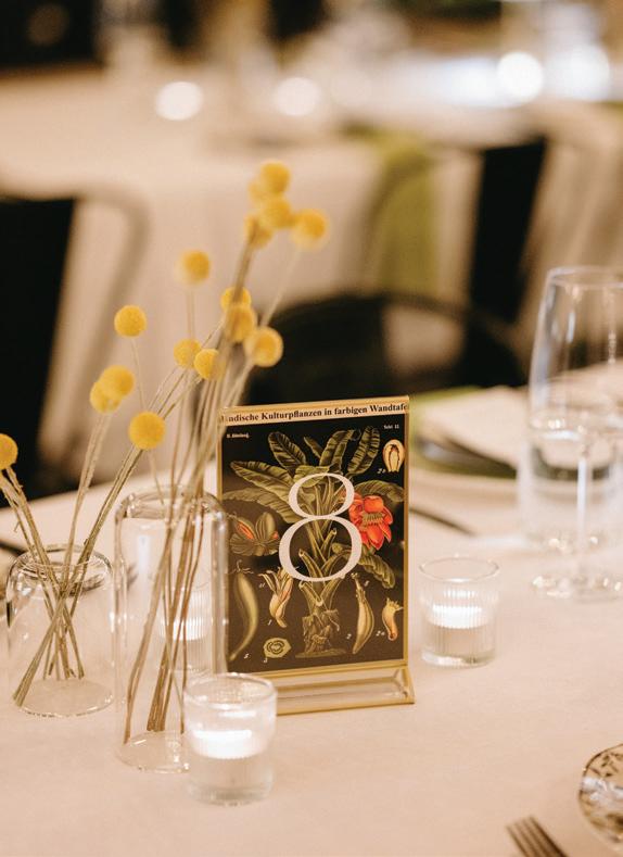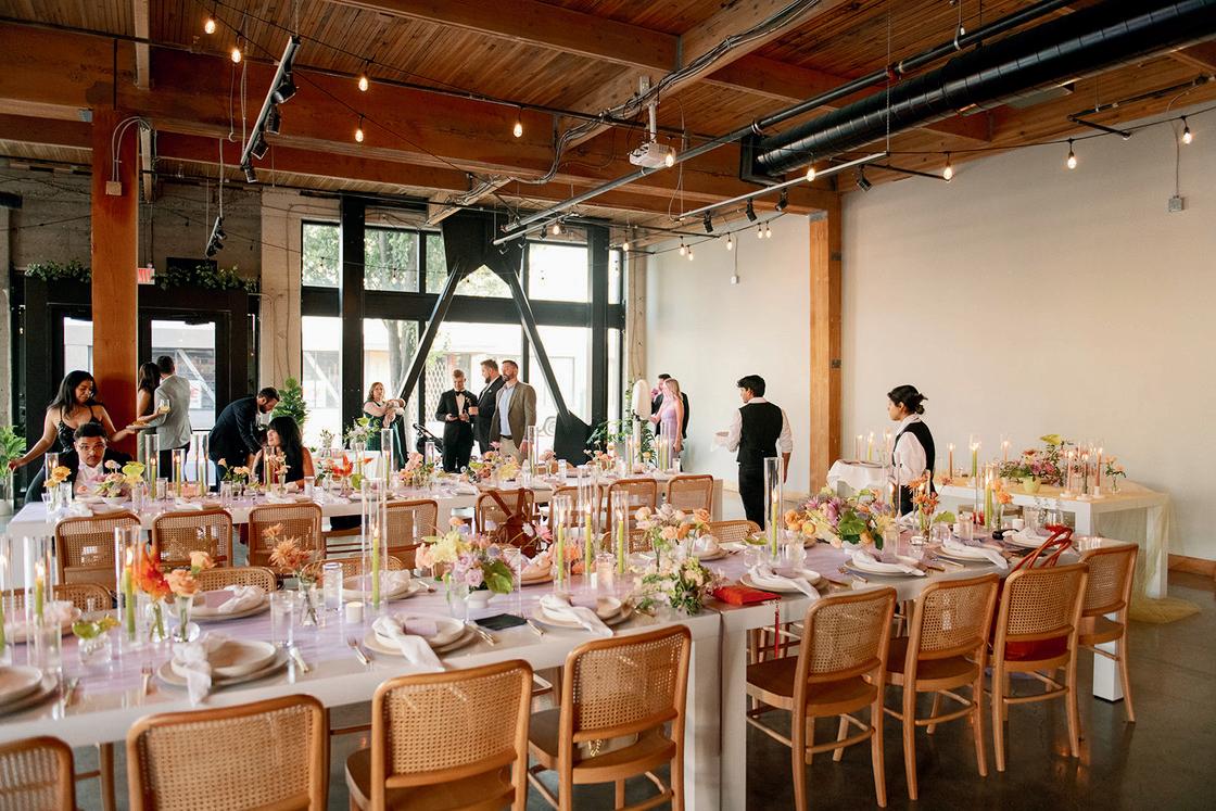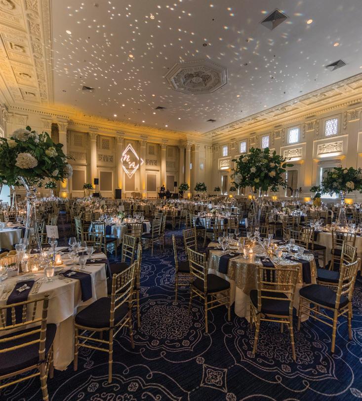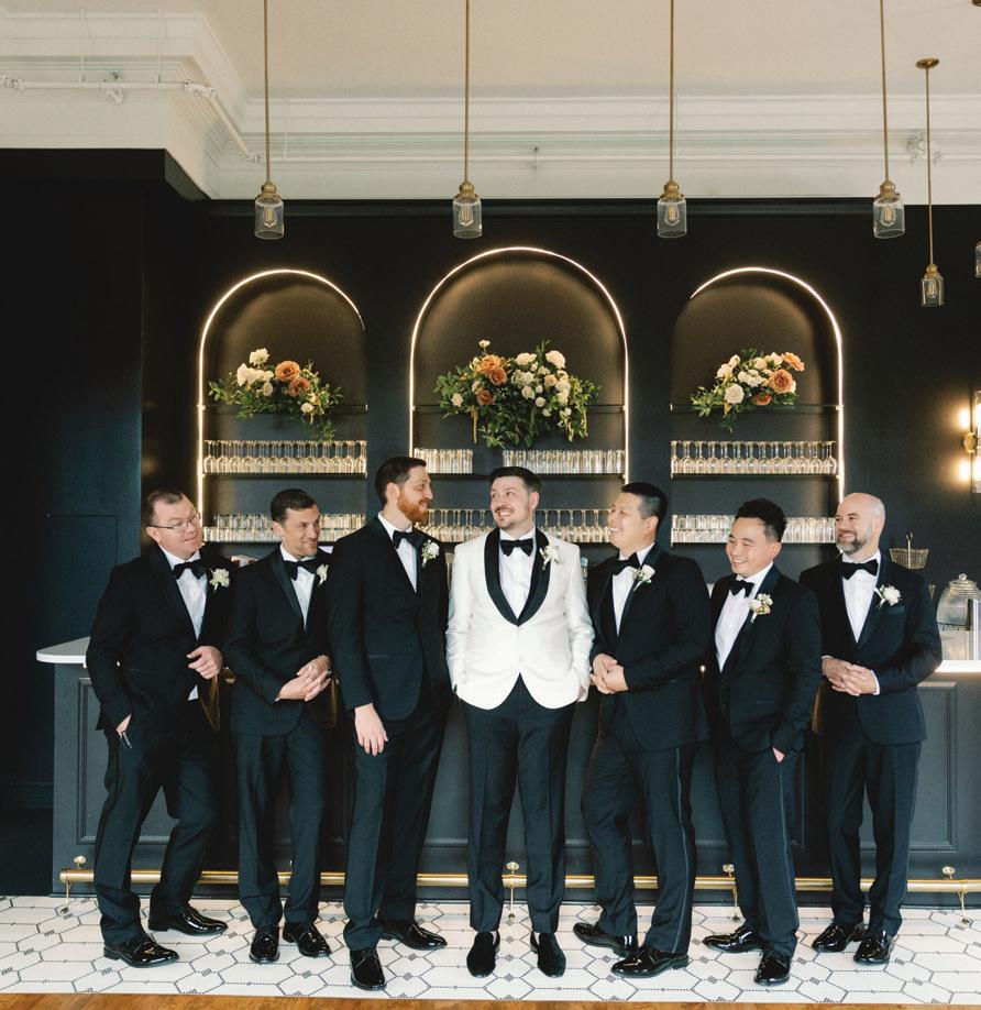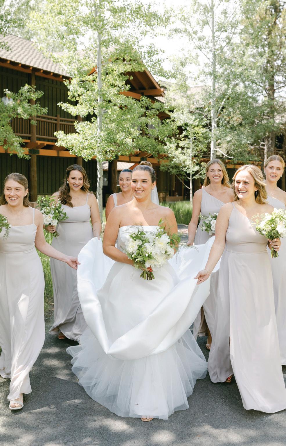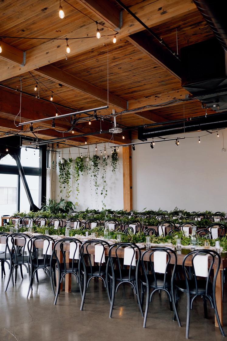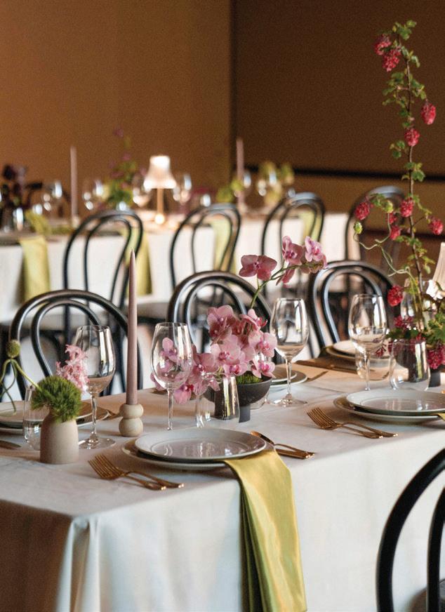 Just across the river from downtown Portland, Lindsey Wilson and Brian Ki tied the knot at The Evergreen. The groom had tears in his eyes as his bride joined him at the altar, which was adorned with a wide variety of potted plants—the mismatched greenery providing an organic feel against the ceremony space. Sunlight reflected off the shimmering champagne-colored bridesmaid dresses and beamed through the windows on either side of the couple as they said their vows. The unique reception design was largely centered on cultivating a memorable guest experience with a delicious donut bar, creative drink displays and a lineup of hourly surprise signature cocktails—each drink inspired by a special memory in their love story. Guests were invited to “Take a hike” to their seats with a themed seating chart that featured silhouettes of mountain ranges against a chic sage-green backdrop. Foregoing traditional numbers, tables were named after a few of the bride and groom’s favorite hiking spots. Tablescapes were simple and refined, with blush pink napkins to contrast the beautiful greenery and candlelight that flowed down the length of the tables. Following their dance to “Motion” by Emotional Oranges, the first concert the couple attended together, colorful glasses were passed around to ramp up the party atmosphere, transforming their day of love and celebration into an incredibly electric night that is sure to be remembered forever. Reflecting on their personalityfilled event, Lindsey shares, “Every part of the celebration felt intentional and full of heart, and getting to share those moments with all our friends and family made it truly unforgettable.” —Kaitlyn Meehan