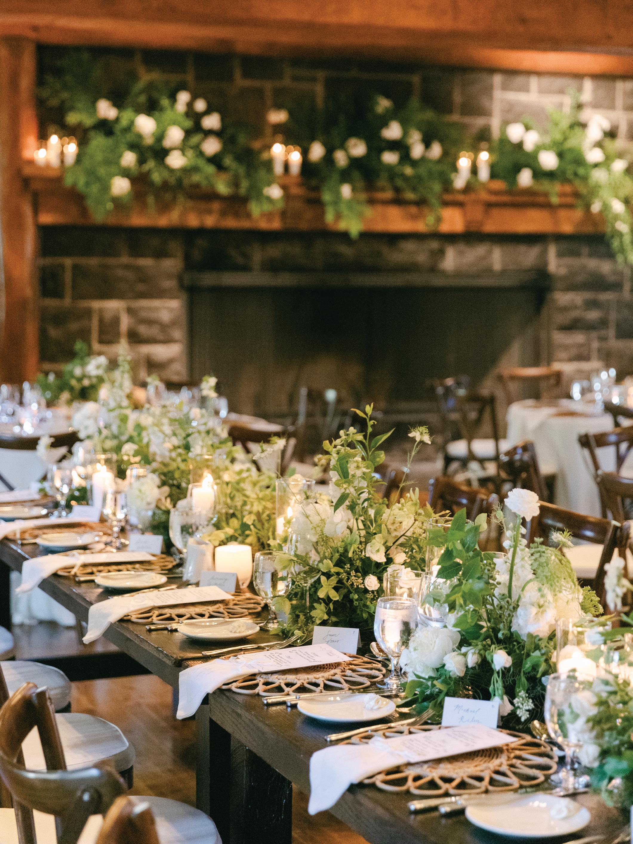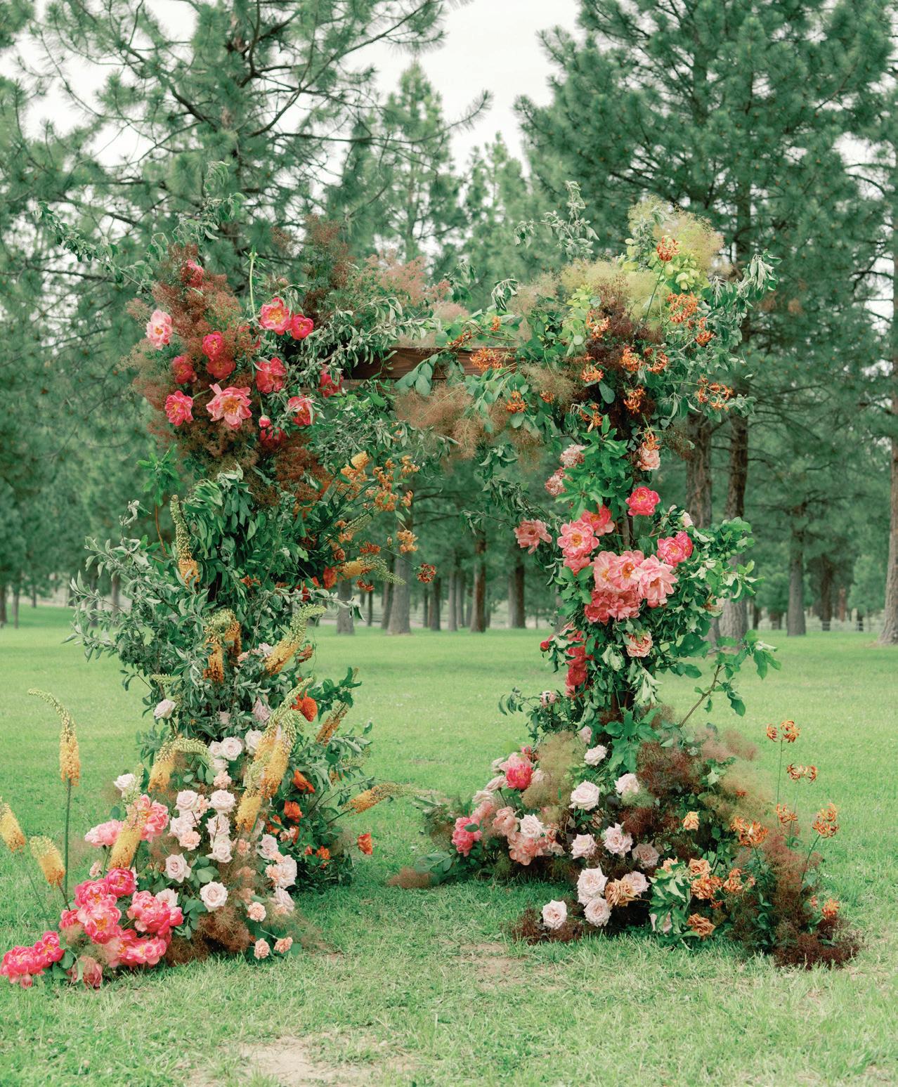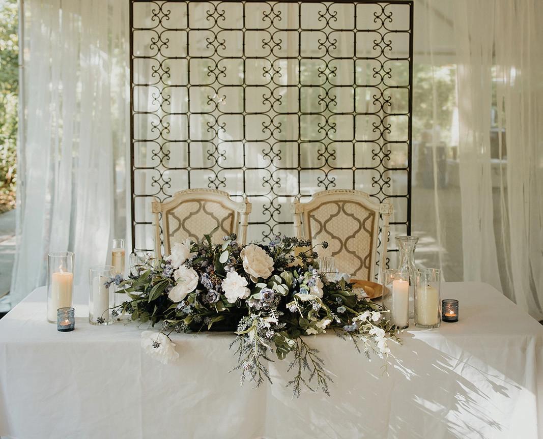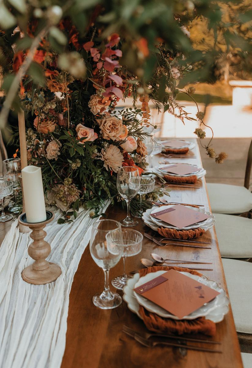 In the sweeping tablescape, a floral tree stood as the main focal point with the iconic A-frame serving as the backdrop. “This is a design that we haven’t seen before but still plays into the trend of unique floral installations,” Gloria Rice, founder of High Desert Florals notes of her creation. “The structure was to mimic a tree, its branches hanging over the tablescape. The design included not only a light contrast of tones but also preserved maple leaves in alignment with the fall theme.” —Chelsea Gibson
