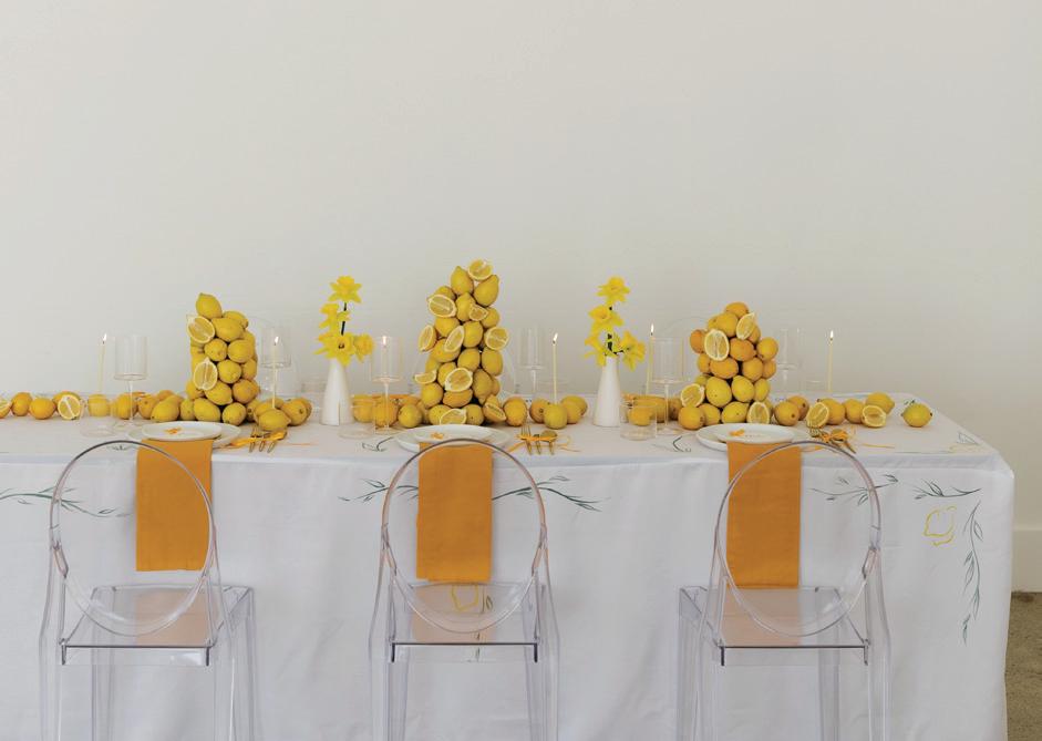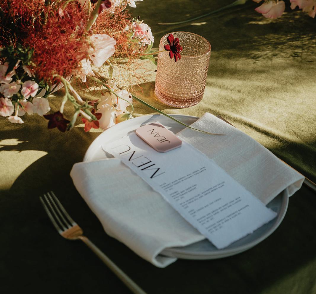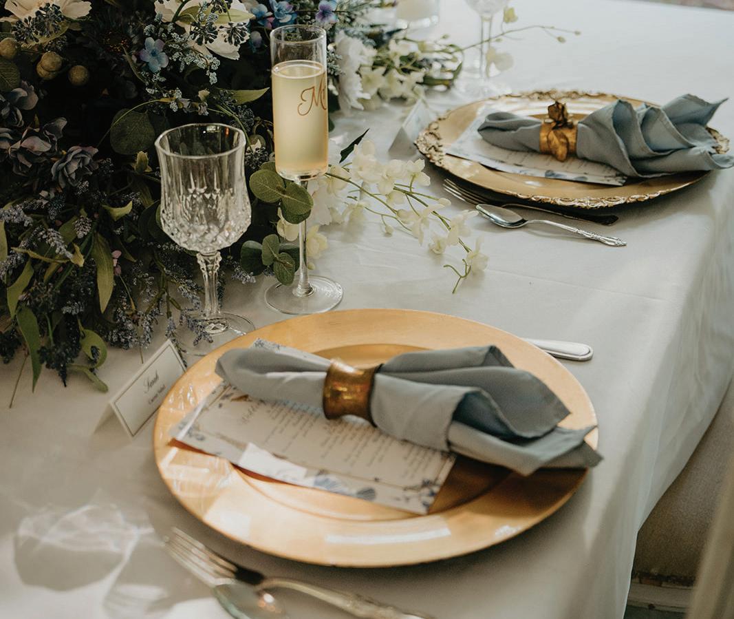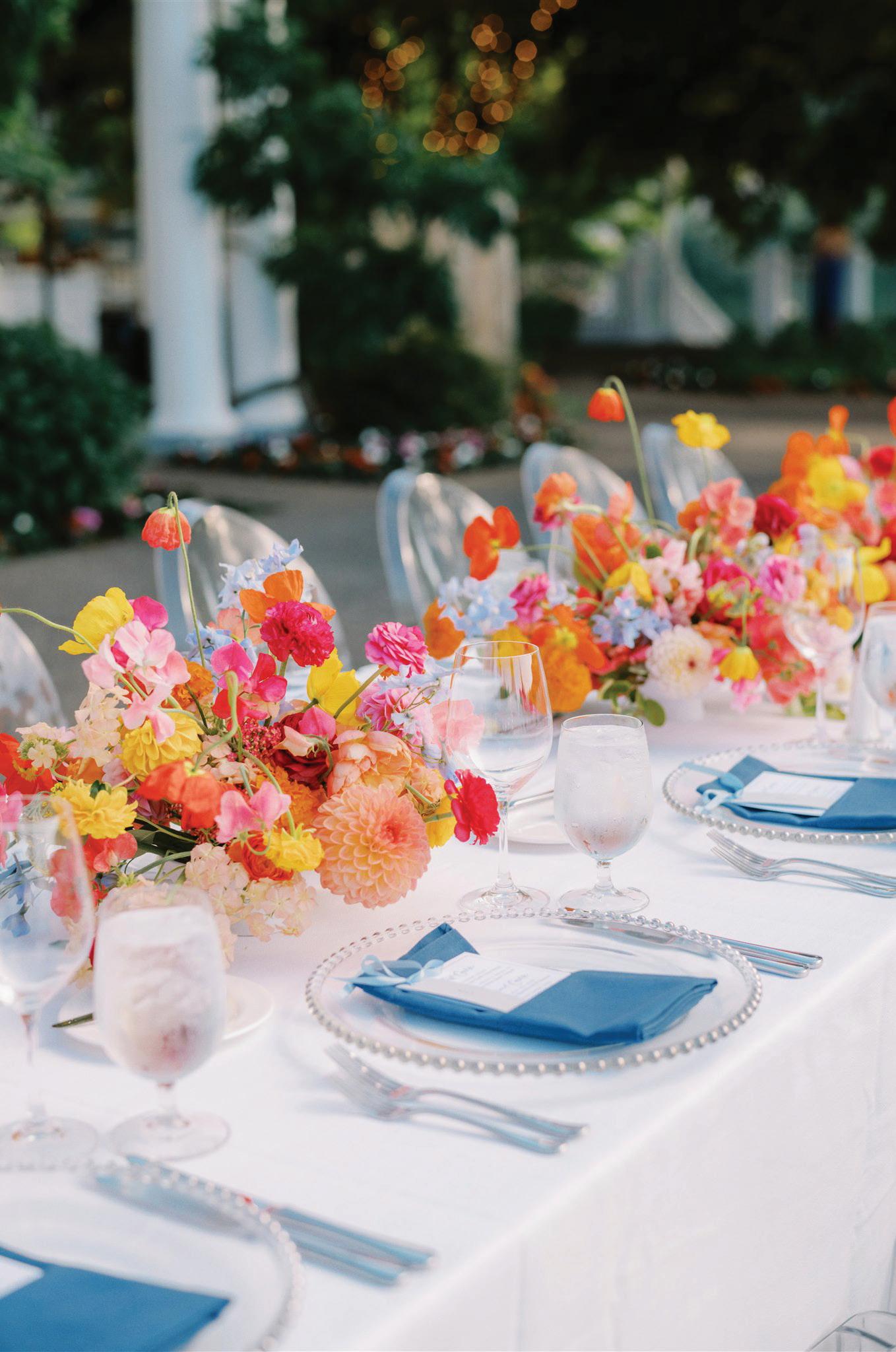 In the sweeping tablescape, a floral tree stood as the main focal point with the iconic A-frame serving as the backdrop. “This is a design that we haven’t seen before but still plays into the trend of unique floral installations,” Gloria Rice, founder of High Desert Florals notes of her creation. “The structure was to mimic a tree, its branches hanging over the tablescape. The design included not only a light contrast of tones but also preserved maple leaves in alignment with the fall theme.” —Chelsea Gibson