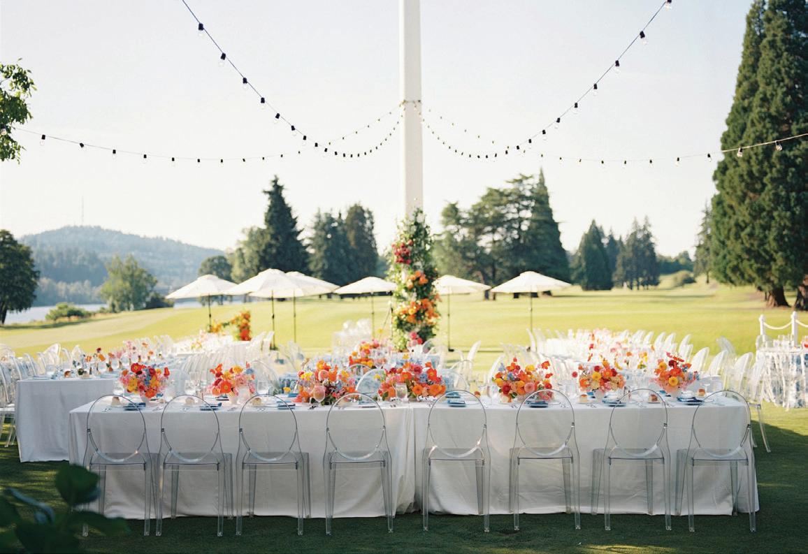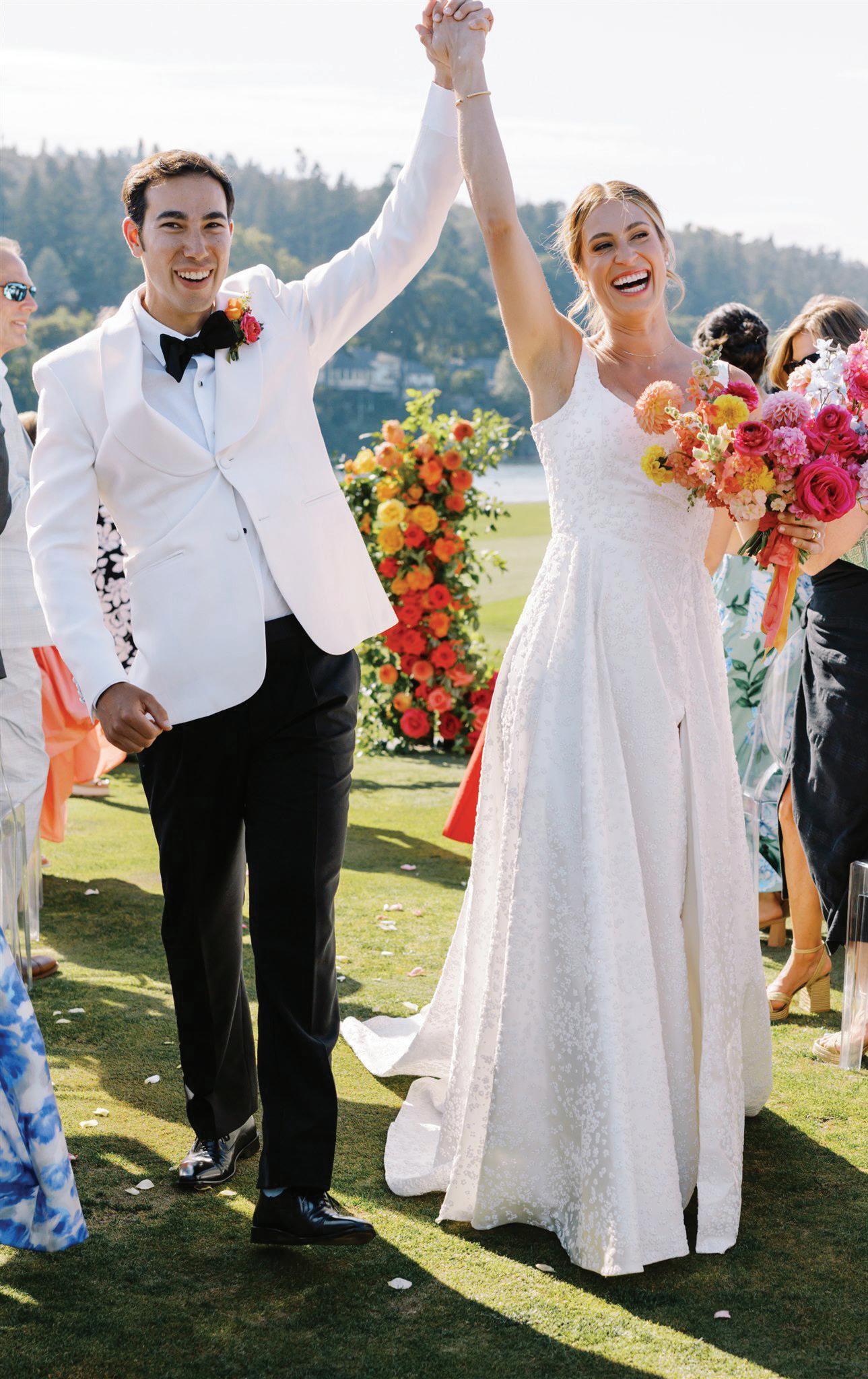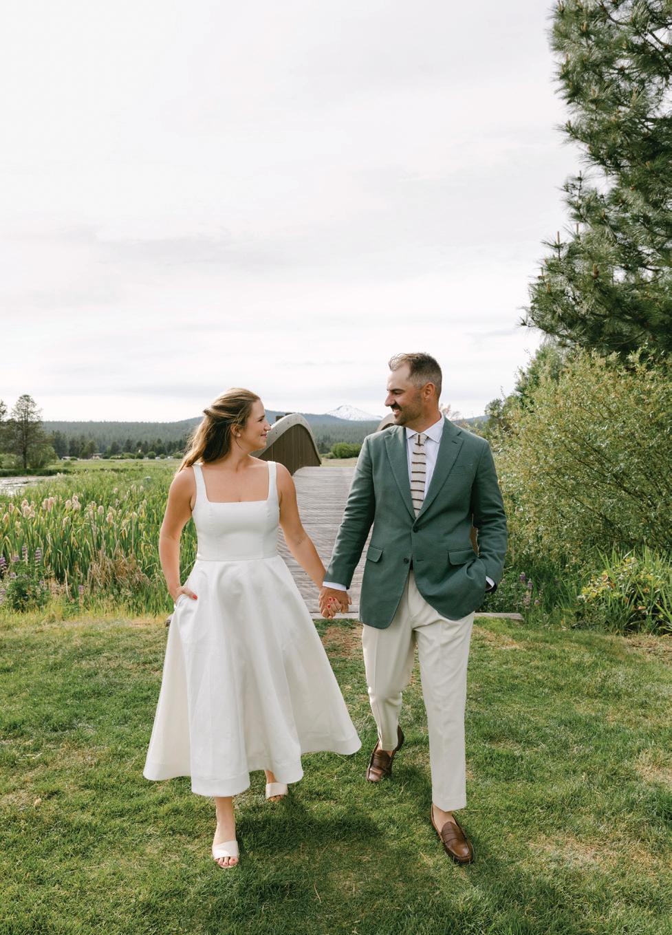 Whitney and Mitchell enjoy boating on the Willamette River in the summer months, so they knew that Waverley Country Club would be a perfect spot for their dream wedding amid blue skies, 360-degree views and boats cruising the river in the background. Their celebration was full of thoughtful details and touches from start to finish. Throughout their relationship, Mitchell has always surprised Whitney with flowers. To recall a similar feeling, Mitchell handed Whitney her bouquet during their first look on their wedding day—a sentimental, sweet moment. The groom even had a “first look” with his mom and sisters. Whitney described her floral vision as “wildflowers that met elegance,” which bounded in bright colors and textures against the verdure of the property. Wildflowers continued to a stunning cake meadow holding a classic all-white confection from Papa Haydn, a place the family would always buy special occasion cakes. When it came to the reception, the couple sought to create an unforgettable alfresco dining moment for their guests that captured the slow, easy pace of summer when you’re surrounded by loved ones with nowhere else to be. Looking back on the day, Whitney wouldn’t change a thing: “There really is no moment like walking down the aisle to marry the love of your life,” she says. “Let yourself truly be all in at that moment! You will realize nothing in the world matters other than all the love between the two of you and the support of your friends and family for your lifetime together. We would redo this day, in the same way, in a heartbeat.” —Chelsea Gibson